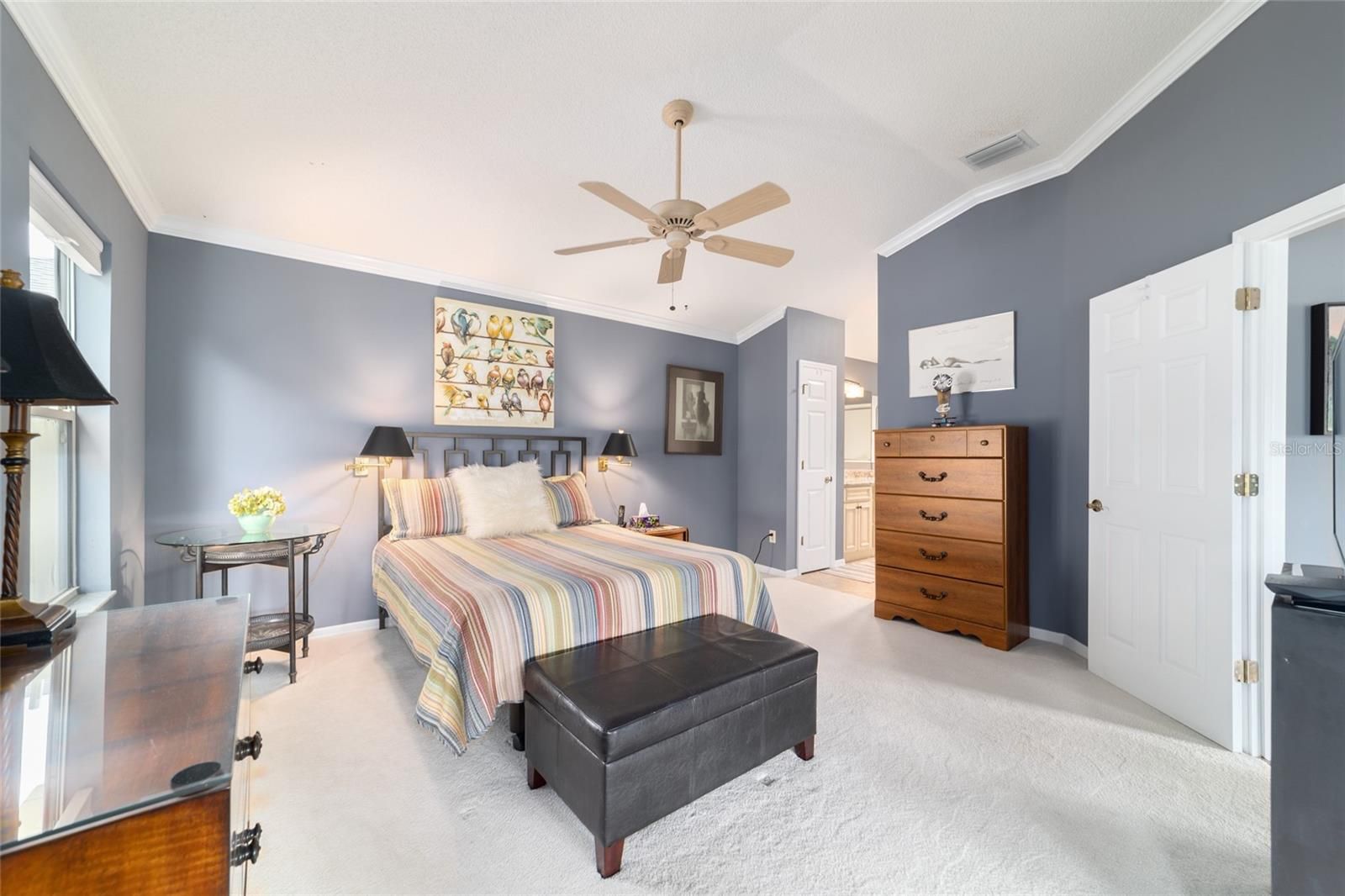 - Ceiling Fan(s), Crown Molding, Eat-in Kitchen, Living/Dining Room, Open Floorplan, Main Level Primary, Stone Counters, Walk-In Closet(s), Window Treatments
