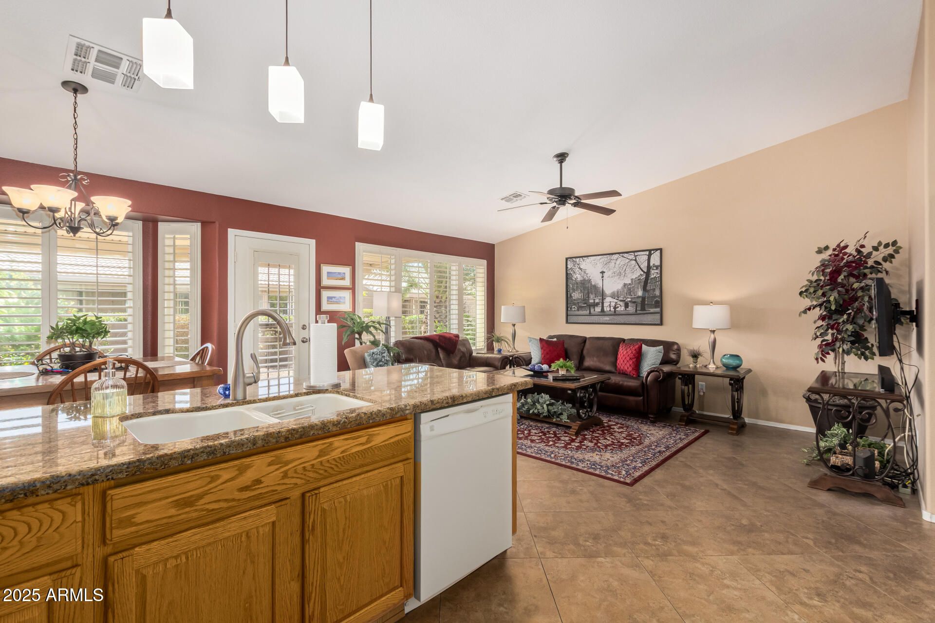This beautifully updated home has it all, plus it's located in the best Active Adult community...Springfield Golf Resort. Step inside to find 2 tone paint, shutters & tile floors throughout. Kitchen features granite counters, tile back splash & pendant lights. Open floor plan with split bedrooms making it perfect for visiting guests. Main bedroom features double sinks, updated shower & walk-in closet. Garage has lots of built-in storage cabinets. Fenced back yard with covered patio, lots of shade & mature fruit trees (meyer lemon & tangerine). Furniture available on separate bill of sale - just bring your personal items. Springfield offers a resort-style living with an 18-hole golf course, clubhouse, pickleball, tennis, billiards, pools & spa, workout facility, restaurant/bar and more.