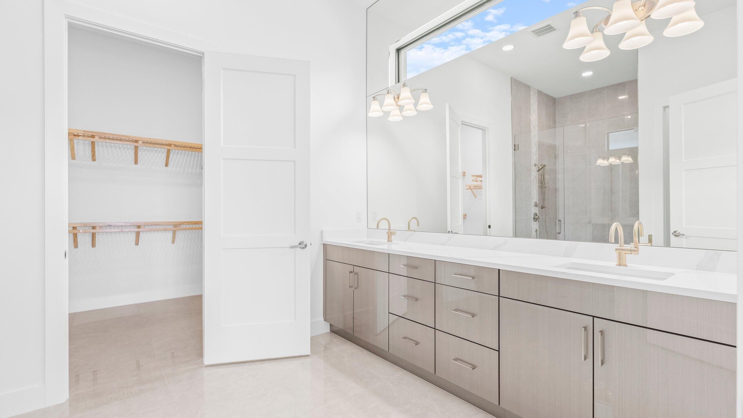 This stunning Sophia floorplan, newly completed home is perfectly situated on a southern-facing homesite within the premier 55+ community of Esprit. Offering 3 bedrooms, a Second-Story Bonus Suite, and 4.5 bathrooms, this residence blends thoughtful design with elevated livability. The upstairs bonus suite includes a full bath and walk-in closet, making it ideal for guests, multigenerational living, or a private retreat. The owner's suite and lanai have been extended an additional 4 feet, creating enhanced indoor/outdoor living. A 16-foot wide, 10-foot-tall sliding glass door seamlessly connects the great room to the lanai. The outdoor space features a privacy wall and pre-plumbing for electric, gas, and water, offering the perfect foundation for a future summer kitchen.
