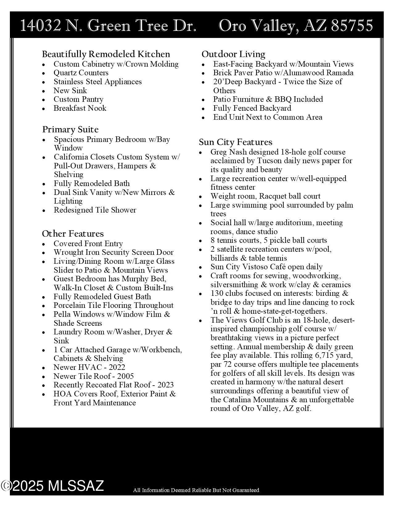 Over $100,000 in thoughtful upgrades elevate this stunning 1,185sf 2BR/2BA townhome in the sought-after Sun City Oro Valley age-restricted community. Every inch has been transformed for comfort, efficiency & modern desert living allowing you to move in and simply enjoy the lifestyle you deserve. With Exquisite Updates & Quality Finishes you'll find porcelain tile flooring throughout, custom cabinetry & quartz countertops in the kitchen & baths. Reimagined kitchen includes a relocated refrigerator for improved flow, new sink, custom pantry & linen storage. Both bathrooms have been fully remodeled, including the primary bath's double-sink vanity, redesigned shower, new mirrors, lighting & comfort-height toilets. Primary suite features California Closets custom system w/pull-out drawers,