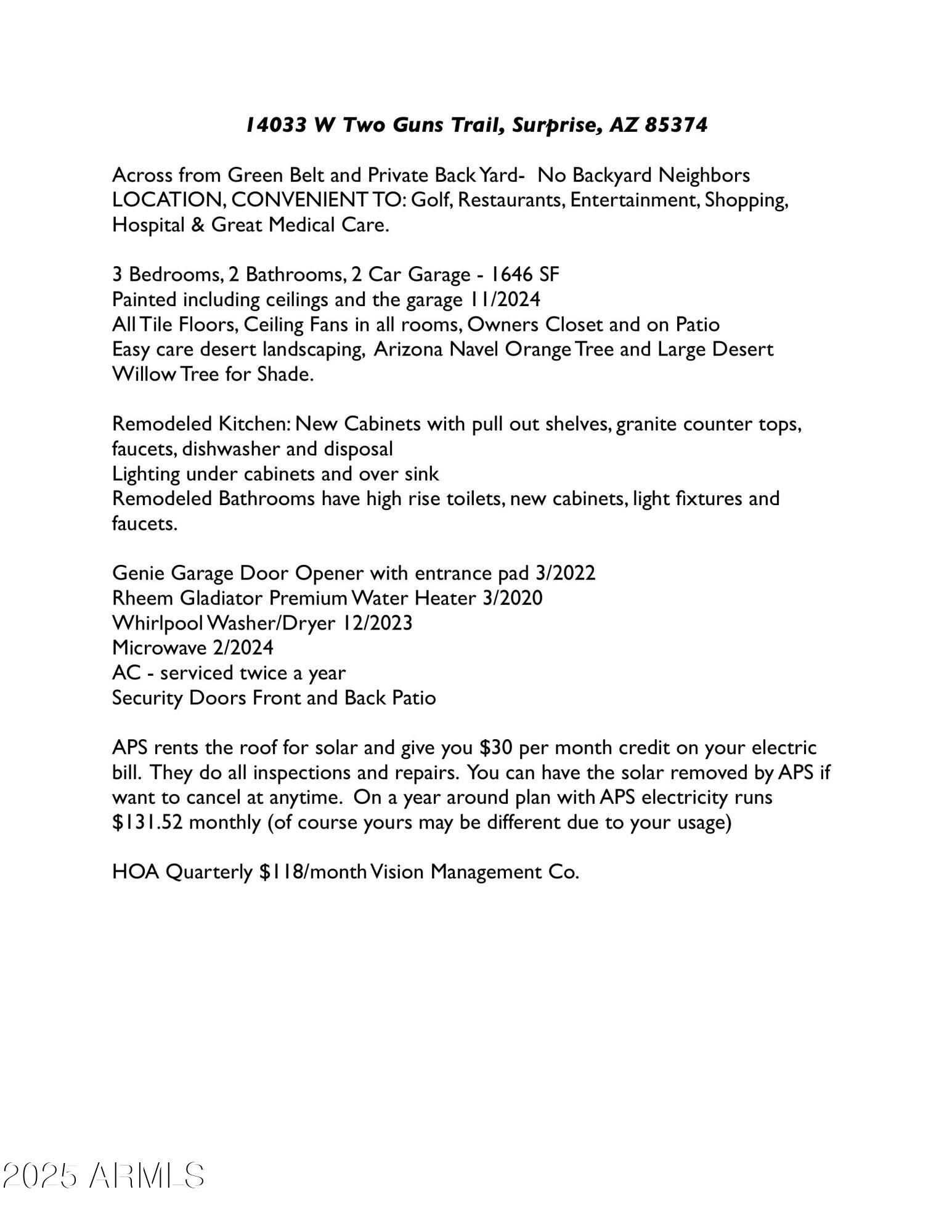 MONEY BACK PROGRAM with APS solar plan offers monthly credit of $30.00 off electric bills*Freshly painted inside*Beautiful and well-maintained home*This premium lot has no neighbors in front or back*Fantastic location is close to dining, shopping, freeways, and medical*Soaring ceilings and all tile floors*Upgraded granite counters and raised-panel cabinets in Kitchen and baths*Your kitchen includes under counter lighting, pull-out inserts in cabinets and two counters for bar stools, as well as bright open breakfast room* Newer washer, dryer, water heater, microwave, and garage door opener*You will have insulated garage doors*Easy care desert landscaping with navel orange tree, desert willow tree and covered patio with extended pad to enjoy your outdoor barbecues*Welcome Home!