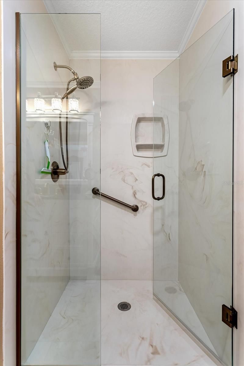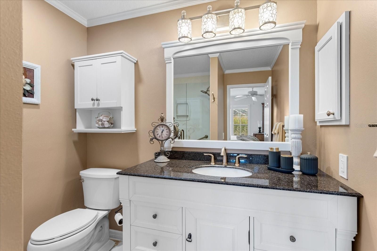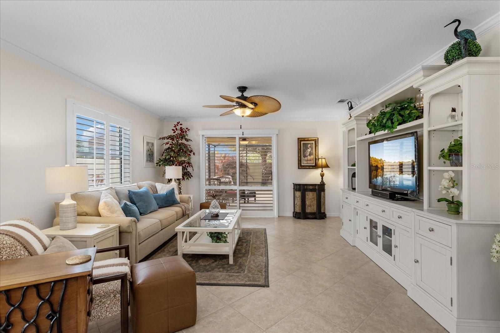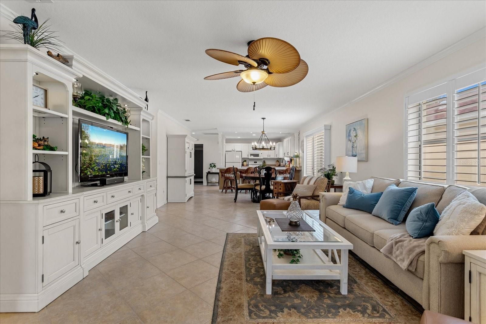 - Ceiling Fan(s), Crown Molding, Living/Dining Room, Open Floorplan, Main Level Primary, Solid Surface Counters, Solid-Wood Cabinets, Stone Counters, Thermostat, Vaulted Ceiling(s), Walk-In Closet(s), Window Treatments