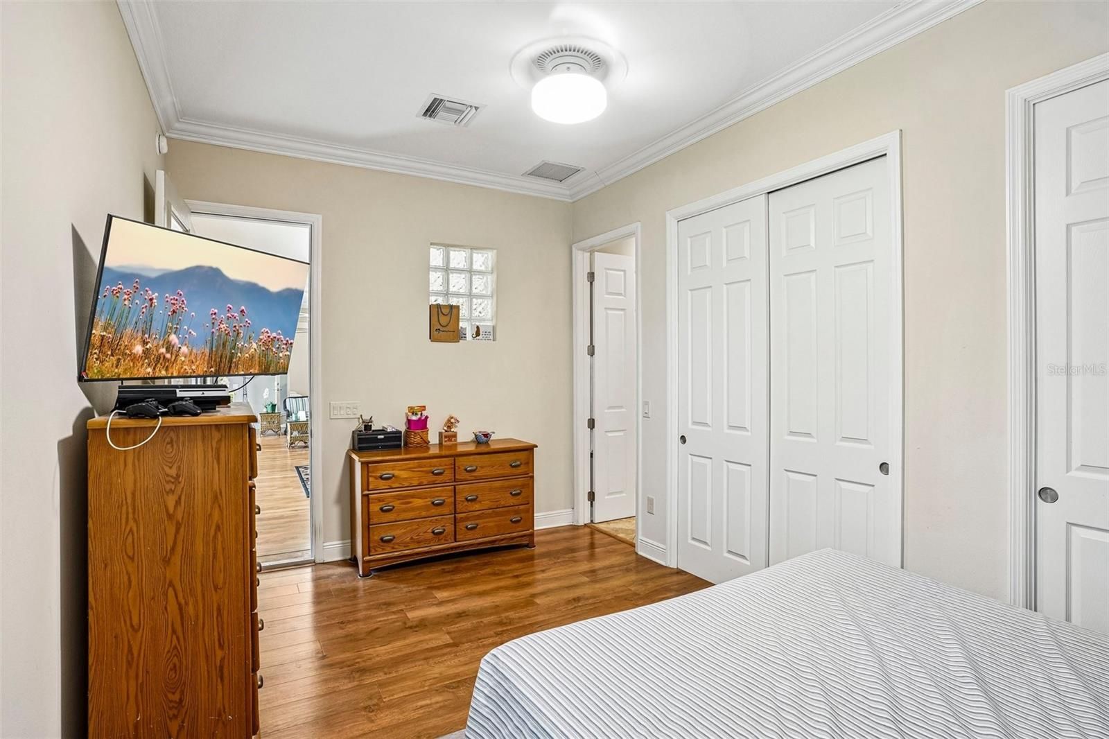 - Ceiling Fan(s), Crown Molding, Eat-in Kitchen, High Ceilings, Open Floorplan, Solid Surface Counters, Solid-Wood Cabinets, Split Bedrooms, Thermostat, Walk-In Closet(s), Window Treatments
