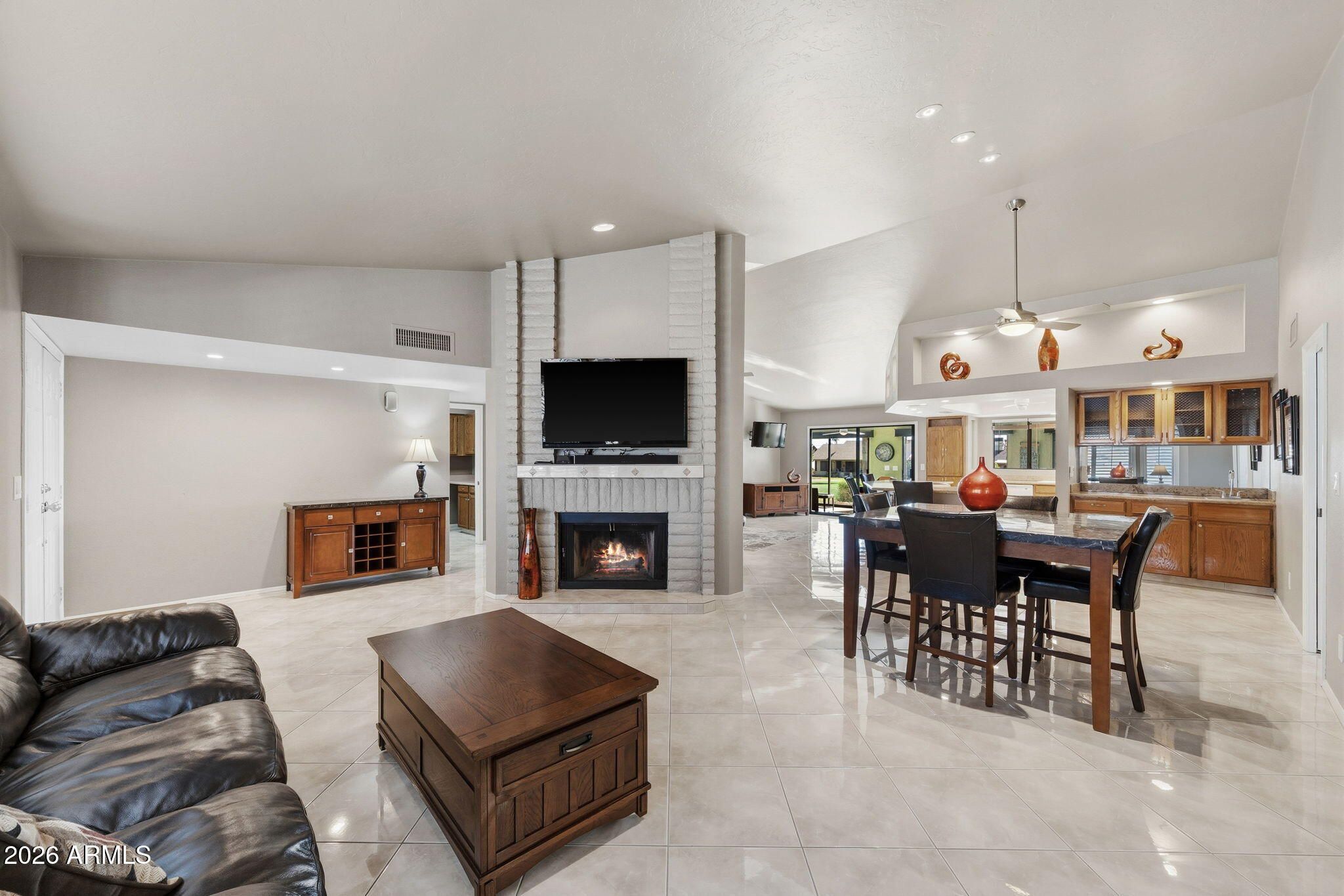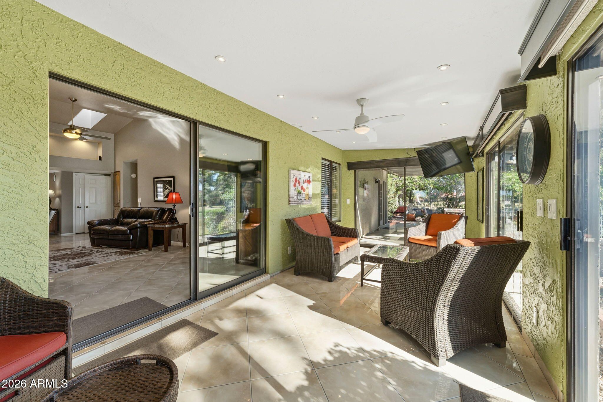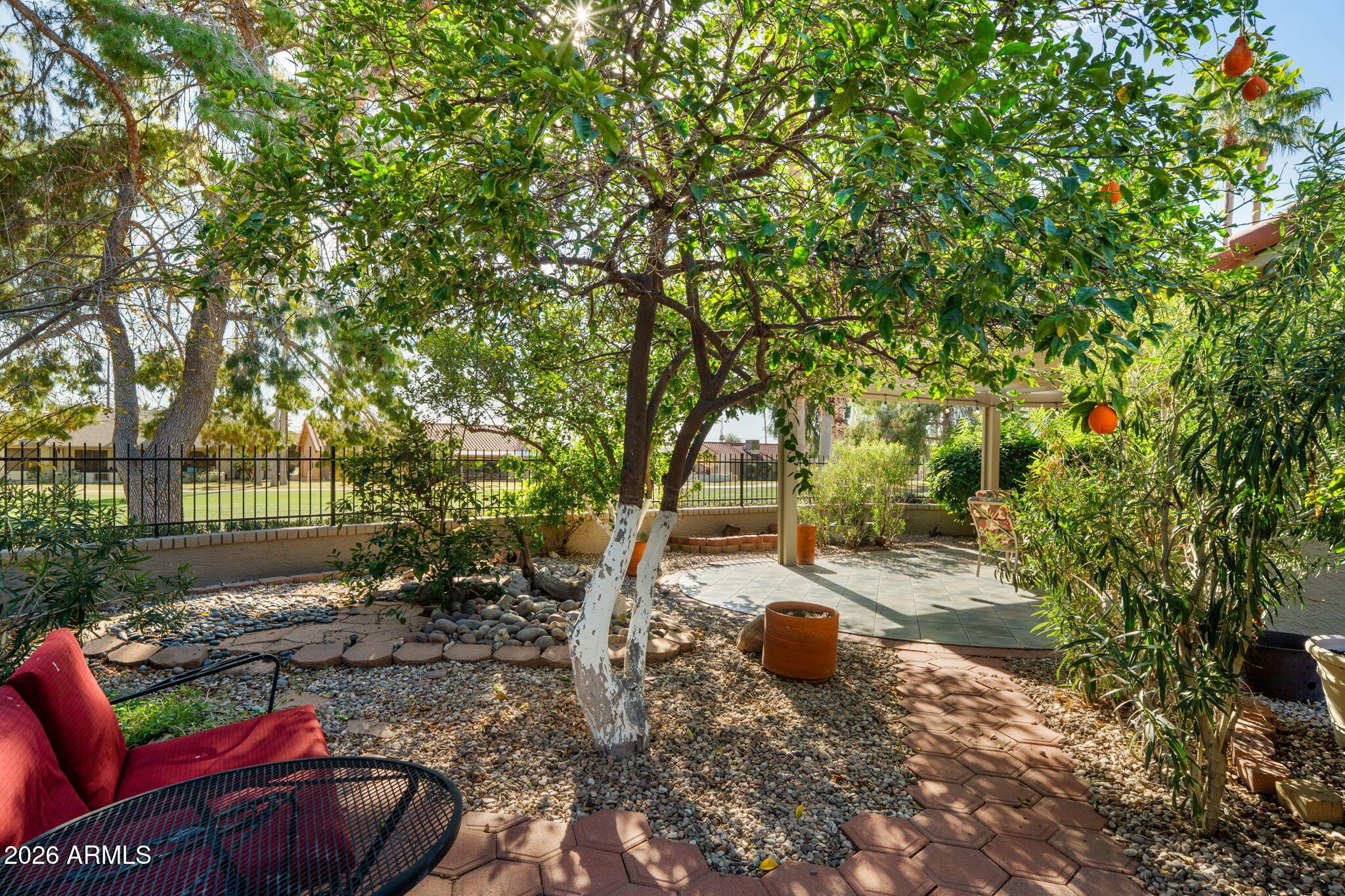 Welcome to this Beautifully Updated, Split Floor Plan home with 3-Bedrooms, 2-Baths and a 3-Car Garage! The attractive entrance is a welcome greeting into this open and spacious home with vaulted ceilings. Enjoy the Large Entertainment Style Kitchen with an amazing island, granite countertops, JennAir Stove and views to the golf course. The Huge Primary Ensuite has a full-length closet, extra wall of storage cabinets, Walk-in Shower and private water closet. The enclosed full length Arizona Room is perfect for Entertaining, relaxing or use as a work/craft/studio area. Two AMAZING fully fenced patios on each side of the home are the perfect, quiet, private relaxation spots as well as the Hot Tub area! The 3rd Car Garage can house 2 Golf Carts or car. Being sold furnished including hot tub!
