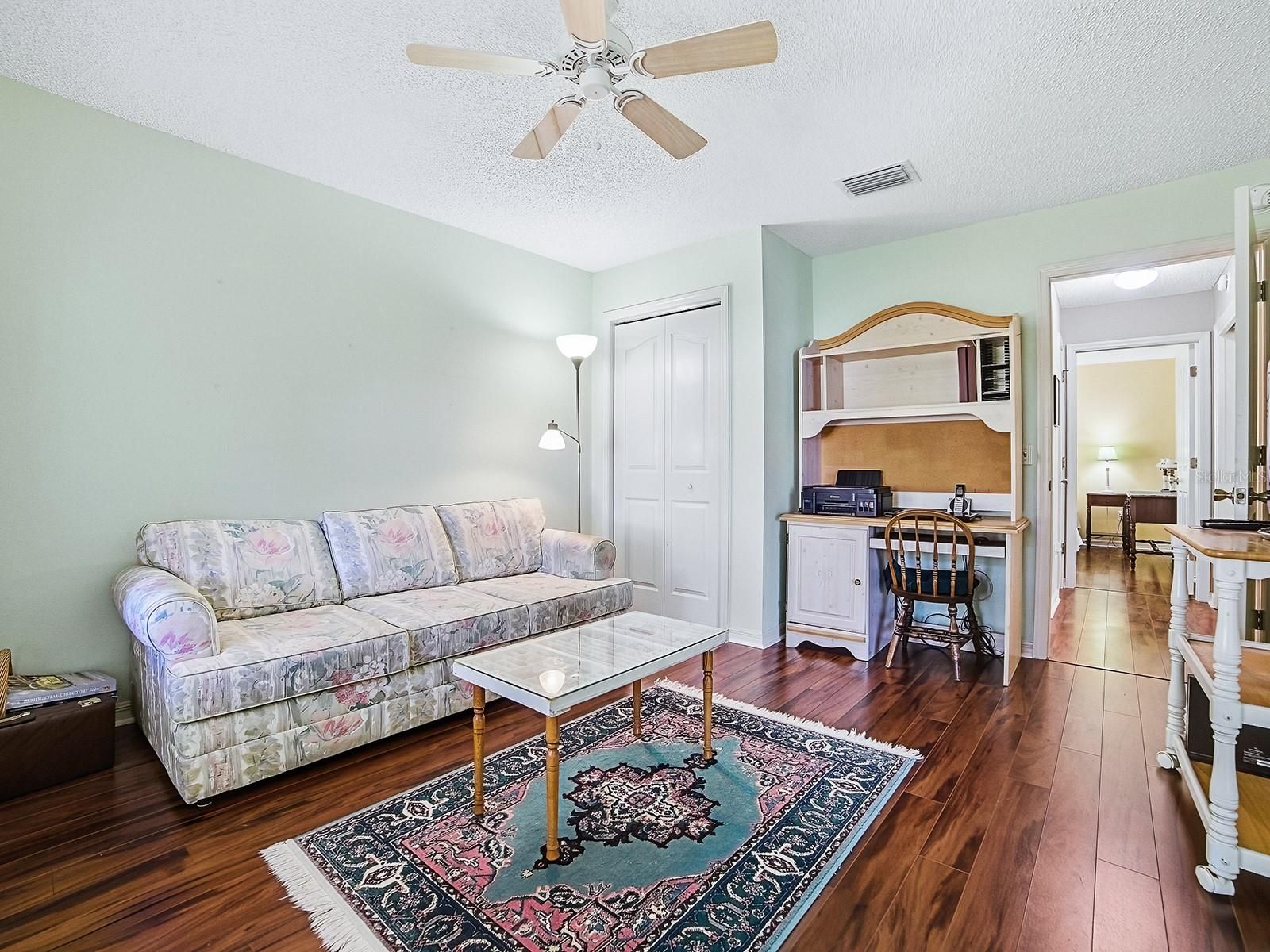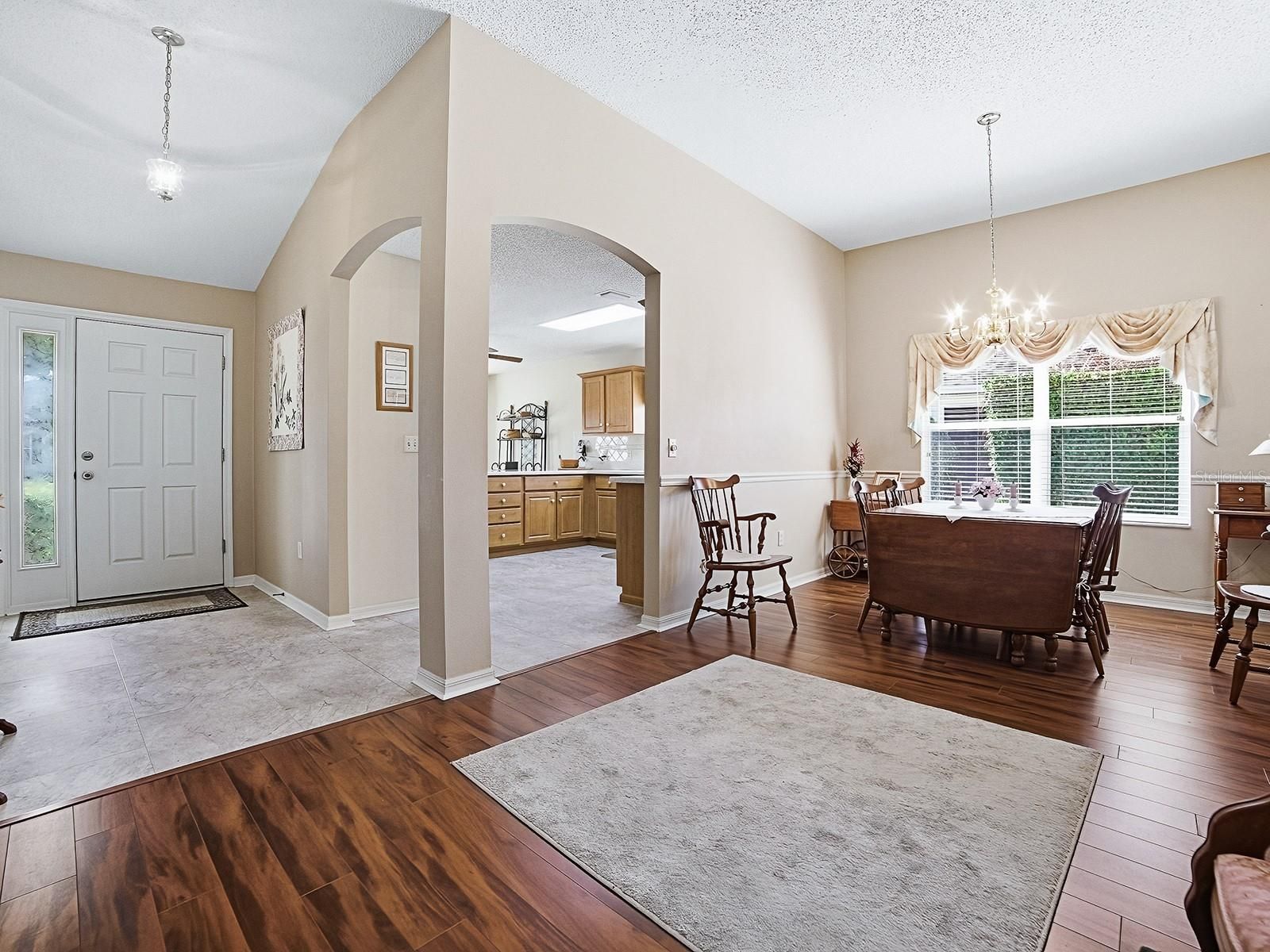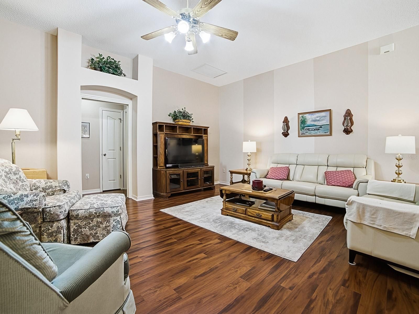 NO BOND! Don’t miss this lovely 3-bedroom, 2-bath Lafayette (Cypress) Designer home ideally located in the sought-after Village of Santiago. With wonderful curb appeal and a welcoming front porch, this home makes a beautiful first impression. The stamped driveway and walkway, along with the low-maintenance landscaping, enhance the exterior charm and set the tone for what awaits inside. Step through the front door and immediately notice the 10 FT CEILINGS that create an open, airy feel throughout the main living areas. The home features laminate and vinyl flooring throughout, NO CARPET, offering both style and easy maintenance. The spacious living room flows seamlessly into the dining area, creating a comfortable and inviting space for entertaining family and friends. The bright and functional kitchen offers Corian countertops, a GAS range, a convenient breakfast bar, abundant cabinetry, and a casual dining area highlighted by bay windows that fill the space with natural light. The popular split-bedroom floor plan provides privacy for both homeowners and guests. A pocket door separates the guest wing, which features two generously sized bedrooms, one with access to the enclosed lanai, and a full guest bath, making it ideal for overnight visitors or even a home office setup. The primary suite is spacious and comfortable, featuring two walk-in closets and an en-suite bath with dual sinks and an updated walk-in shower. The highlight of the home, just off the main living area, is the large ENCLOSED LANAI (sunroom). This lovely space provides the perfect place to relax, whether you’re enjoying your morning coffee or unwinding with an evening beverage. Additional features include an inside laundry room with extra space for storage or a small desk area, an extra-long 2-car garage with epoxy floors, GOLF CART INCLUDED, Attic pull-down stairs for additional storage, a ROOF in 2019, HVAC in 2024, and a WATER HEATER in 2016. Living in the Village of Santiago means enjoying easy access to exceptional amenities. The closest sports pool is also nearby, and Saddlebrook Recreation Center offers the nearest adult pool. The nearby El Santiago Recreation Center offers a pool and activities including bocce, tennis, pickleball, and shuffleboard. Golf enthusiasts will appreciate the El Santiago and El Diablo executive golf courses, while Glenview Country Club is just down the road for championship golf, tennis, and dining. For entertainment and events, the Savannah Center hosts a wide variety of shows and performances. Come see why this home is right for you!