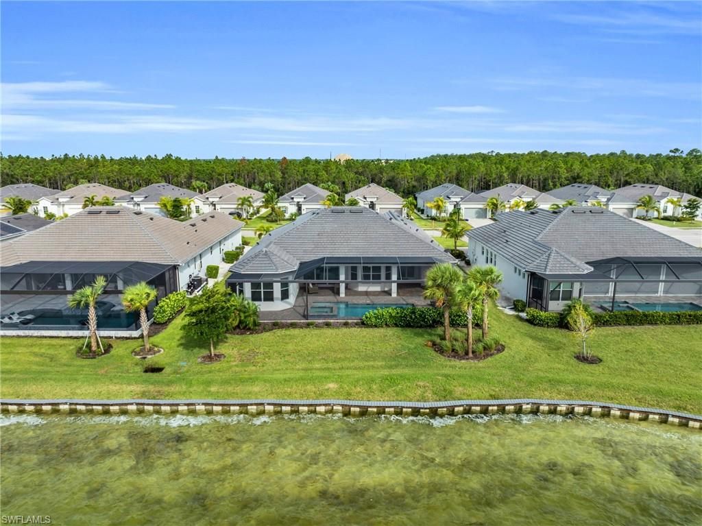 Luxury Lakefront Living in Vista WildBlue – 4 Bedrooms, 3 Baths with Panoramic Water Views! Experience the pinnacle of resort-style living in this exquisite lakefront residence located in the highly coveted Vista WildBlue community. This elegant 4-bedroom, 3-bath home with a 3-car garage showcases a thoughtfully designed open-concept floor plan that seamlessly blends sophisticated interiors with breathtaking outdoor living. From the moment you step inside, you are greeted by expansive living spaces and sweeping panoramic views of the spectacular 225-acre boatable lake. The heart of the home is the gourmet chef’s kitchen, beautifully appointed with high-end stainless steel appliances, Quartz countertops, a generous center island, and abundant cabinetry—perfect for both everyday living and entertaining on a grand scale. The outdoor living area is nothing short of exceptional. Step onto the spacious screened lanai featuring a sparkling pool and spa, a fully equipped outdoor kitchen, and ample seating areas ideal for alfresco dining or simply relaxing while taking in the tranquil lakefront scenery. This private oasis offers the perfect backdrop for sunsets, gatherings, and peaceful moments of retreat. The luxurious primary suite is a serene sanctuary overlooking the pool and lake, complete with direct access to the lanai. The spa-inspired en-suite bath boasts an oversized walk-in shower, a large dual-sink vanity, and refined modern finishes. Three additional bedrooms and two beautifully appointed guest baths provide comfort and privacy for family and guests alike. Beyond the home, residents of WildBlue enjoy an unparalleled lifestyle with world-class amenities, including a state-of-the-art fitness center, resort-style pool, lap pool, pickleball and tennis courts, basketball courts, bocce ball, a poolside bar and grill, a man-made beach, and a community boat ramp for easy access to the lake. Ideally located just minutes from RSW International Airport, this home is also close to premier shopping, dining, and entertainment destinations. This exceptional lakefront property offers the perfect blend of modern luxury, comfort, and resort-style amenities—delivering an extraordinary lifestyle in one of Southwest Florida’s most desirable communities.