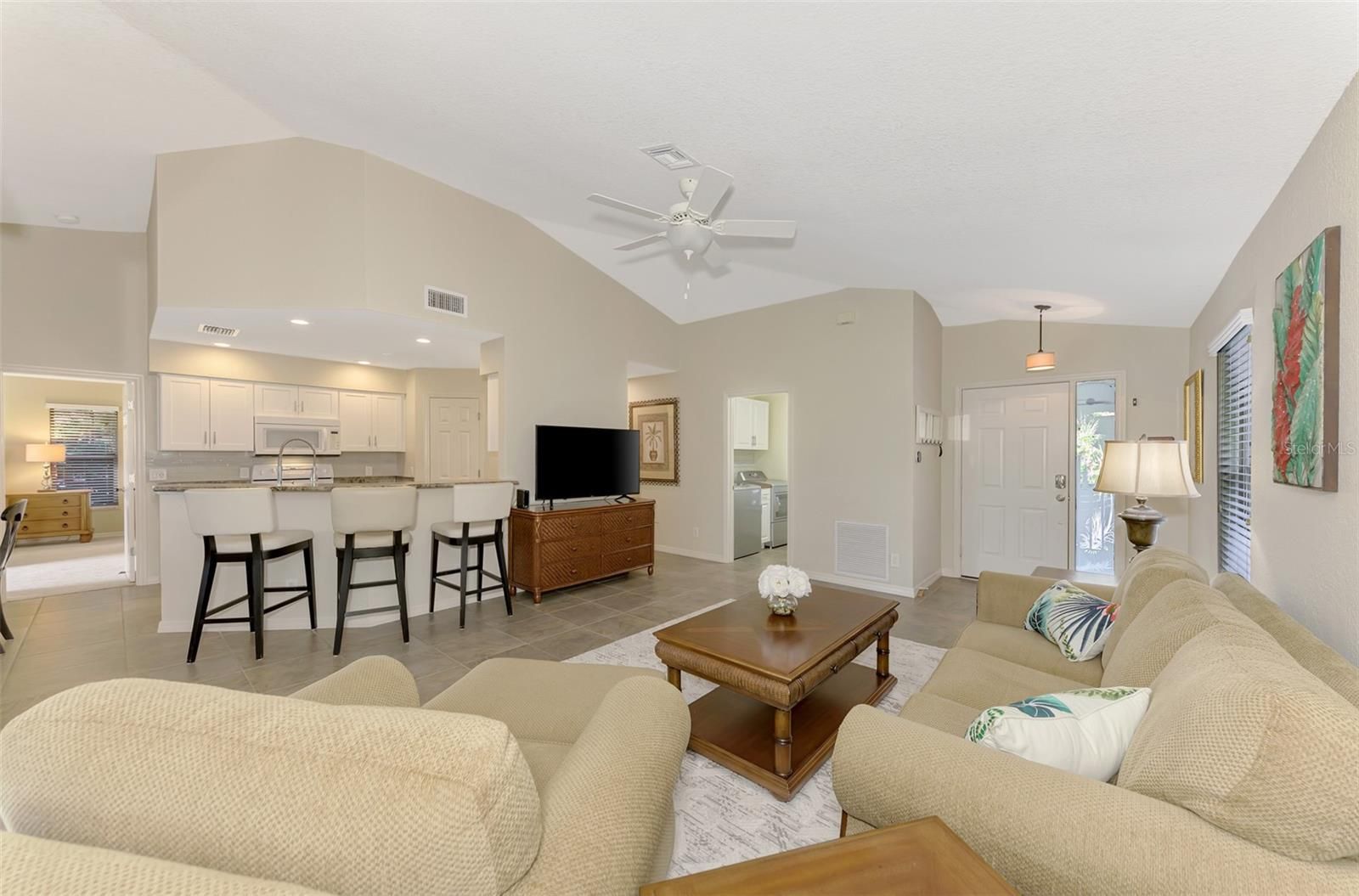 Experience Carefree Living at Its Best by owning this well-maintained, turnkey furnished second-floor condominium in the coveted Riverwood community. This move-in-ready 2-bedroom, 2-bathroom condo, conveniently located across the street from the Willow Glen private community pool, offers a serene escape and features recent quality updates, including fresh paint, a new roof (2022), a water heater (2020), and a high-efficiency heat pump A/C system (2023) controlled by a Wi-Fi-enabled Ecobee thermostat. Beautiful tile floors extend throughout the great room, kitchen, dining area and the expansive screened lanai. Step through a wall of sliding glass doors to the lanai and enjoy tranquil sunsets overlooking the 9th green. Whether dining al fresco, relaxing with friends, or simply soaking in the peaceful ambiance, this space perfectly complements the Florida lifestyle. Golf enthusiasts will appreciate the proximity to the clubhouse, just steps away, offering easy access to the course and on-site dining. The kitchen is a chef’s delight, featuring a Kenmore Elite refrigerator, smooth-top stove, microwave, and dishwasher. Granite-like countertops, soft-close cabinetry and an oversized pantry seamlessly blend style and functionality. The master suite serves as a serene retreat, complete with a king-sized bed, large-screen TV, and an ensuite bath featuring dual sinks, a glass-enclosed shower, and a spacious walk-in closet. A second well-appointed bedroom and nearby full bathroom ensure comfort and privacy for your guests. The updated laundry room, equipped with a high-efficiency washer and dryer, offers ample storage with additional cabinetry. The attached one-car garage includes built-in cabinetry and a workbench, while a lockable storage room on the ground floor adds extra utility. Nearby, the recreation center includes an Olympic-sized pool, fitness center, tennis and pickleball courts, dog park, library, craft room, and an outdoor meeting space, ideal for community events or private gatherings. Living in Riverwood means more than owning a home—it’s embracing a lifestyle. The award-winning Riverwood Golf Club, named Golfer’s Choice 2021 #1 Florida Course and one of the Top 15 U.S. Courses by Golf Advisor, is a centerpiece of the community. Residents also enjoy access to the Riverwood Private Beach Club on Manasota Key (memberships subject to availability). With over 300 acres of preserves, wetlands, ponds, and lakes, Riverwood’s dedication to nature and conservation creates a serene and picturesque setting. Designated as an Audubon Green Community, it showcases the natural beauty of Southwest Florida. Perfectly situated, this property is close to Gulf Beaches, Charlotte Harbor, the Myakka River, and vibrant destinations like Punta Gorda, Englewood, Venice, and Boca Grande. Sports fans will love the proximity to the Tampa Bay Rays and Atlanta Braves Spring Training facilities. This turnkey property is a rare gem that won’t last long. Don’t miss your opportunity to own a slice of tropical paradise—schedule your showing today!