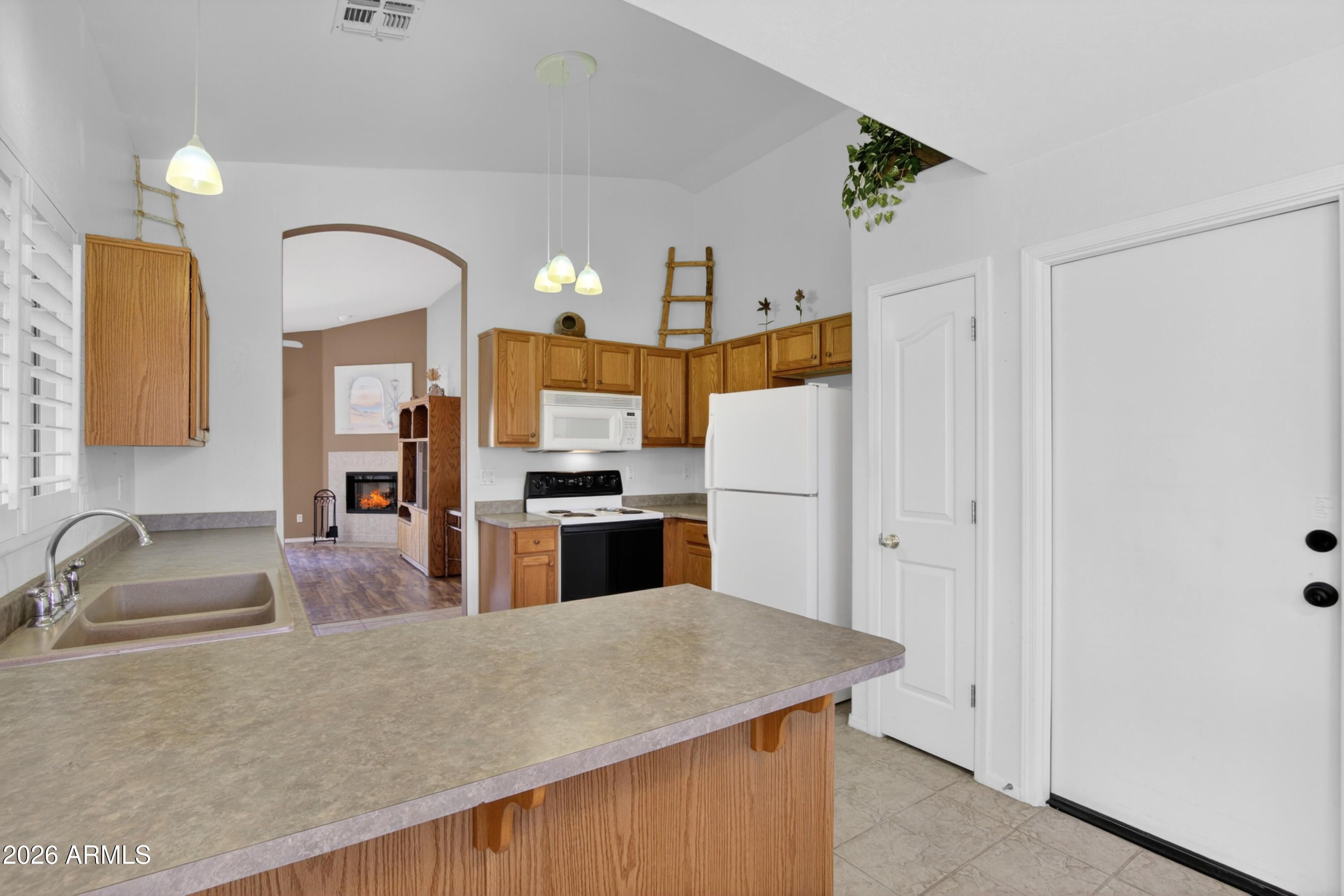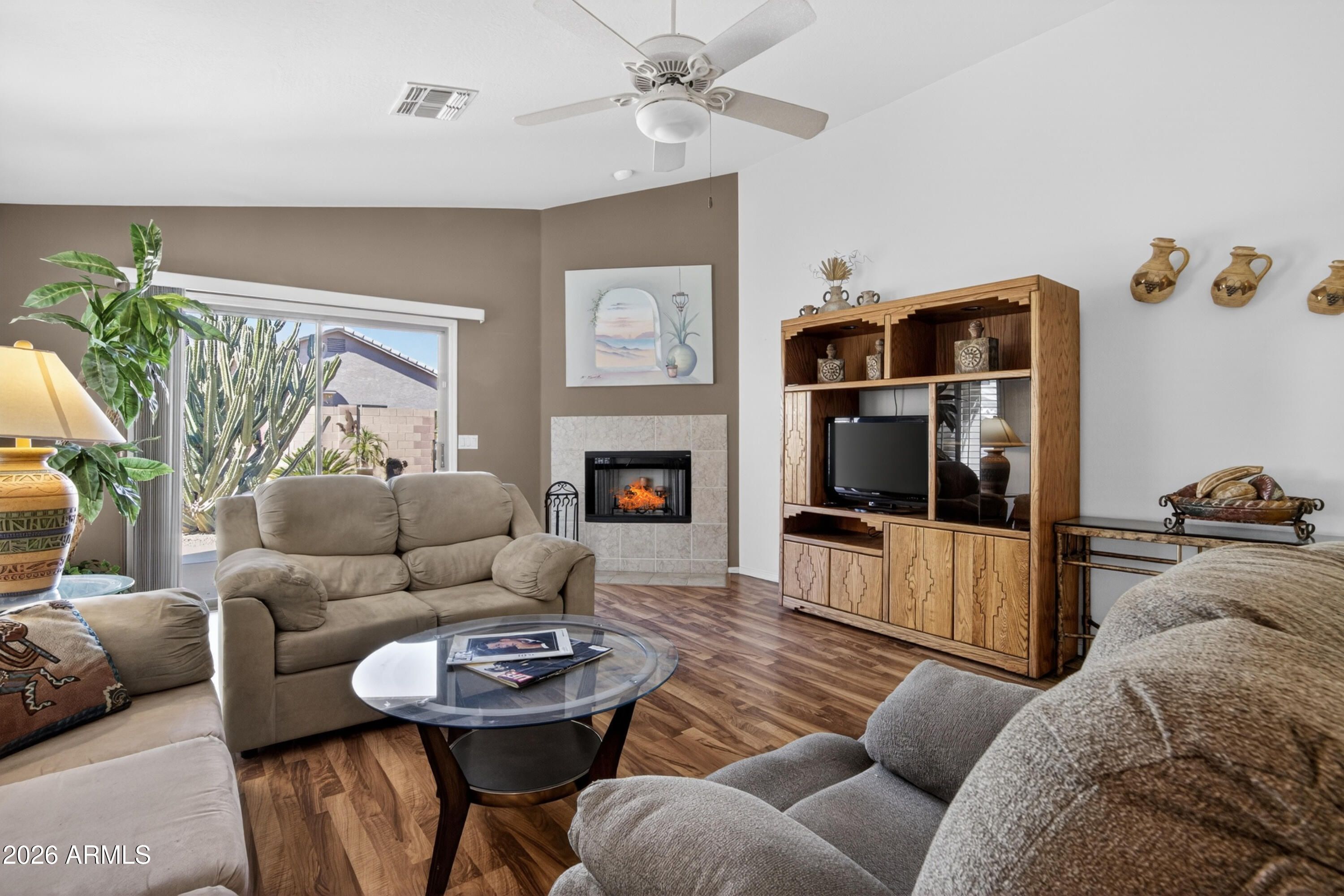Step into this beautifully maintained 3BR, 2BA 2-car garage home located in the Litchfields Subdivision in Surprise. This fabulous home features a spacious great room with vaulted ceilings, a cozy fireplace, and abundant natural light. The eat-in kitchen flows seamlessly into the main living area, perfect for everyday living and entertaining. Enjoy tile and laminate flooring throughout--no carpet--and shutters on all windows in the great room, kitchen, and primary bedroom. The generous primary suite offers a walk-in closet and walk-in shower. Additional highlights include ceiling fans in every room and an inside laundry room with overhead cabinetry. Outside, a north/south facing lot features a spacious backyard with a covered patio and a block wall for extra privacy. Very close to nearby restaurants, grocery stores, shopping and a Home Depot. Make sure to see this home today!