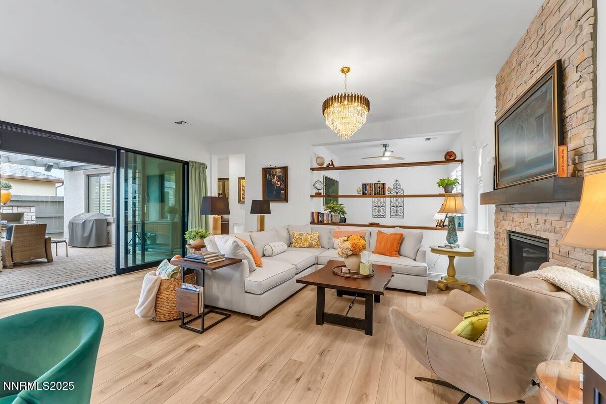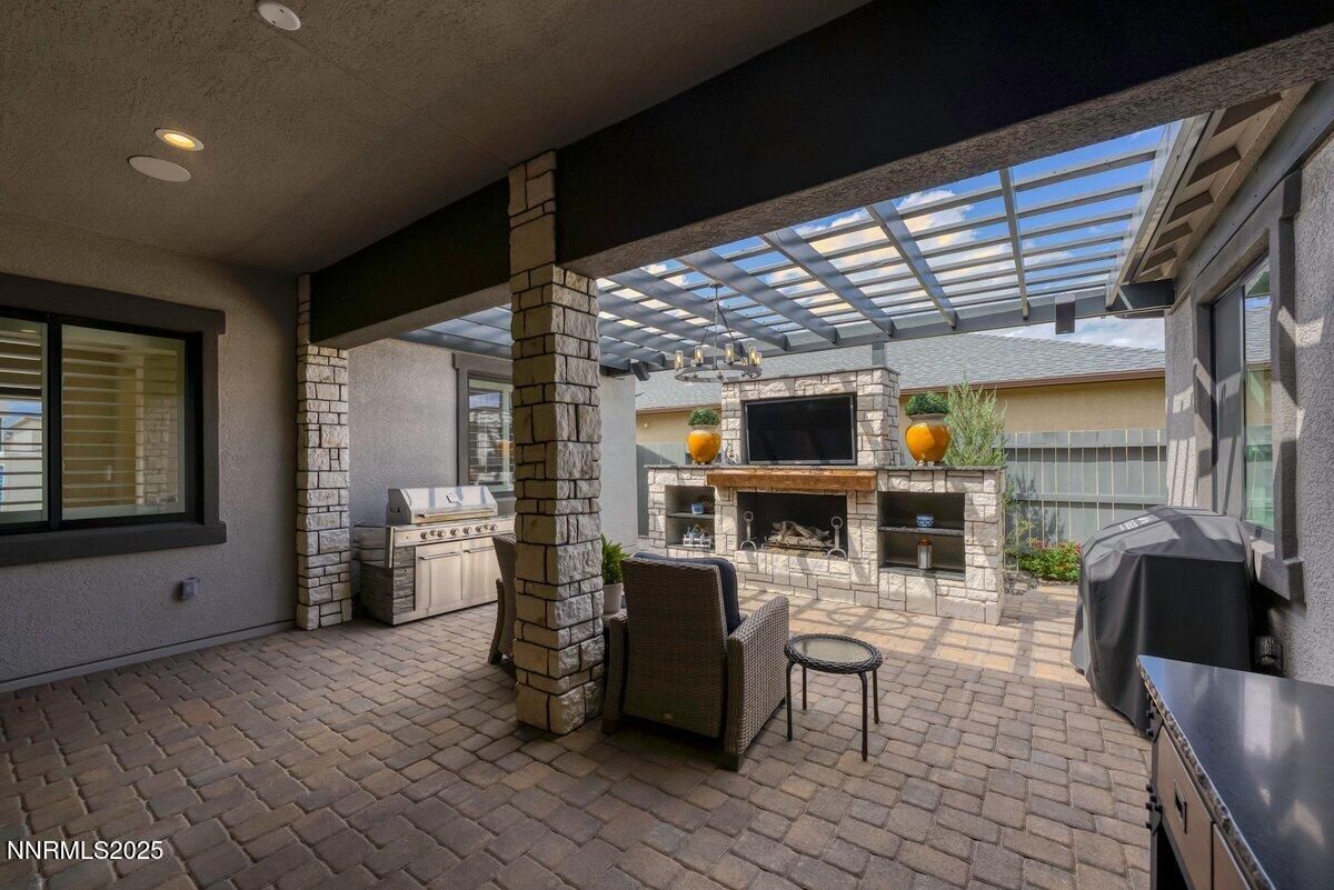 **See the Virtual Tour for a complete video walkthrough.** Welcome to your dream home in Regency at Caramella Ranch, Reno's premier 55+ gated community! This stunning Quincy model two-bedroom, two-bath residence with a versatile office/flex room offers luxury living featuring nearly 150,000 dollars in upgrades (please see documents tab for list of upgrades). Securely situated behind guarded gates, the neighborhood provides peace of mind and access to resort-style amenities including pools, fitness classes, clubs, live entertainment, and more. Step inside to an open-concept floor plan featuring luxury vinyl plank flooring, soaring ceilings, and custom lighting throughout. The gourmet kitchen is a showstopper with a waterfall Quartzite island, upgraded cabinetry with ceiling-height finishes, JennAir cooktop, built-in microwave and an oven, and a spacious walk-in pantry with slide-out drawers. Entertain with ease as the kitchen flows into the dining room and great room, complete with a stacked stone fireplace in the great room, walnut shelving, a slide glass patio door that opens to your private backyard retreat complete with a surround sound system featuring Sonos Amps and a subwoofer in both the great room and the patio. Outdoor living is unmatched here, enjoy a covered paver patio, pergola, modern gas fireplace, and wall-mounted TV, low maintenance lawn with programable sprinkler system and an outdoor shed set on a durable paver floor. The primary suite boasts a spa-inspired shower with dual sinks and a custom Nevada Closets system, while the secondary bedroom offers comfort and privacy for guests. A flexible room makes the perfect office, library or hobby room. Additional features include plantation shutters, sleek celling fans, laundry room cabinetry, water softener, epoxy-coated garage floor with built-in cabinets, additional interior and exterior WI-FI access points and a home security system. The kitchen refrigerator conveys with the home. Caramella Ranch Regency offers an active lifestyle with social clubs, community events, resort-style clubhouse with indoor & outdoor pools, jacuzzi, fitness center, tennis, pickleball, bocce ball and so much more!