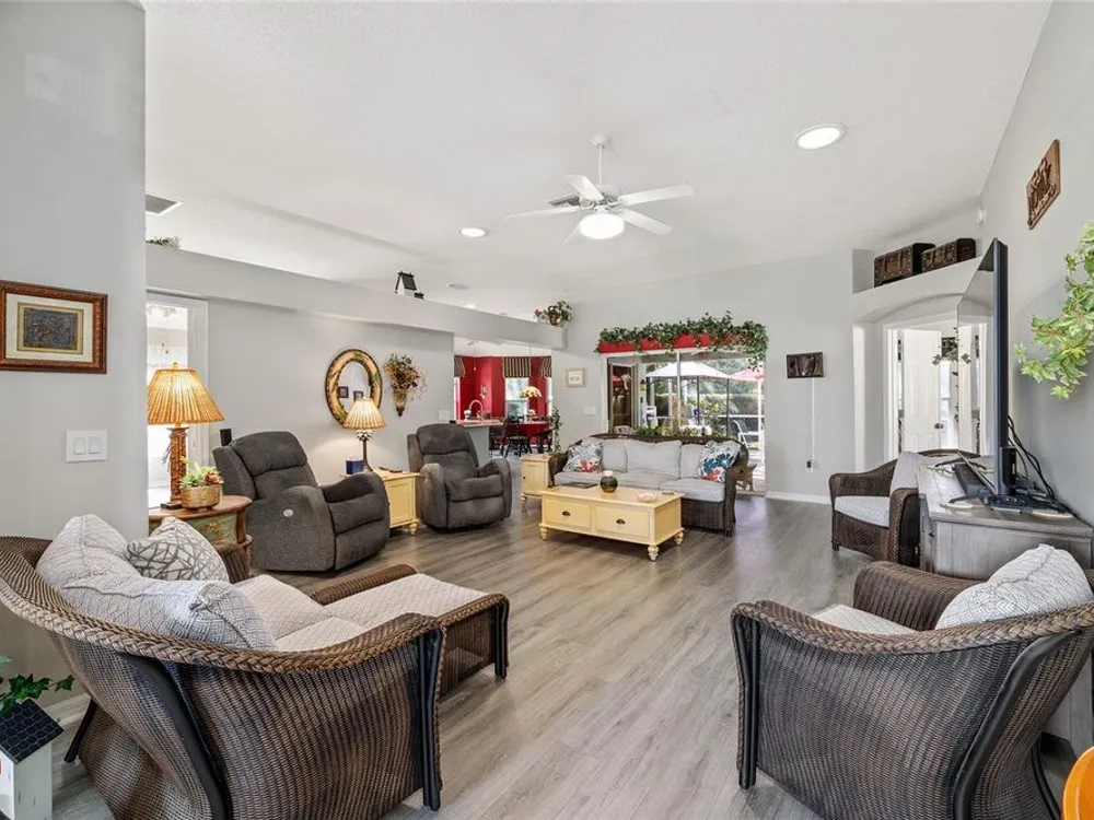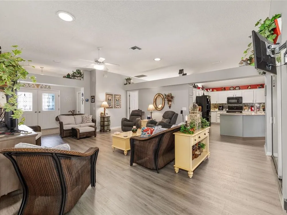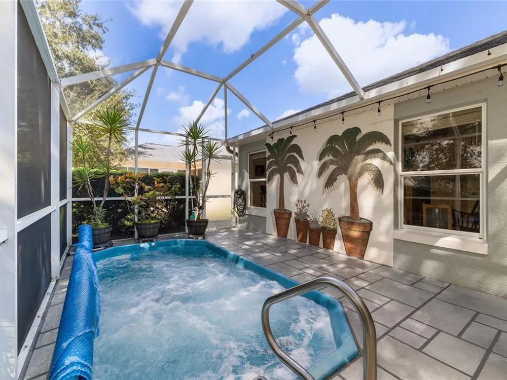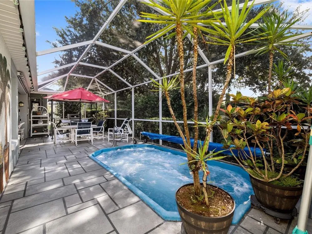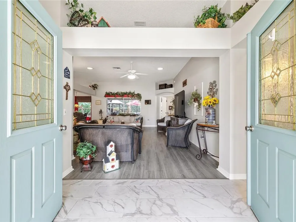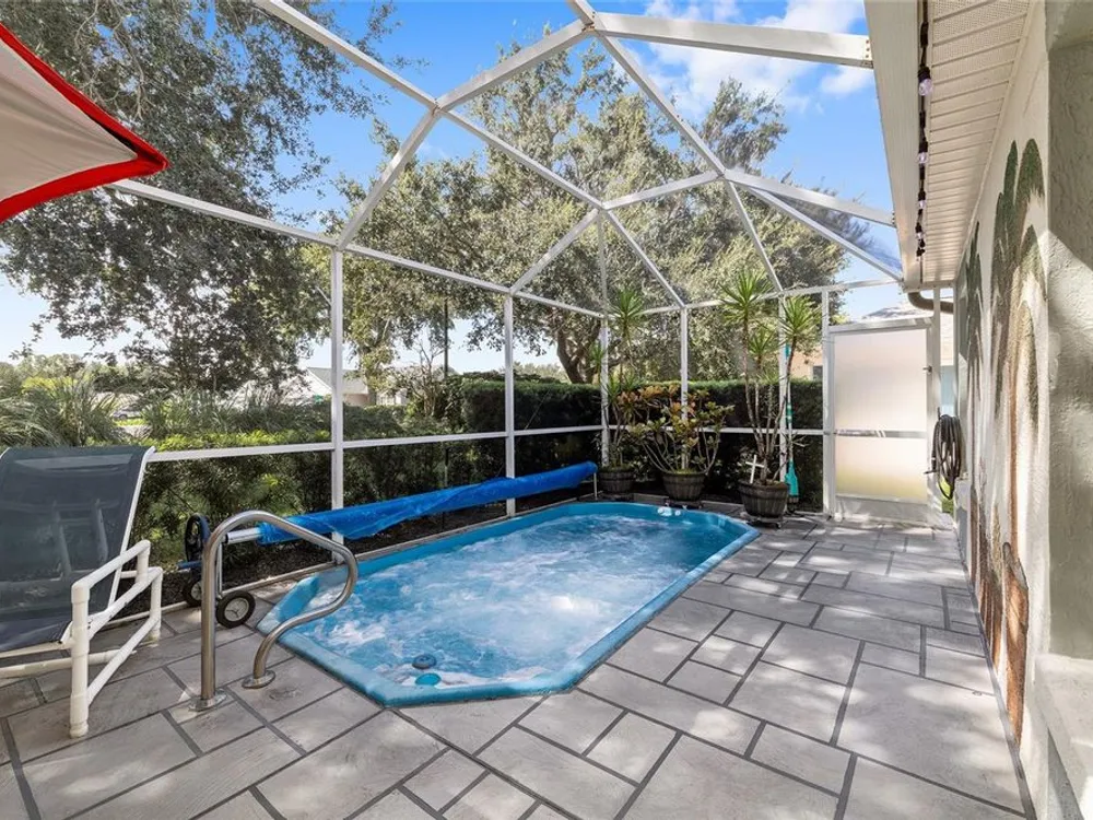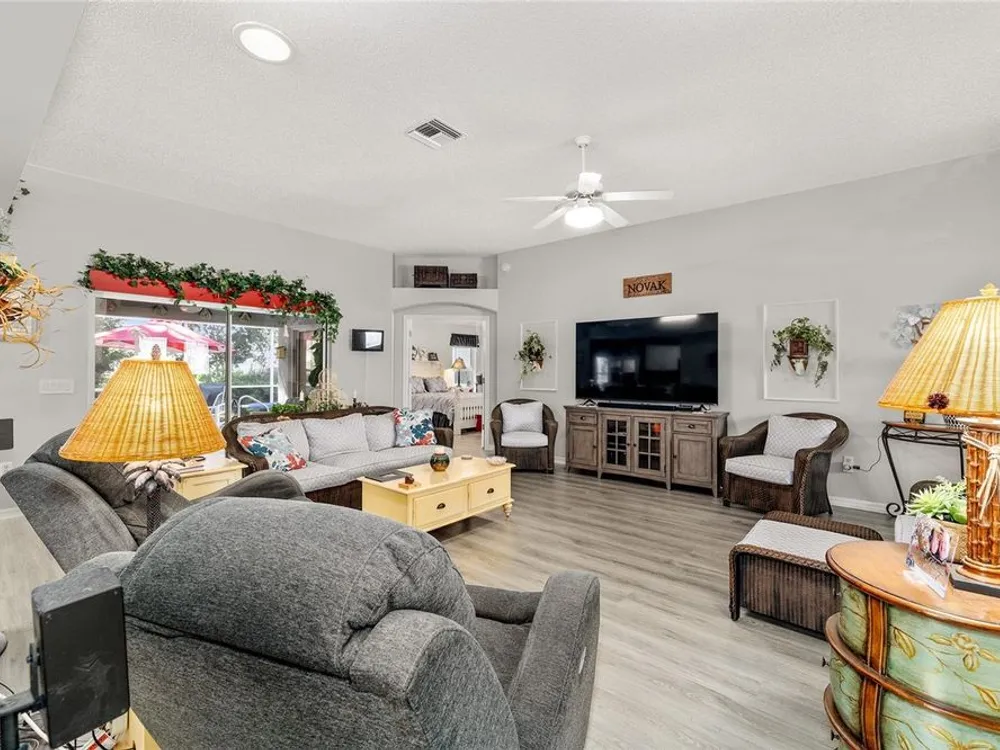 Elegant TURNKEY 3BR/2BA residence in the Village of Santiago offering 1,768 sq ft under heat and air with a 2-car garage, including a 2019 roof, 2022 HVAC, and 2022 tankless gas hot water heater. The remodeled kitchen (2021) showcases quartz countertops with granite sink, island, crown-moulded cabinetry with pull-outs, under-cabinet lighting, glass tile backsplash, and premium appliances. Spacious living and dining areas feature luxury vinyl flooring, solar tubes, and Tiffany-style lighting for a bright atmosphere. The owner’s suite provides lanai access, walk-in closet with custom shelving, and an upgraded bath with dual vanities. A private guest wing offers two bedrooms, one with murphy bed, and an updated bath. Outdoor living shines with an expansive 33x13 birdcage with stamped concrete, grill gazebo, and Bromine swim spa. Additional highlights include a double-door entry with leaded glass, stamped driveway, landscaped beds with leaf-guard gutters, epoxy-finished garage with hurricane door, attic access, and built-in workbenches.