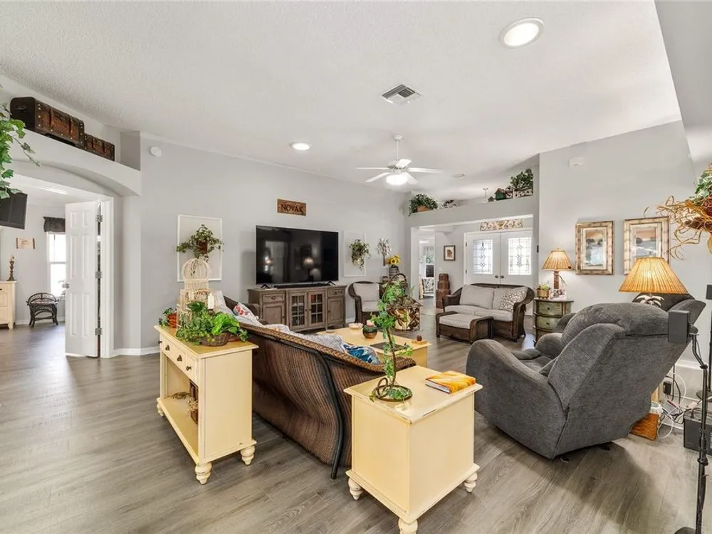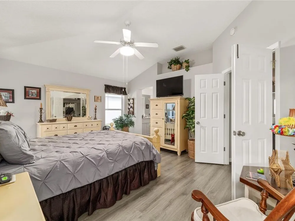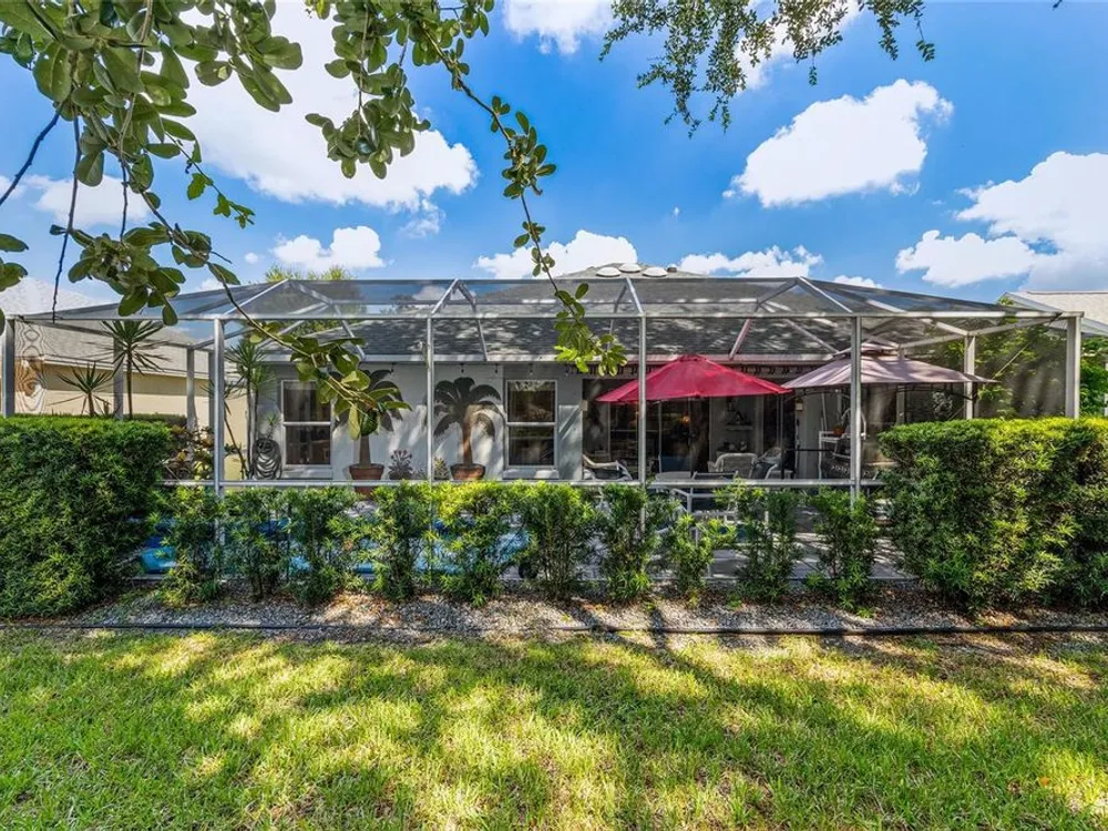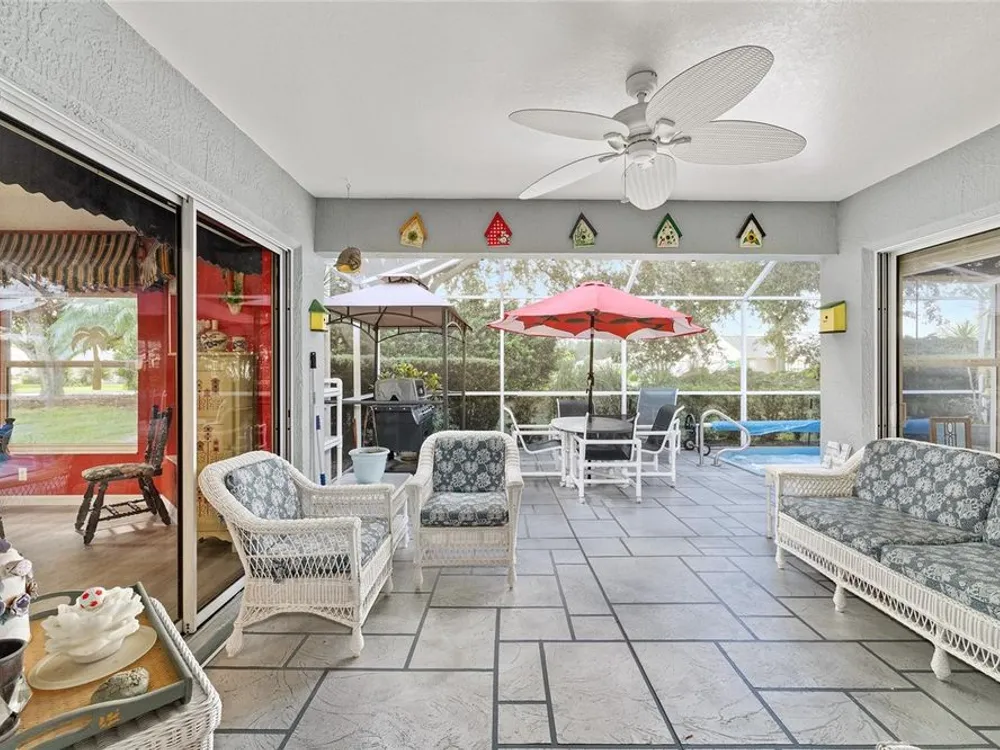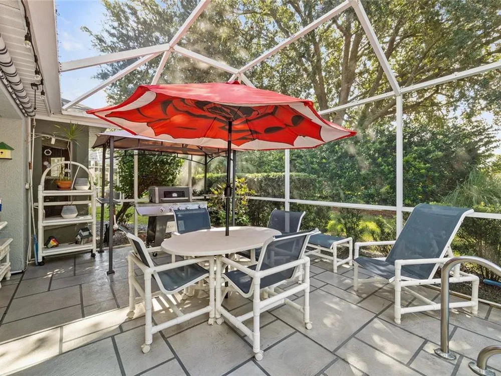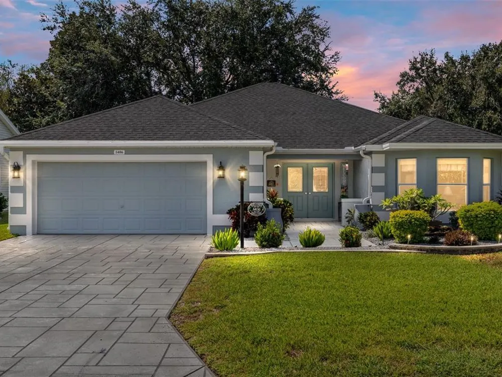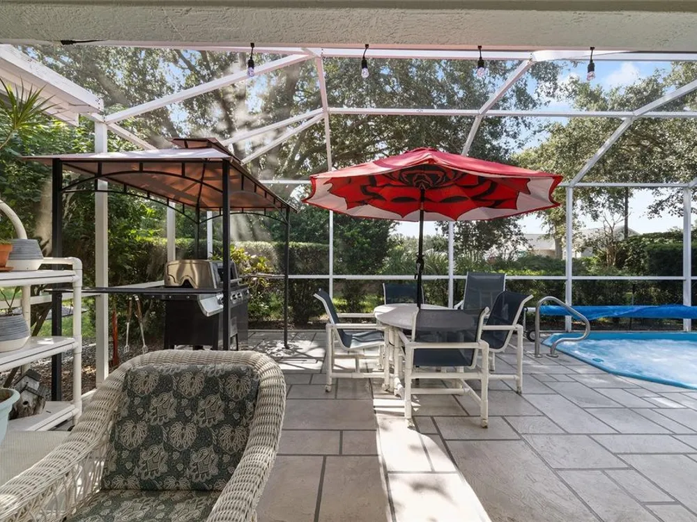 Elegant TURNKEY 3BR/2BA residence in the Village of Santiago offering 1,768 sq ft under heat and air with a 2-car garage, including a 2019 roof, 2022 HVAC, and 2022 tankless gas hot water heater. The remodeled kitchen (2021) showcases quartz countertops with granite sink, island, crown-moulded cabinetry with pull-outs, under-cabinet lighting, glass tile backsplash, and premium appliances. Spacious living and dining areas feature luxury vinyl flooring, solar tubes, and Tiffany-style lighting for a bright atmosphere. The owner’s suite provides lanai access, walk-in closet with custom shelving, and an upgraded bath with dual vanities. A private guest wing offers two bedrooms, one with murphy bed, and an updated bath. Outdoor living shines with an expansive 33x13 birdcage with stamped concrete, grill gazebo, and Bromine swim spa. Additional highlights include a double-door entry with leaded glass, stamped driveway, landscaped beds with leaf-guard gutters, epoxy-finished garage with hurricane door, attic access, and built-in workbenches.