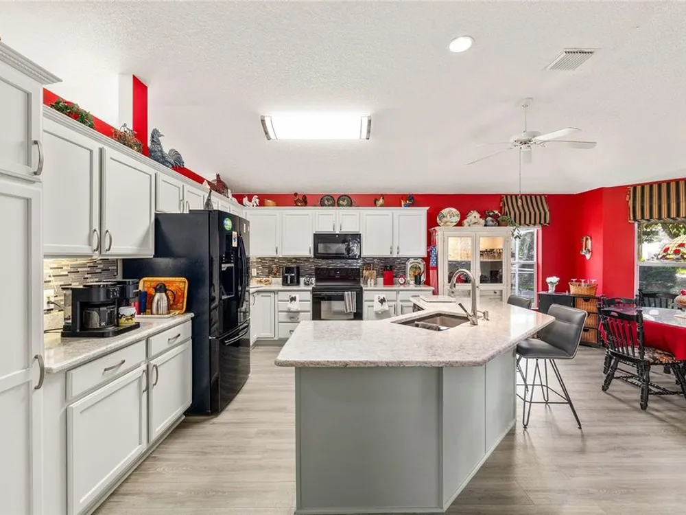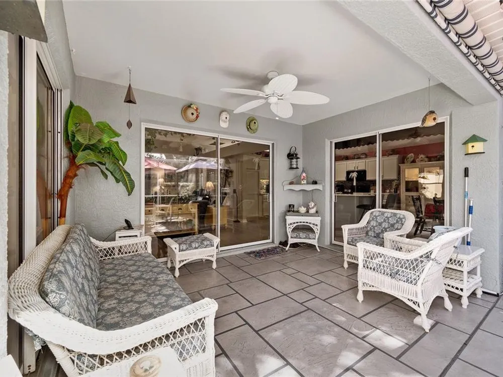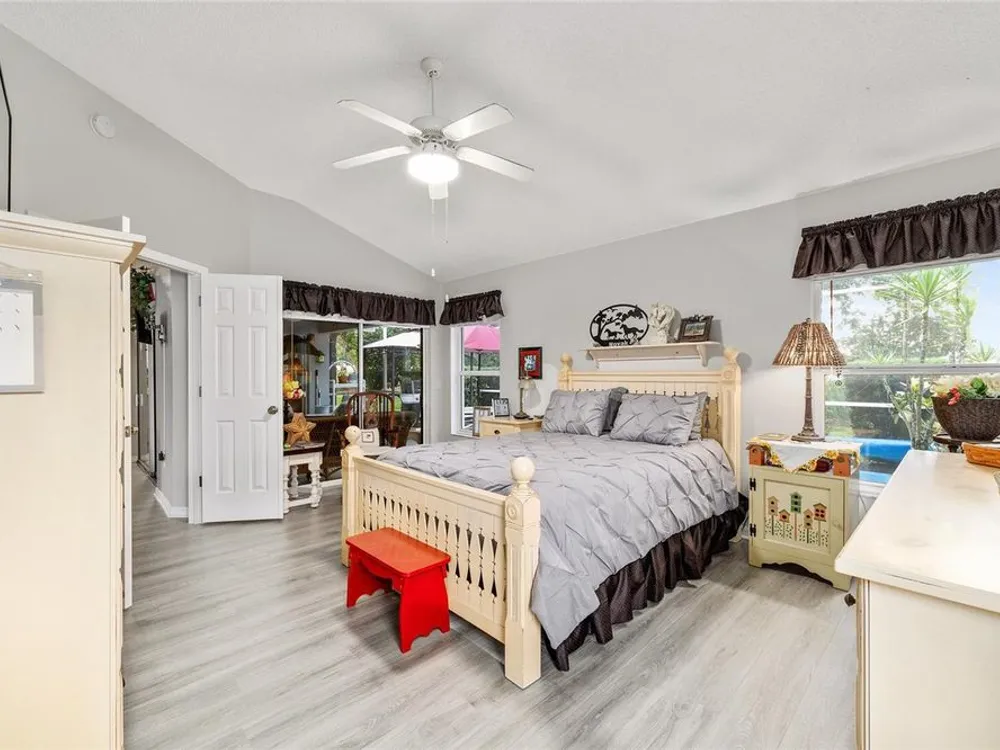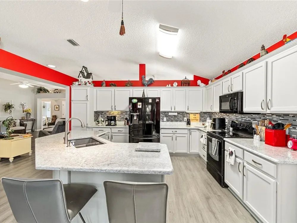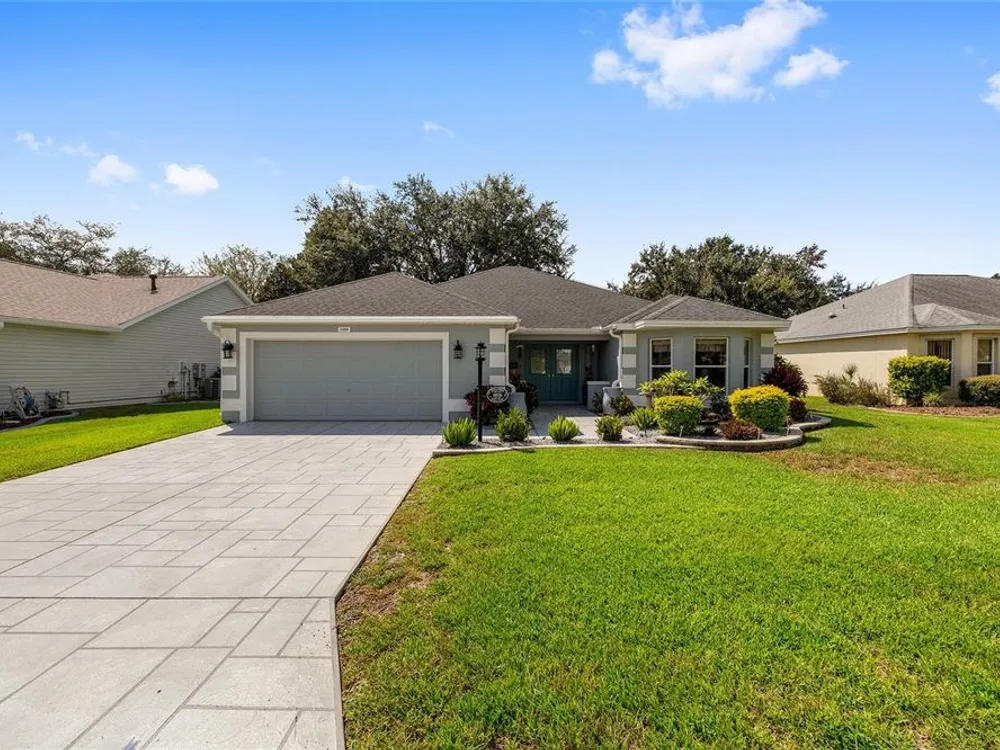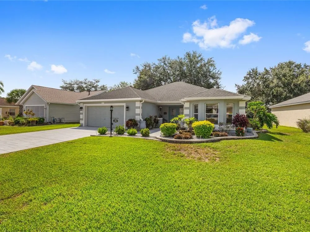 Elegant TURNKEY 3BR/2BA residence in the Village of Santiago offering 1,768 sq ft under heat and air with a 2-car garage, including a 2019 roof, 2022 HVAC, and 2022 tankless gas hot water heater. The remodeled kitchen (2021) showcases quartz countertops with granite sink, island, crown-moulded cabinetry with pull-outs, under-cabinet lighting, glass tile backsplash, and premium appliances. Spacious living and dining areas feature luxury vinyl flooring, solar tubes, and Tiffany-style lighting for a bright atmosphere. The owner’s suite provides lanai access, walk-in closet with custom shelving, and an upgraded bath with dual vanities. A private guest wing offers two bedrooms, one with murphy bed, and an updated bath. Outdoor living shines with an expansive 33x13 birdcage with stamped concrete, grill gazebo, and Bromine swim spa. Additional highlights include a double-door entry with leaded glass, stamped driveway, landscaped beds with leaf-guard gutters, epoxy-finished garage with hurricane door, attic access, and built-in workbenches.