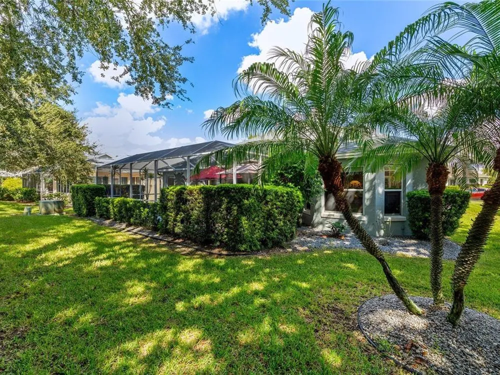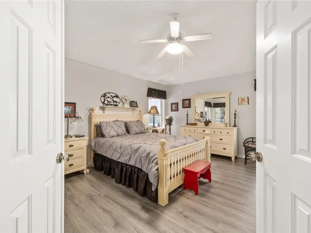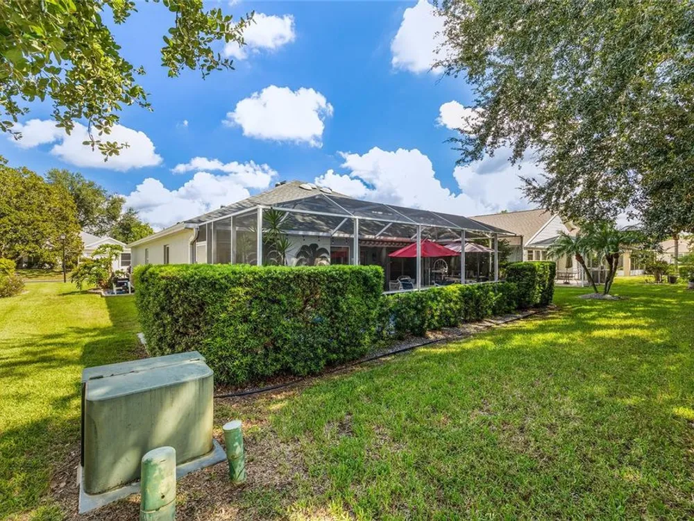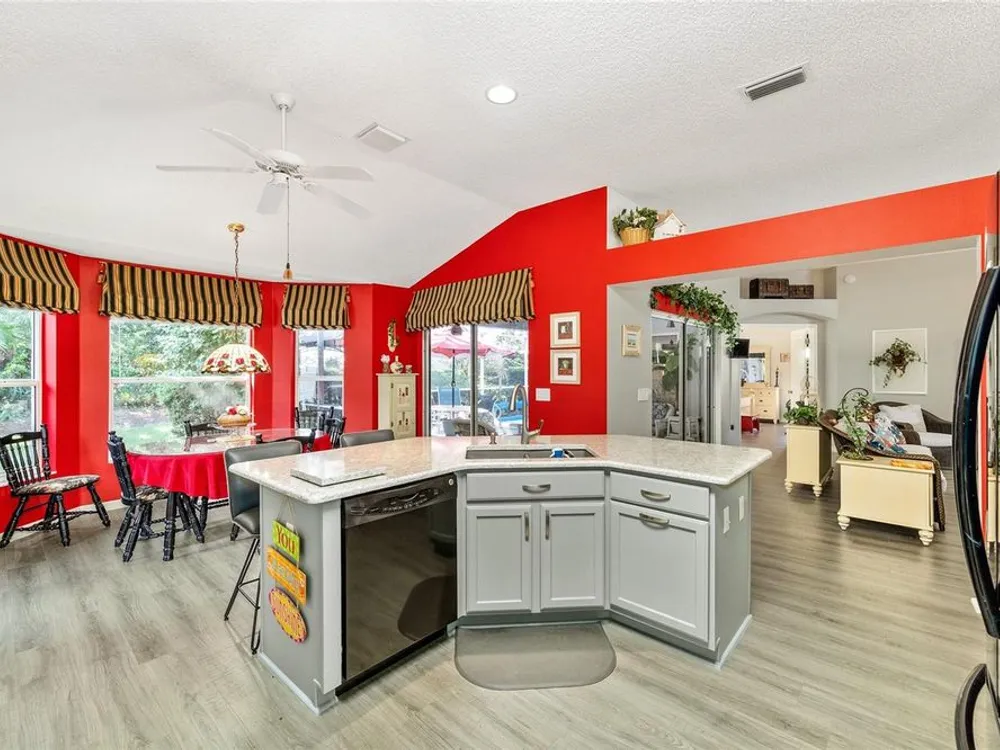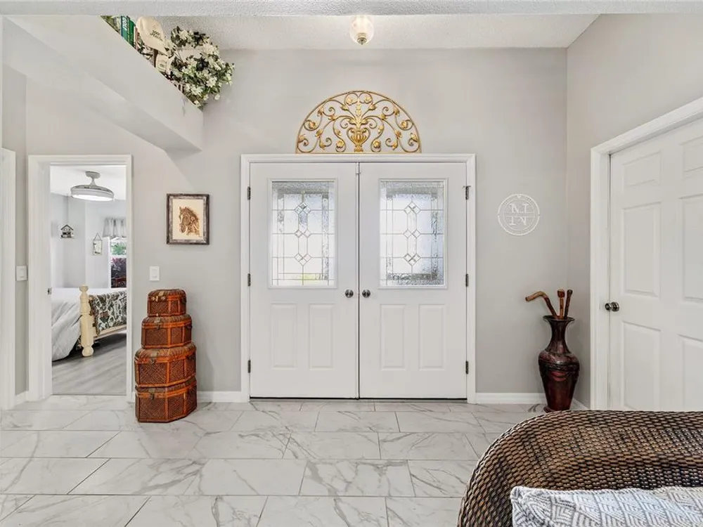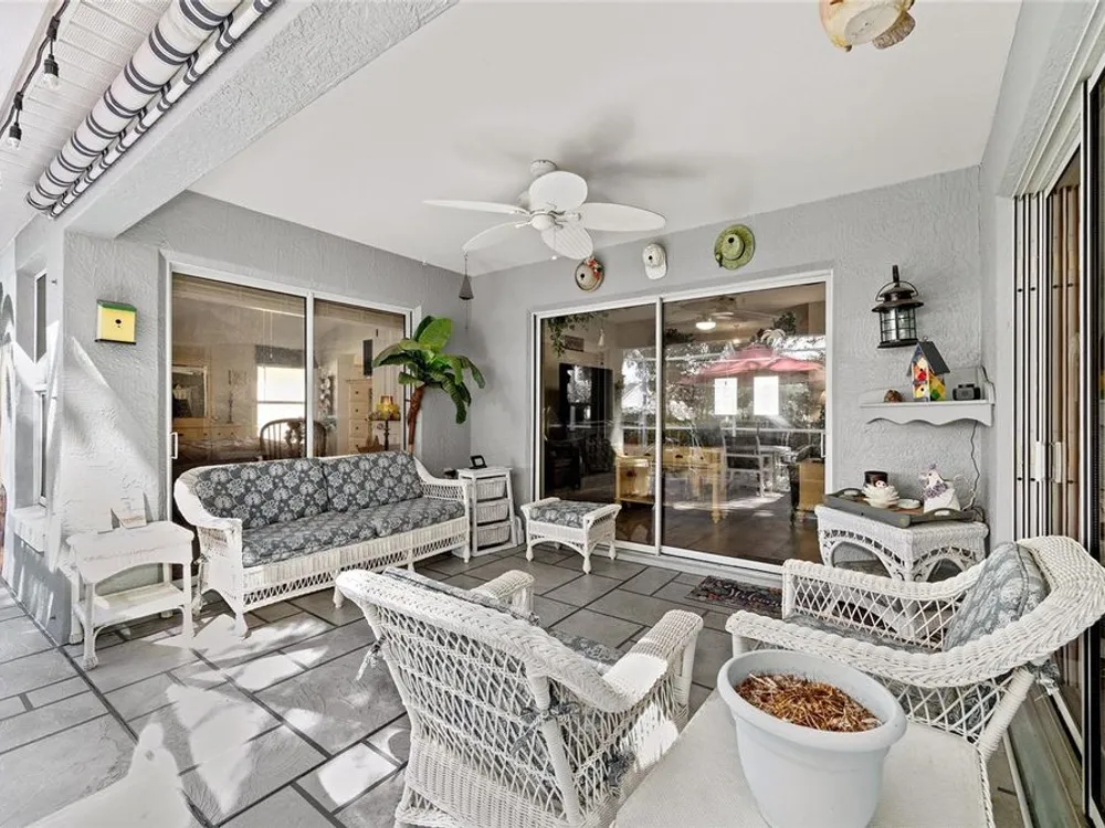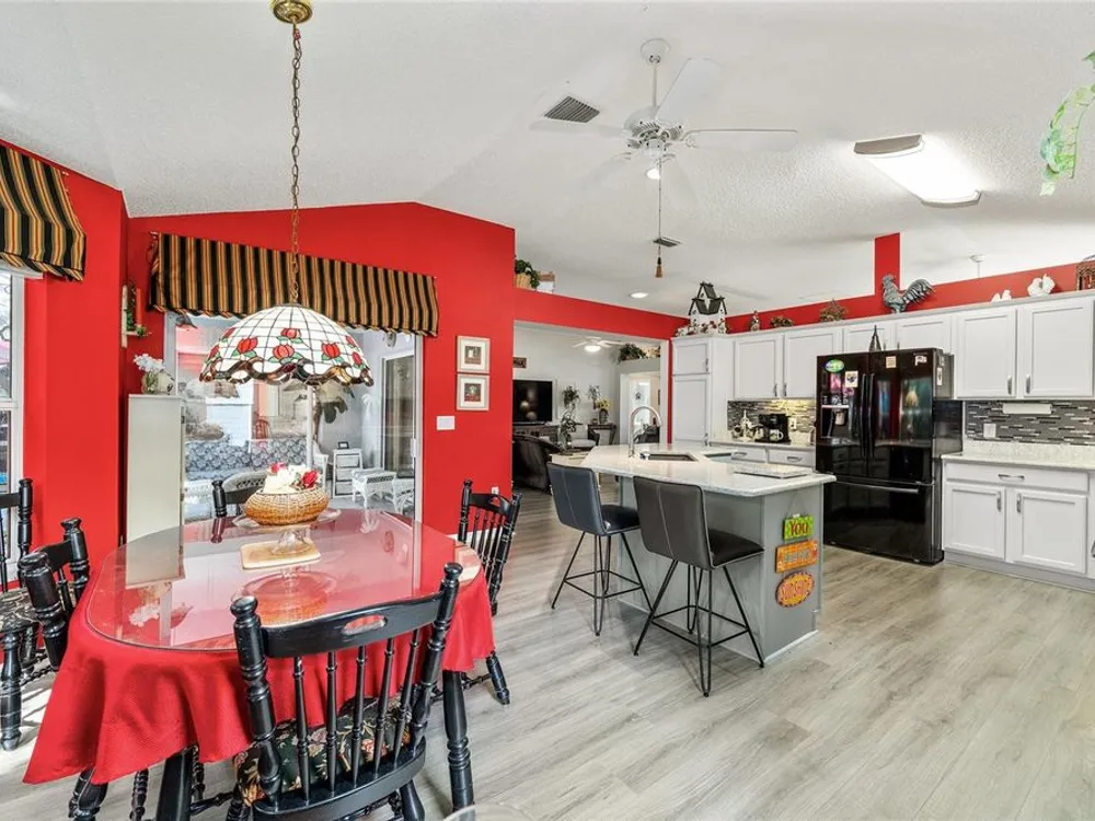 Elegant TURNKEY 3BR/2BA residence in the Village of Santiago offering 1,768 sq ft under heat and air with a 2-car garage, including a 2019 roof, 2022 HVAC, and 2022 tankless gas hot water heater. The remodeled kitchen (2021) showcases quartz countertops with granite sink, island, crown-moulded cabinetry with pull-outs, under-cabinet lighting, glass tile backsplash, and premium appliances. Spacious living and dining areas feature luxury vinyl flooring, solar tubes, and Tiffany-style lighting for a bright atmosphere. The owner’s suite provides lanai access, walk-in closet with custom shelving, and an upgraded bath with dual vanities. A private guest wing offers two bedrooms, one with murphy bed, and an updated bath. Outdoor living shines with an expansive 33x13 birdcage with stamped concrete, grill gazebo, and Bromine swim spa. Additional highlights include a double-door entry with leaded glass, stamped driveway, landscaped beds with leaf-guard gutters, epoxy-finished garage with hurricane door, attic access, and built-in workbenches.