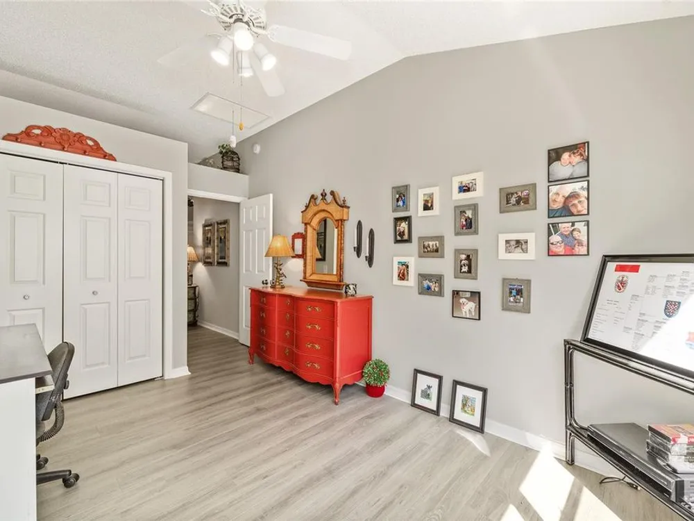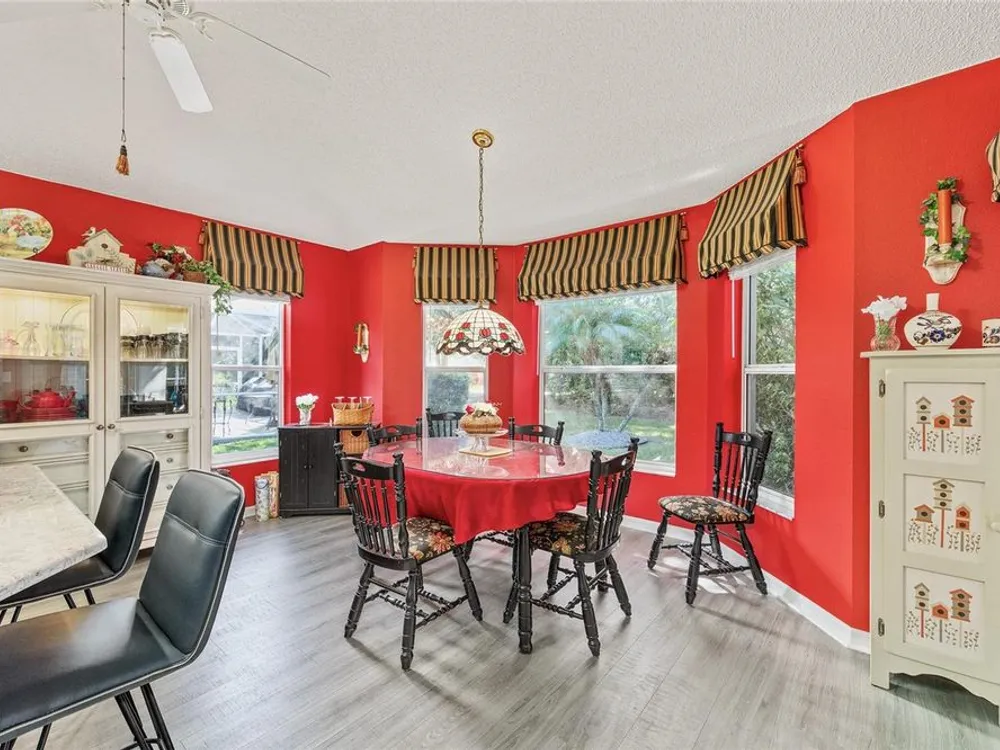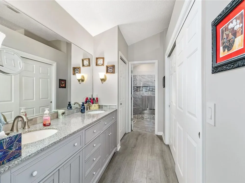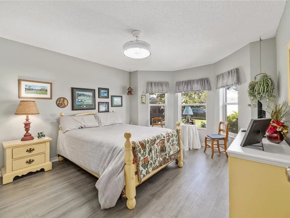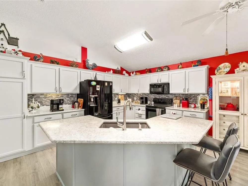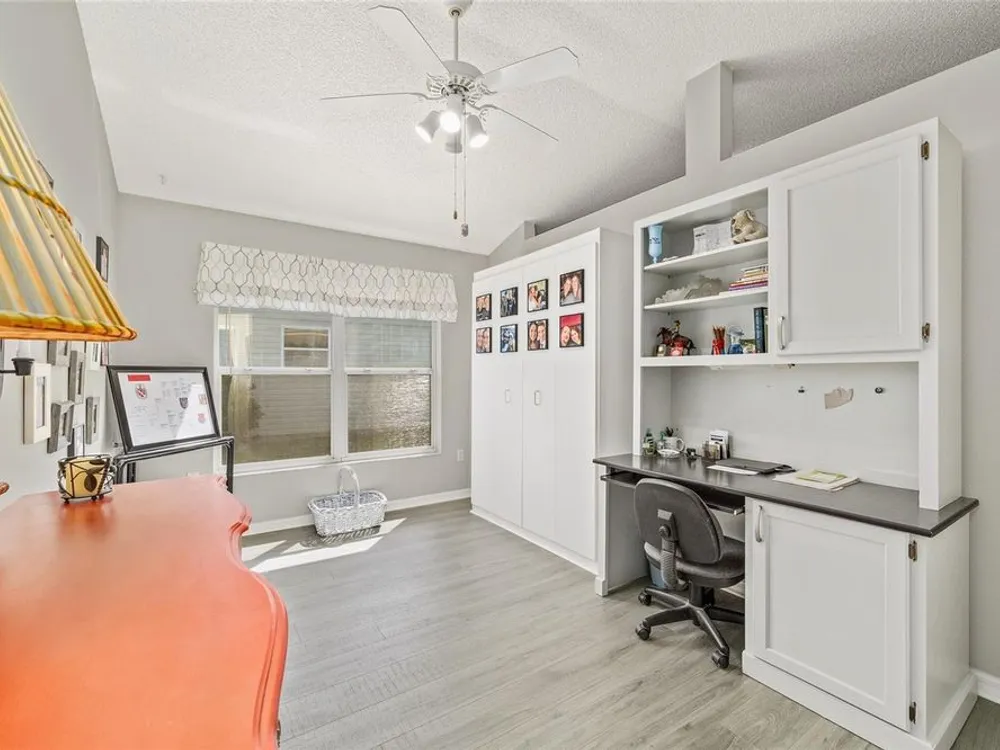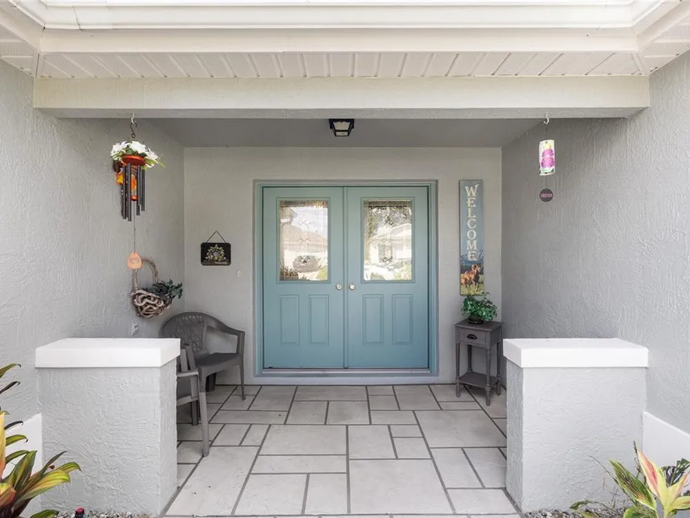 Elegant TURNKEY 3BR/2BA residence in the Village of Santiago offering 1,768 sq ft under heat and air with a 2-car garage, including a 2019 roof, 2022 HVAC, and 2022 tankless gas hot water heater. The remodeled kitchen (2021) showcases quartz countertops with granite sink, island, crown-moulded cabinetry with pull-outs, under-cabinet lighting, glass tile backsplash, and premium appliances. Spacious living and dining areas feature luxury vinyl flooring, solar tubes, and Tiffany-style lighting for a bright atmosphere. The owner’s suite provides lanai access, walk-in closet with custom shelving, and an upgraded bath with dual vanities. A private guest wing offers two bedrooms, one with murphy bed, and an updated bath. Outdoor living shines with an expansive 33x13 birdcage with stamped concrete, grill gazebo, and Bromine swim spa. Additional highlights include a double-door entry with leaded glass, stamped driveway, landscaped beds with leaf-guard gutters, epoxy-finished garage with hurricane door, attic access, and built-in workbenches.