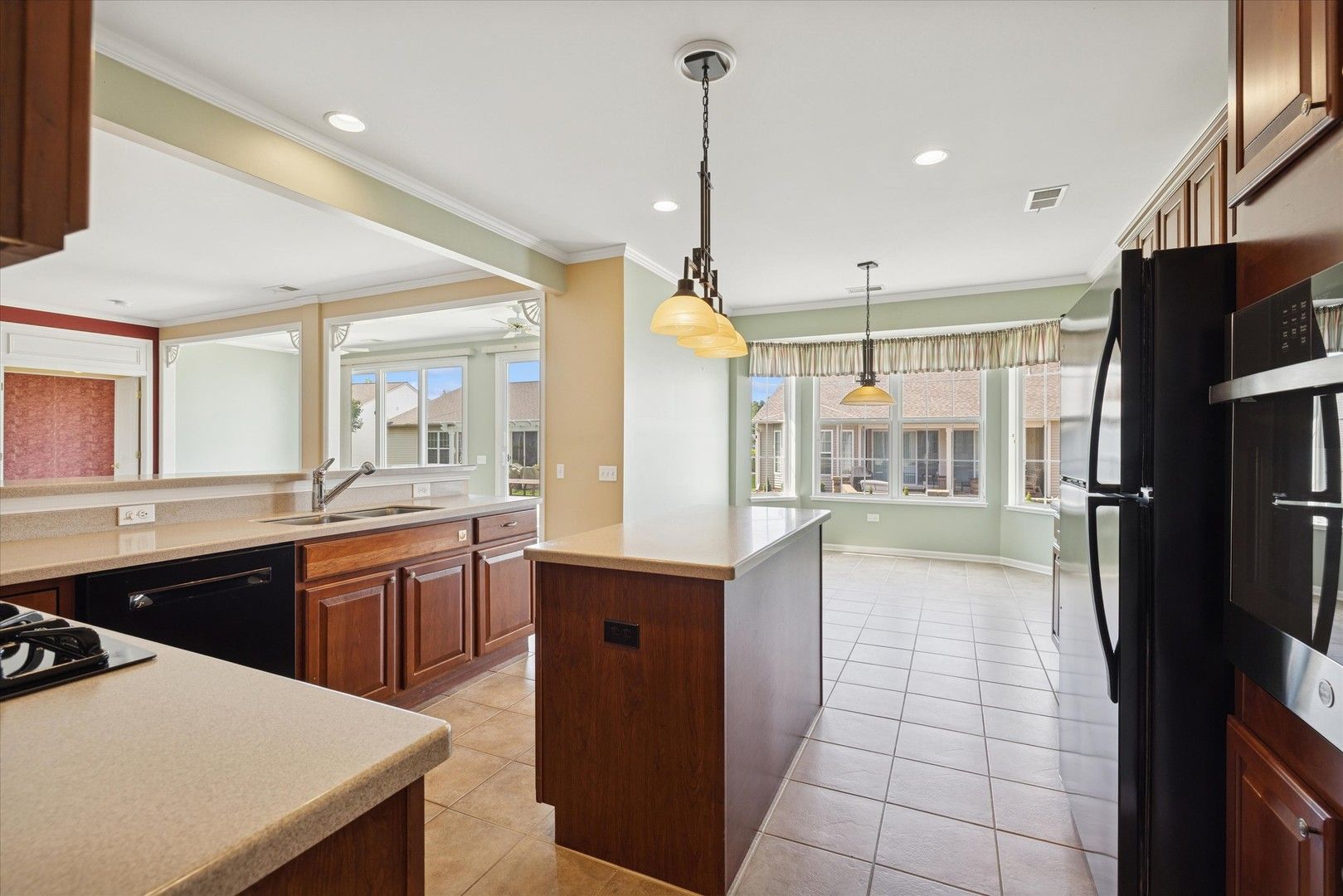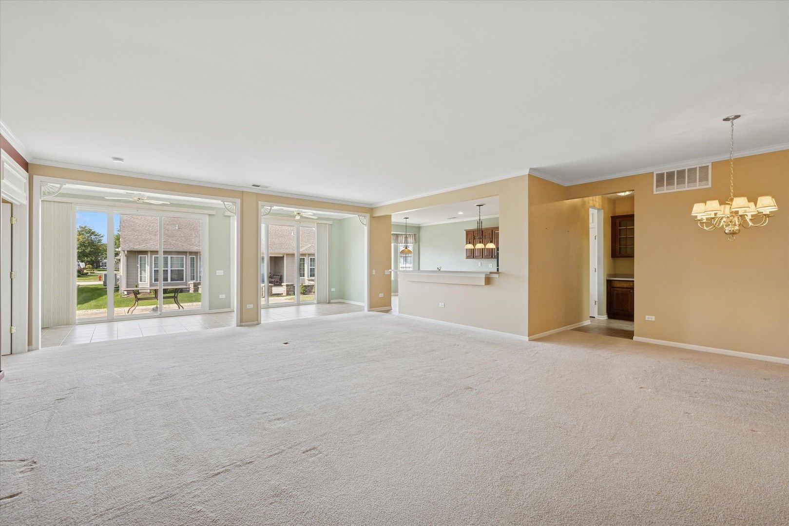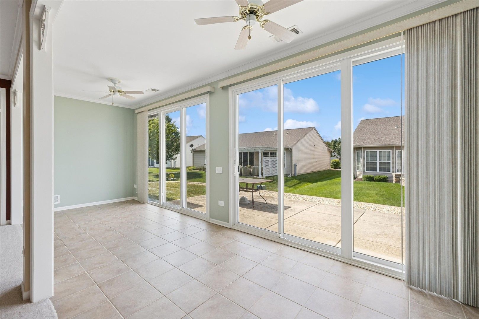 Light-filled Adler model with a spacious open foyer flowing into expansive living, dining, and sunroom areas. Elegant millwork and crown molding throughout. Two bedrooms plus a den (convertible to a third), large kitchen with eating island, upgraded bay window, Merrilat cabinets, built-in oven, pantry, and solid surface countertops. Expanded master suite with bay window, double hung walk-in closet, dual vanities, and separate garden tub and shower. Spacious second bedroom with full bath nearby. Generous laundry room with sink and extra refrigerator, two-car insulated garage with attic storage. Updated mechanicals: hot water tank (2024), furnace, AC, humidifier (2019). Highly sought-after model in a prime location-won't last!
