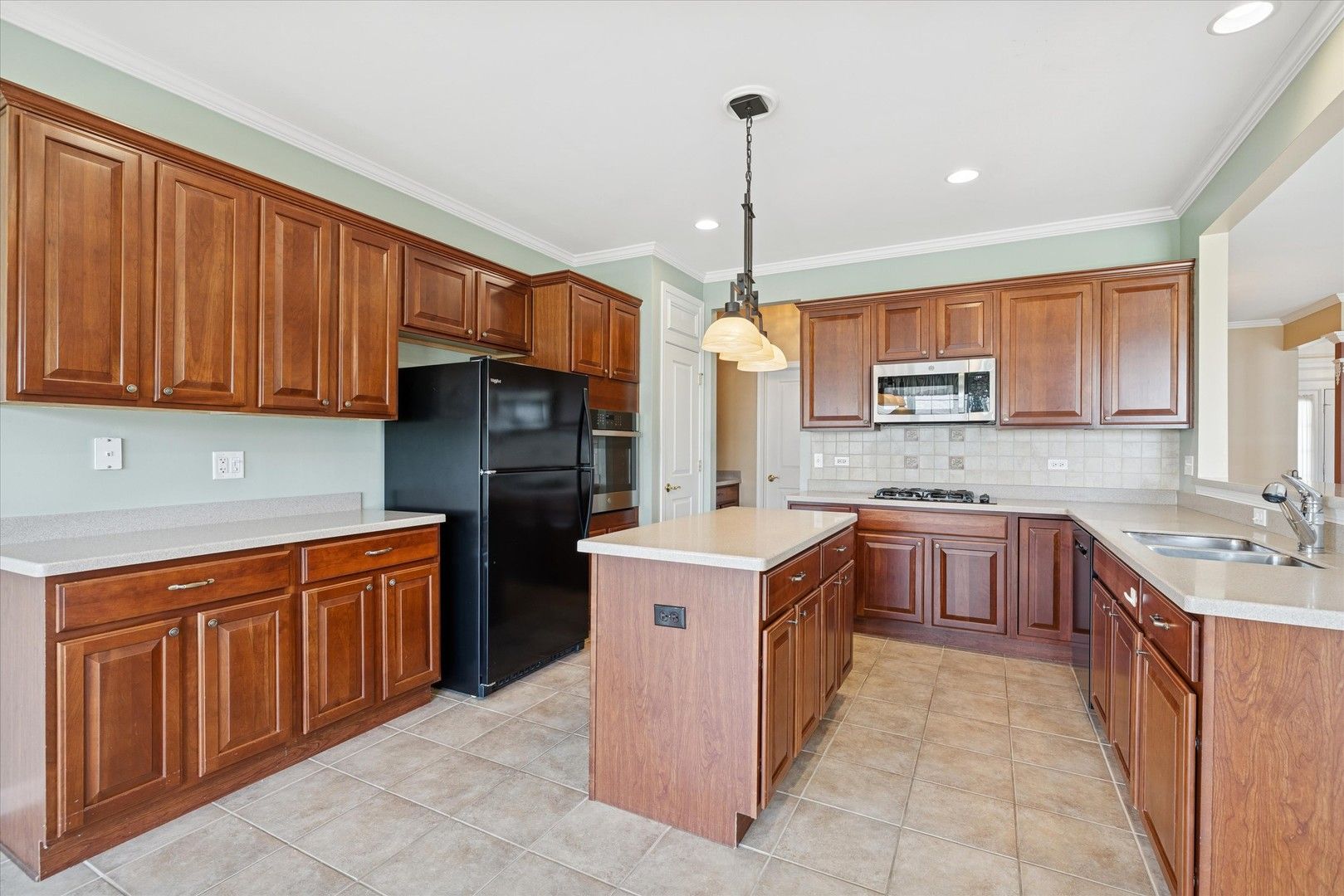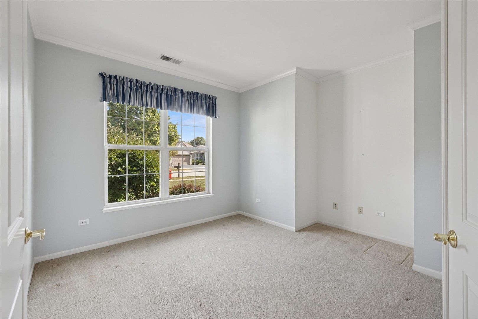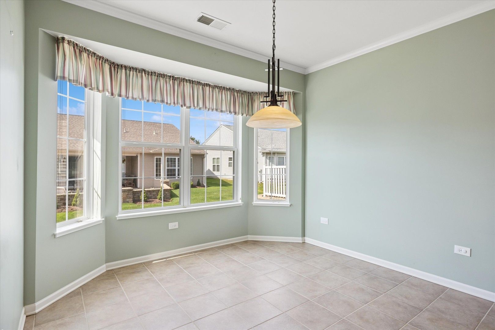Light-filled Adler model with a spacious open foyer flowing into expansive living, dining, and sunroom areas. Elegant millwork and crown molding throughout. Two bedrooms plus a den (convertible to a third), large kitchen with eating island, upgraded bay window, Merrilat cabinets, built-in oven, pantry, and solid surface countertops. Expanded master suite with bay window, double hung walk-in closet, dual vanities, and separate garden tub and shower. Spacious second bedroom with full bath nearby. Generous laundry room with sink and extra refrigerator, two-car insulated garage with attic storage. Updated mechanicals: hot water tank (2024), furnace, AC, humidifier (2019). Highly sought-after model in a prime location-won't last!