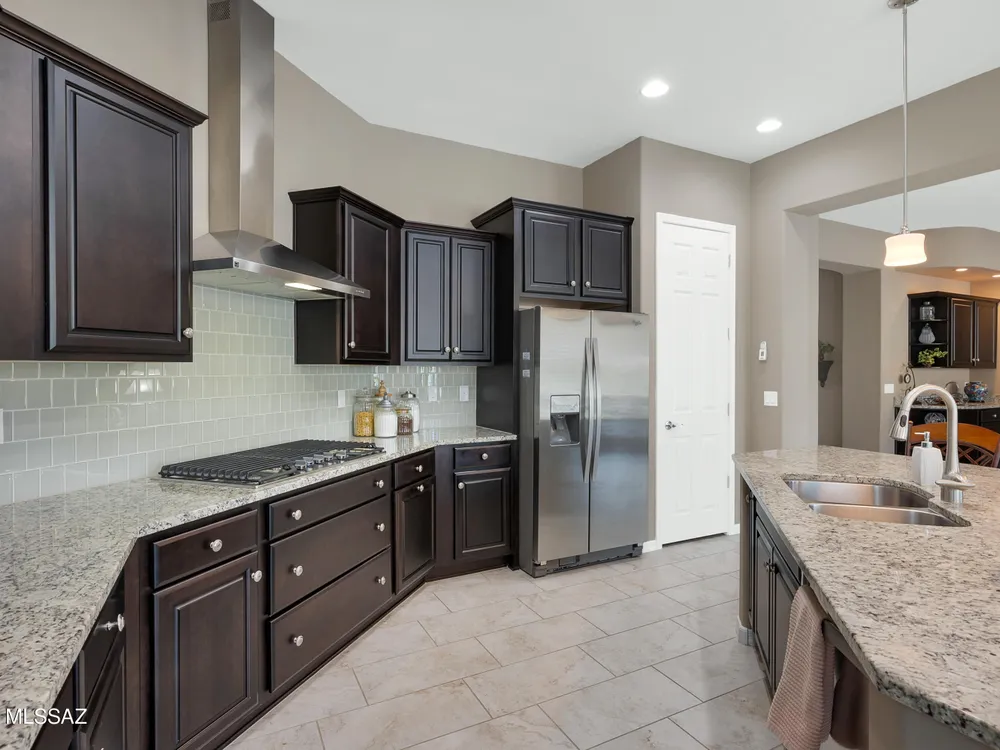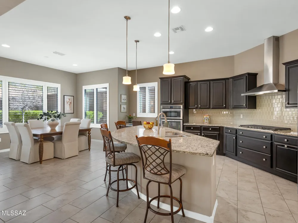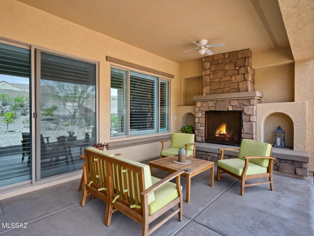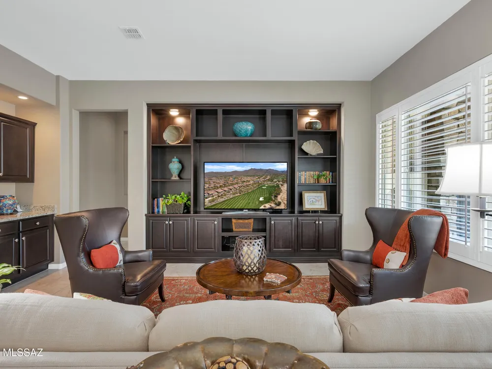 Welcome Home! This meticulously maintained Pursuit model, which is part of Del Webb's upper-tier encore series has 2 Bedrooms plus a Den. This open floor plan boasts 10-foot ceilings and 8-foot interior doors. The gourmet kitchen offers an abundance of cabinets, granite countertops, a tile backsplash, large curved island with a breakfast bar, SS appliances, gas cooktop, built- in oven and a pantry. The spacious great room is designed for entertainment, complete with a built-in entertainment center and wet bar. Step outside to your generous covered patio that includes a built- in gas fireplace. Additional upgrades include an extended garage, plantation shutters, a water softener and so much more! Explore all Del Webb at Dove Mountain has to offer!