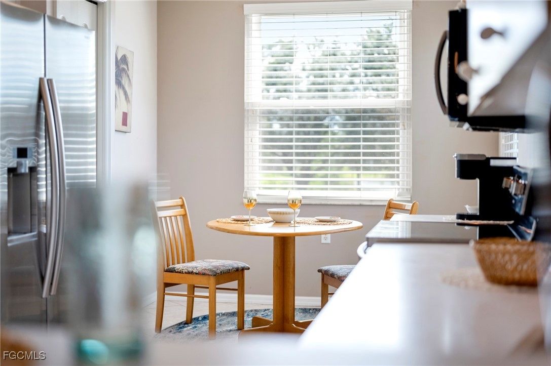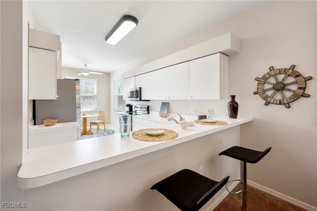 FURNISHED CORNER UNIT WITH LAKE VIEWS IN HERITAGE COVE 55+ COMMUNITY! Welcome to your Florida dream lifestyle! This rarely available, spacious 2-bedroom + den, 2-bath corner-unit condo is located in the highly desirable, gated Heritage Cove community—just off scenic McGregor Blvd, the gateway to Sanibel and Fort Myers Beach. Beautifully furnished and fully turnkey, this second-floor unit offers serene lake views from your private, screened lanai—perfect for morning coffee or sunset relaxation. Inside, you'll find a bright, open living area with an adjacent den ideal for a home office, media room, or reading nook. The primary suite boasts two walk-in closets and an updated ensuite bath with a walk-in shower. A split floor plan provides privacy for guests in the second bedroom, which also features its own walk-in closet and full bath. Enjoy a large, eat-in kitchen with stainless steel appliances, a breakfast bar, and plenty of cabinetry—plus an in-unit laundry room with full-sized washer and dryer for added convenience. This unit comes with covered parking, a private storage closet for all your beach and sporting gear, and a screened front entry that welcomes the Gulf breeze. The HOA includes cable TV, Wi-Fi, water, lawn care, and more—plus full access to the resort-style pool, clubhouse, fitness center, bocce ball, clay tennis courts, and beautifully maintained grounds. Whether you're a full-time resident or seasonal snowbird, this gem offers low-maintenance living in an unbeatable location. Don’t miss this opportunity to own one of the best units in Heritage Cove—corner unit, lake view, turnkey and ready for you!