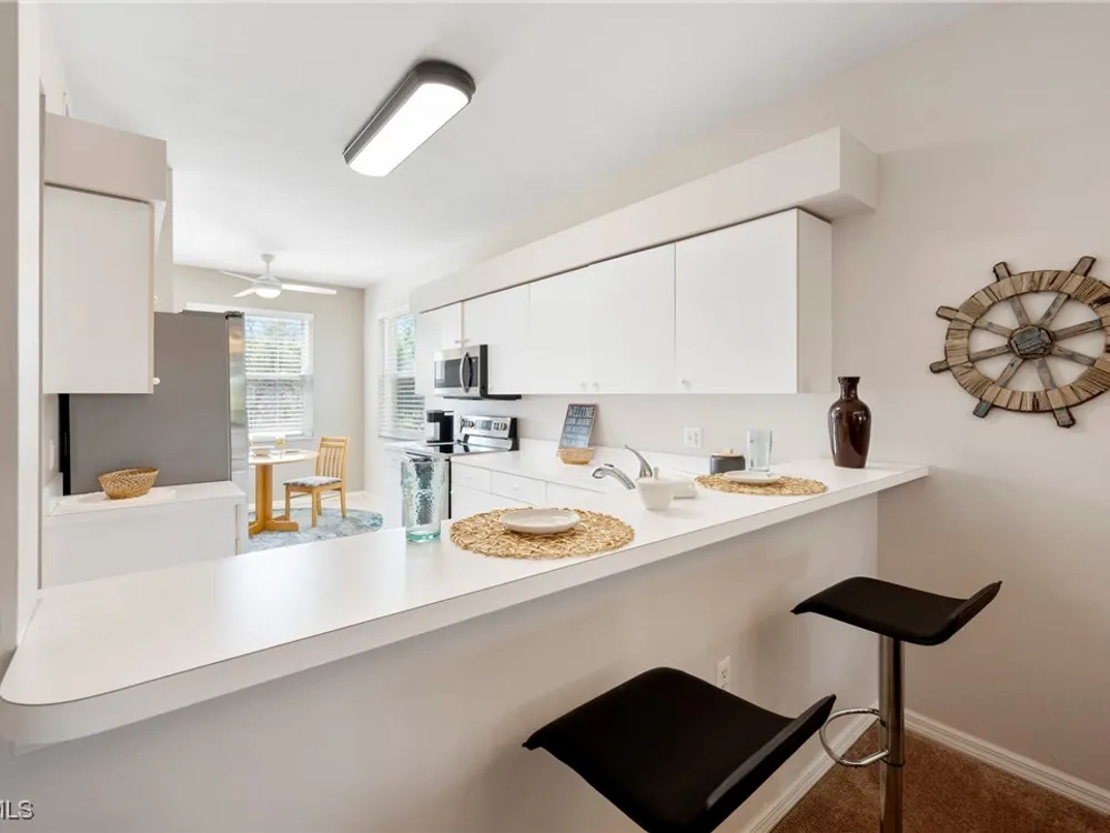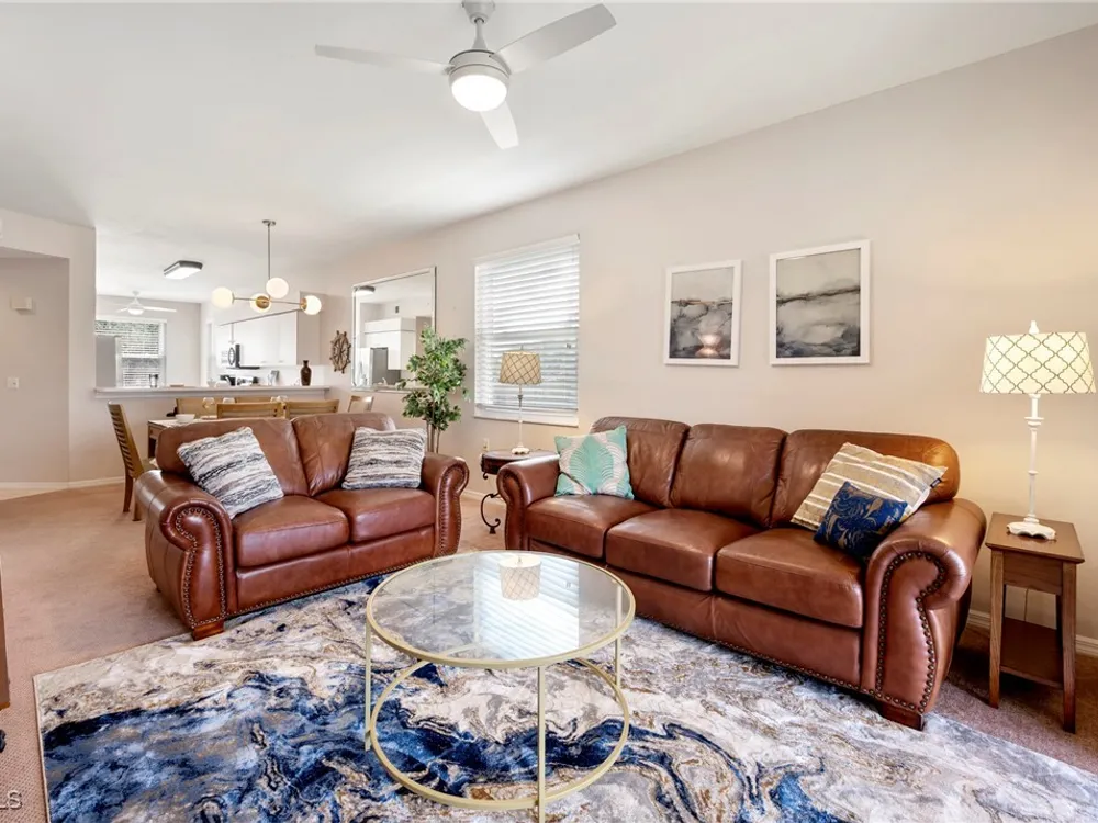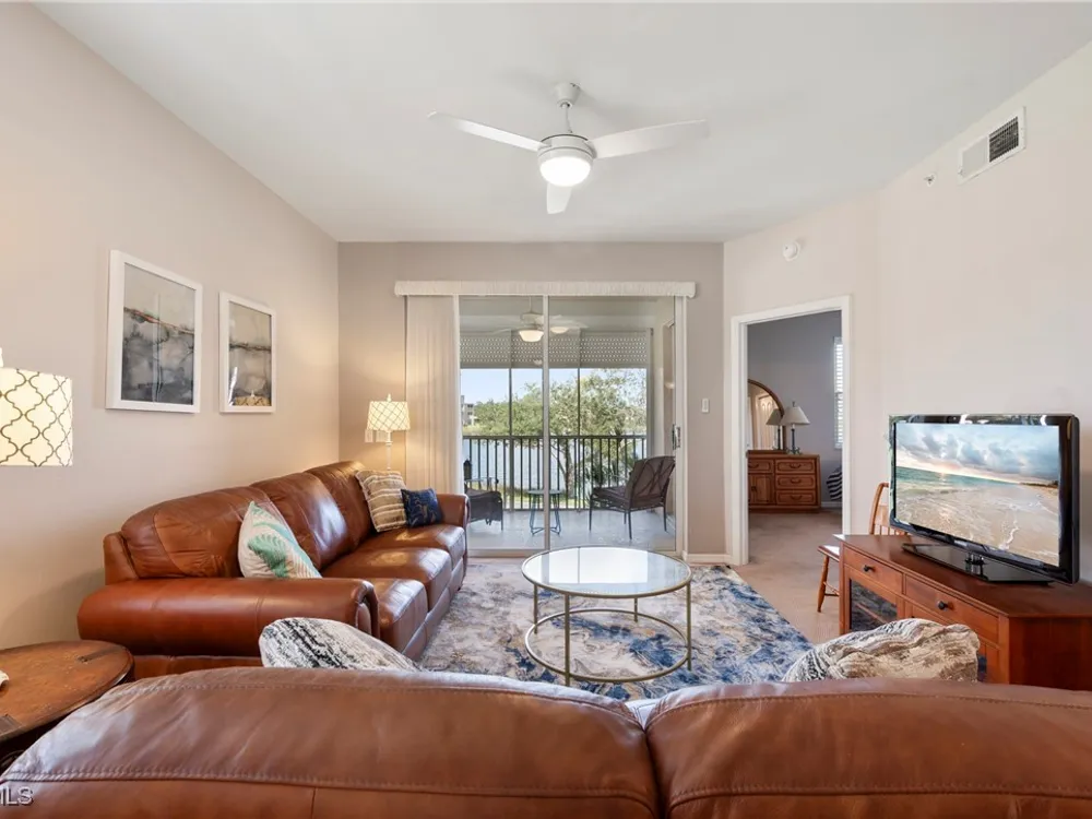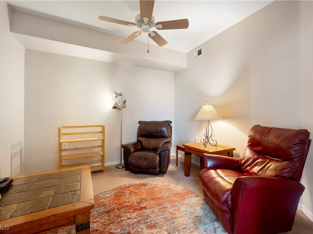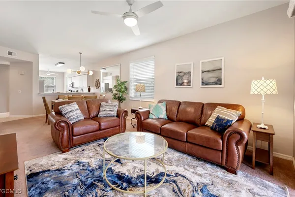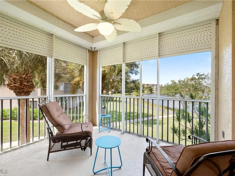 TURNKEY, FURNISHED CORNER UNIT WITH LAKE VIEWS IN HERITAGE COVE 55+ COMMUNITY! Welcome to your Florida dream lifestyle! This rarely available, spacious 2-bedroom + den, 2-bath corner-unit condo is located in the highly desirable, gated Heritage Cove community—just off scenic McGregor Blvd, the gateway to Sanibel and Fort Myers Beach. Beautifully furnished and fully turnkey, this second-floor unit offers serene lake views from your private, screened lanai—perfect for morning coffee or sunset relaxation. Inside, you'll find a bright, open living area with an adjacent den ideal for a home office, media room, or reading nook. The primary suite boasts two walk-in closets and an updated ensuite bath with a walk-in shower. A split floor plan provides privacy for guests in the second bedroom, which also features its own walk-in closet and full bath. Enjoy a large, eat-in kitchen with stainless steel appliances, a breakfast bar, and plenty of cabinetry—plus an in-unit laundry room with full-sized washer and dryer for added convenience. This unit comes with covered parking, a private storage closet for all your beach and sporting gear, and a screened front entry that welcomes the Gulf breeze. The HOA includes cable TV, Wi-Fi, water, lawn care, and more—plus full access to the resort-style pool, clubhouse, fitness center, bocce ball, clay tennis courts, and beautifully maintained grounds. Whether you're a full-time resident or seasonal snowbird, this gem offers low-maintenance living in an unbeatable location. Don’t miss this opportunity to own one of the best units in Heritage Cove—corner unit, lake view, turnkey and ready for you!