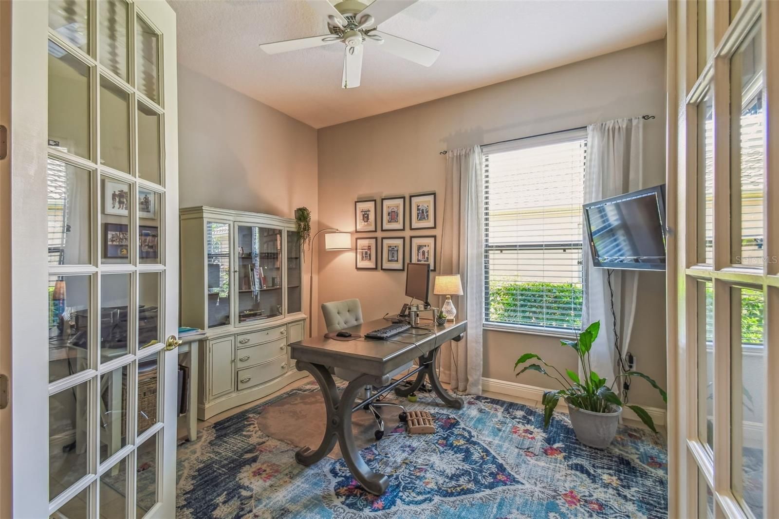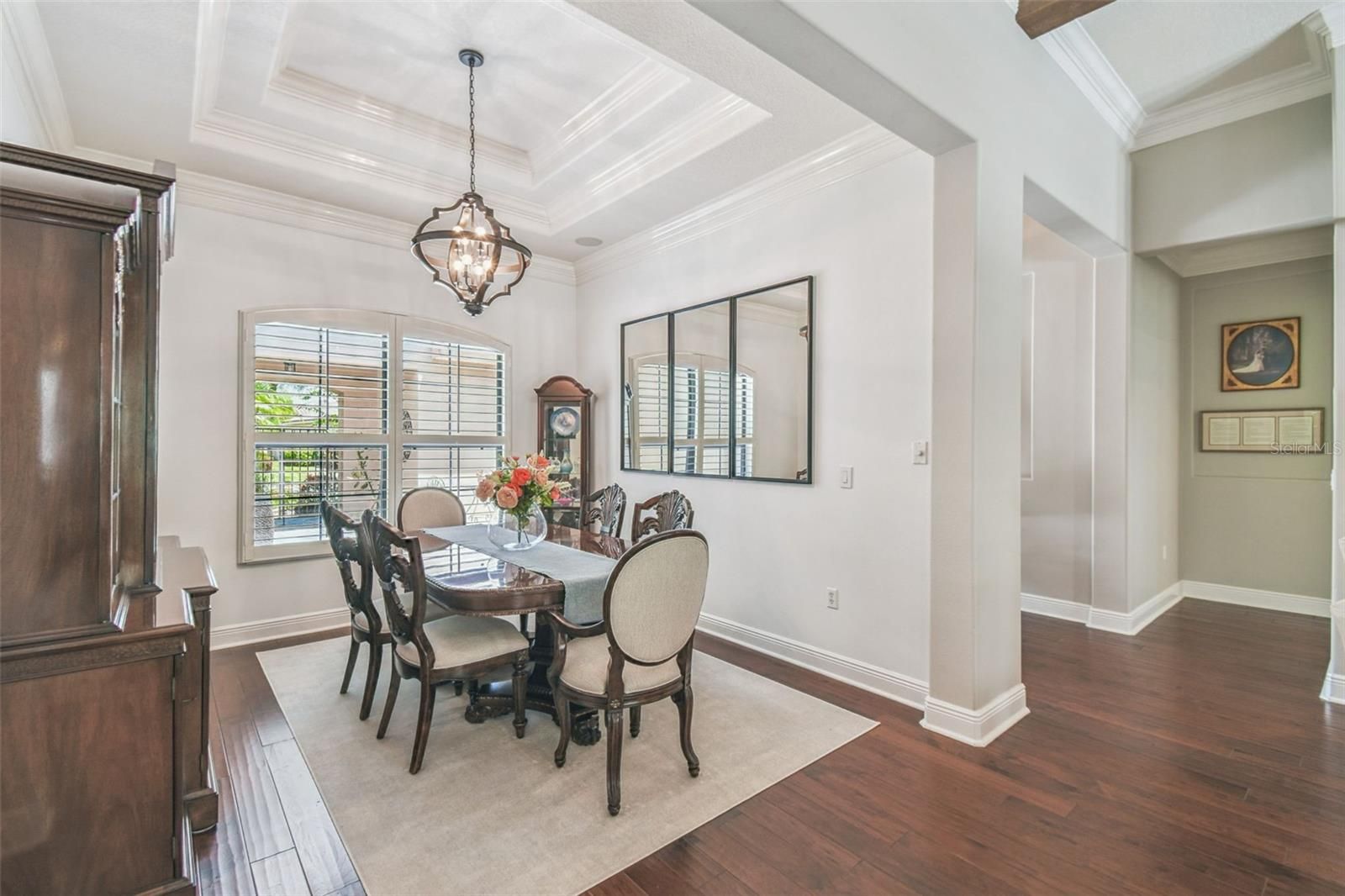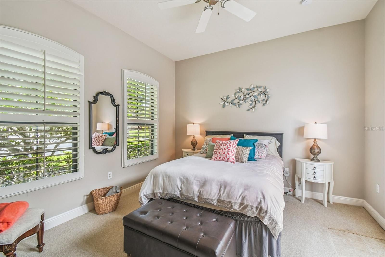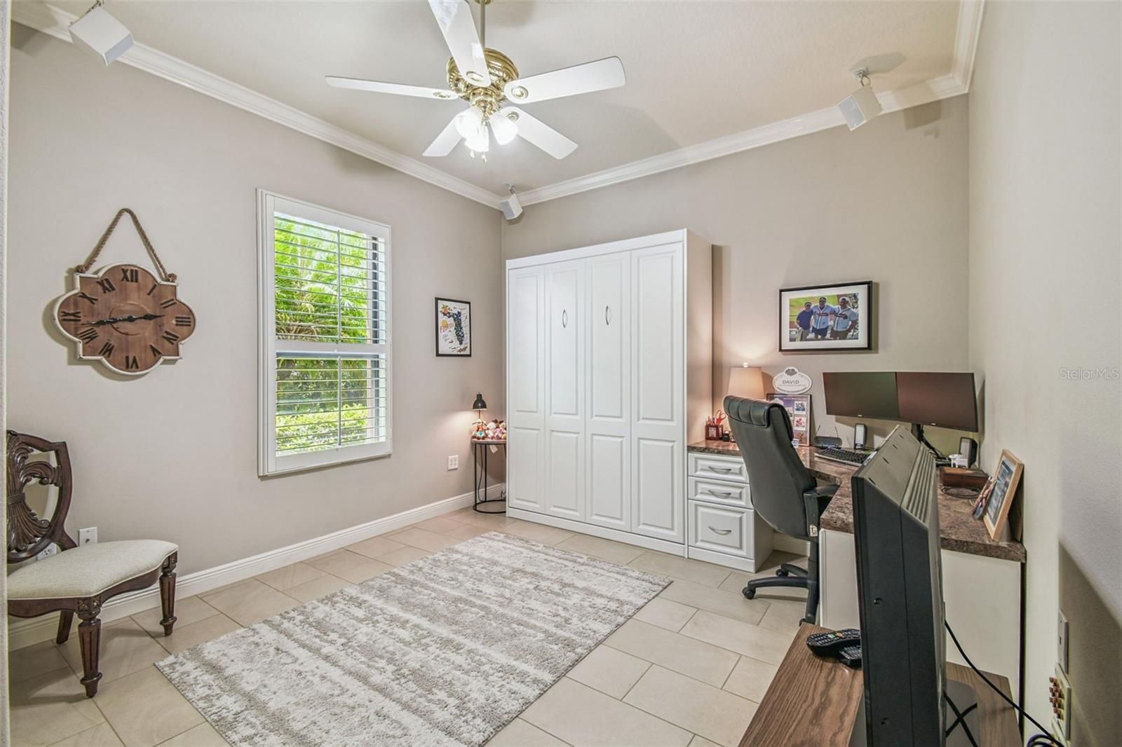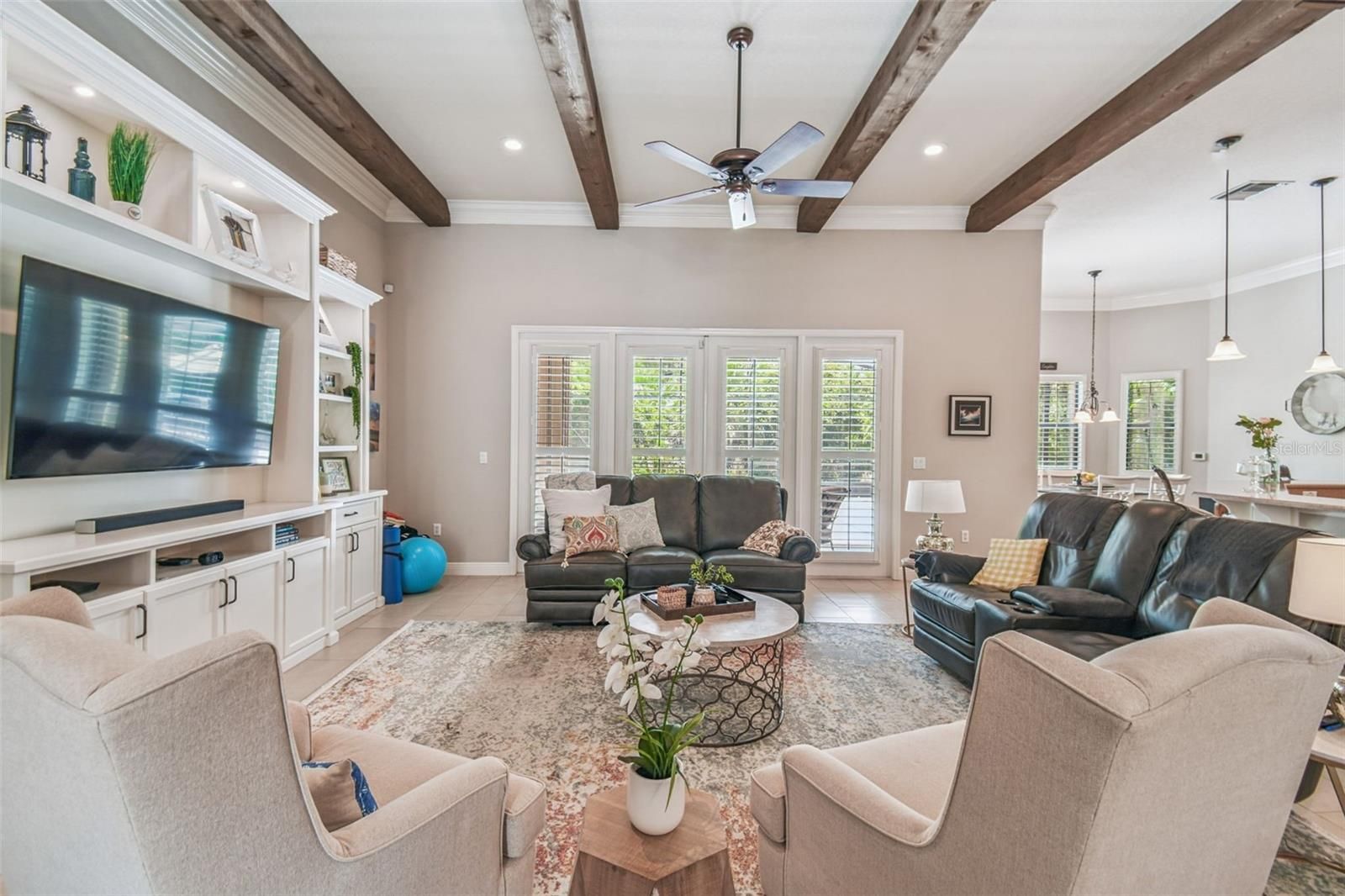 - Ceiling Fan(s), Crown Molding, High Ceilings, Open Floorplan, Main Level Primary, Solid-Wood Cabinets, Split Bedrooms, Stone Counters, Thermostat, Tray Ceiling(s), Walk-In Closet(s), Window Treatments
