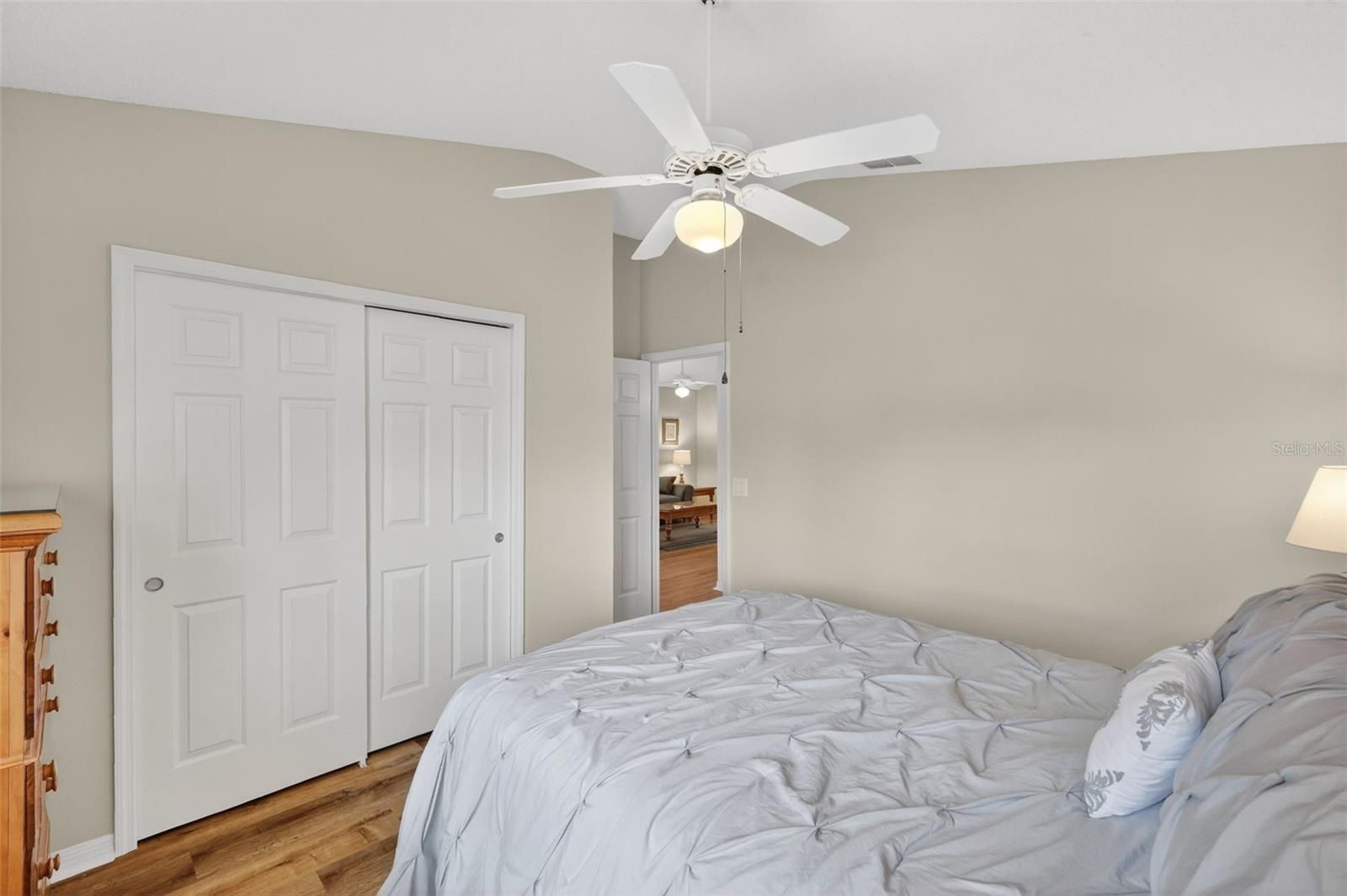 - Ceiling Fan(s), Eat-in Kitchen, High Ceilings, Living/Dining Room, Open Floorplan, Main Level Primary, Stone Counters, Thermostat, Vaulted Ceiling(s), Walk-In Closet(s)
