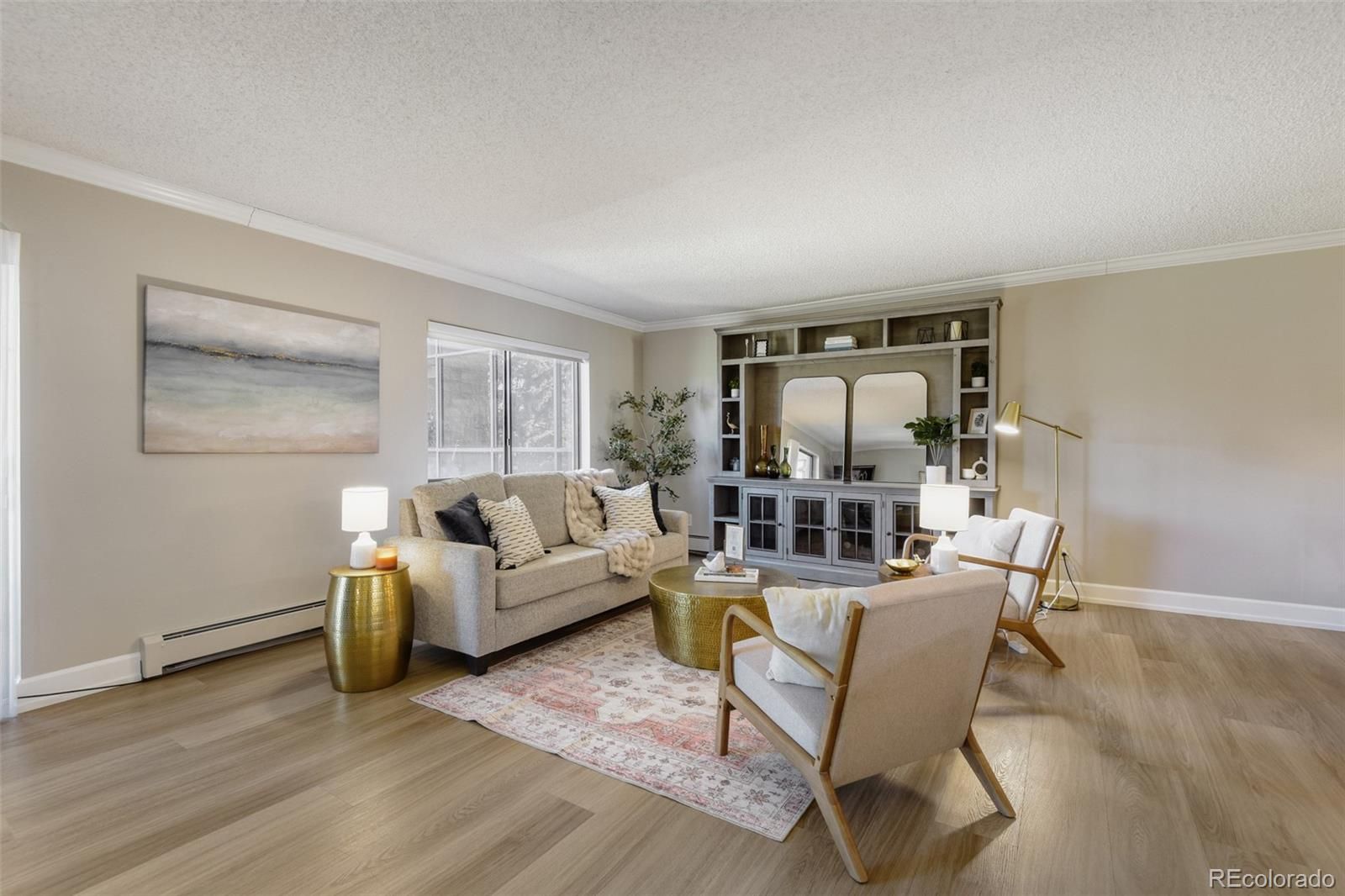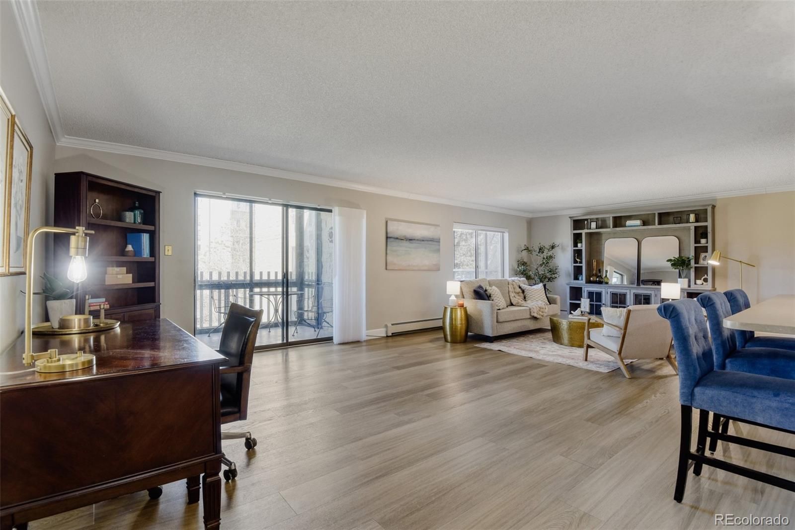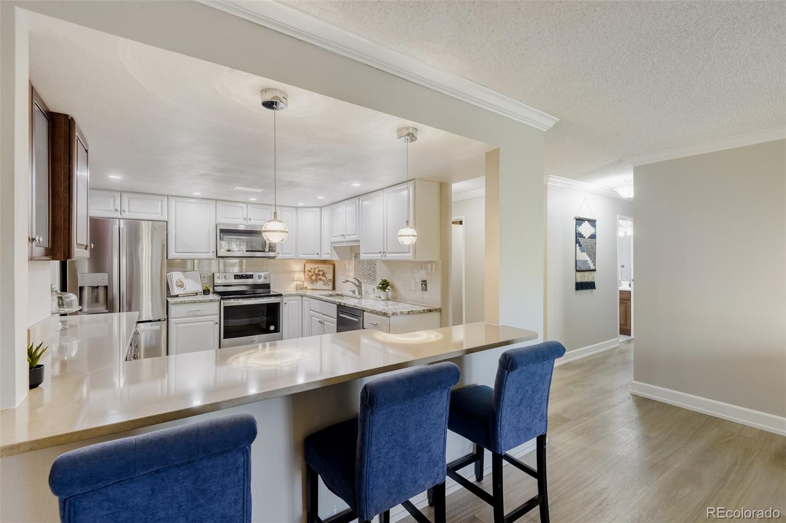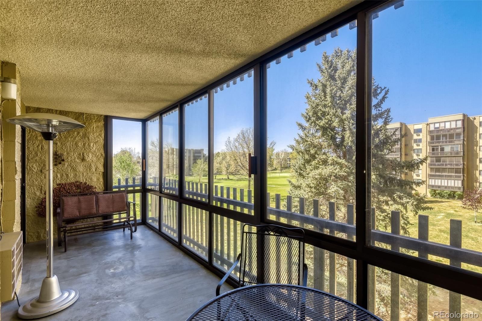 Welcome to elevated, low-maintenance living in the highly sought-after community of Heather Gardens. This beautifully remodeled 2-bedroom, 2-bathroom condo offers a perfect blend of style, comfort, and convenience—all set against serene golf course views. Step inside to discover a bright, open-concept floor plan designed for both everyday living and effortless entertaining. The kitchen has been thoughtfully opened up to maximize light and flow, featuring stylish cabinetry, stainless steel appliances, granite countertops, additional recessed lighting, and expanded built-in storage. Every detail has been elevated with crown molding, oversized baseboards, luxury vinyl plank flooring, and upgraded window coverings throughout. The spacious primary suite offers a peaceful retreat with generous closet space, while both the primary and guest bathrooms have been fully remodeled with high-end finishes that bring a touch of luxury to daily living. Just beyond the main living area, the enclosed lanai provides a perfect place to unwind and take in the beautifully maintained golf course views year-round. This unit also includes a reserved under-building parking space (#26) and a dedicated storage locker. Residents of Heather Gardens enjoy access to a recently updated, multi-million dollar clubhouse featuring an impressive array of amenities: indoor & outdoor pools, a full-service restaurant, fitness center, classes, billiards, woodworking shop, tennis and pickleball courts, and an executive 9-hole golf course. The community also has 24-hour security. Experience a vibrant, amenity-rich lifestyle in one of Colorado’s most beloved active adult communities—where value, community, and quality of life come together seamlessly. At closing, the buyer will be charged an Impound Fund Assessment equal to six times the current monthly HOA fee. Age and smoking restrictions apply. All HOA and CIC documents are available on the Heather Gardens website under the Resource tab.