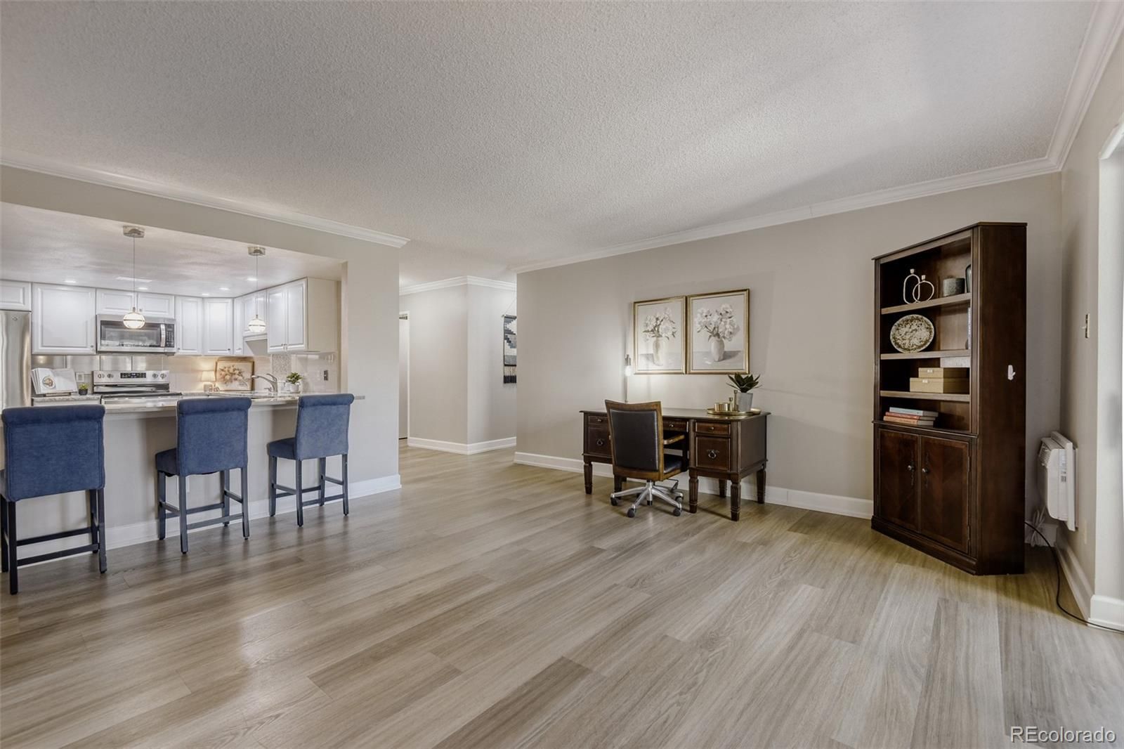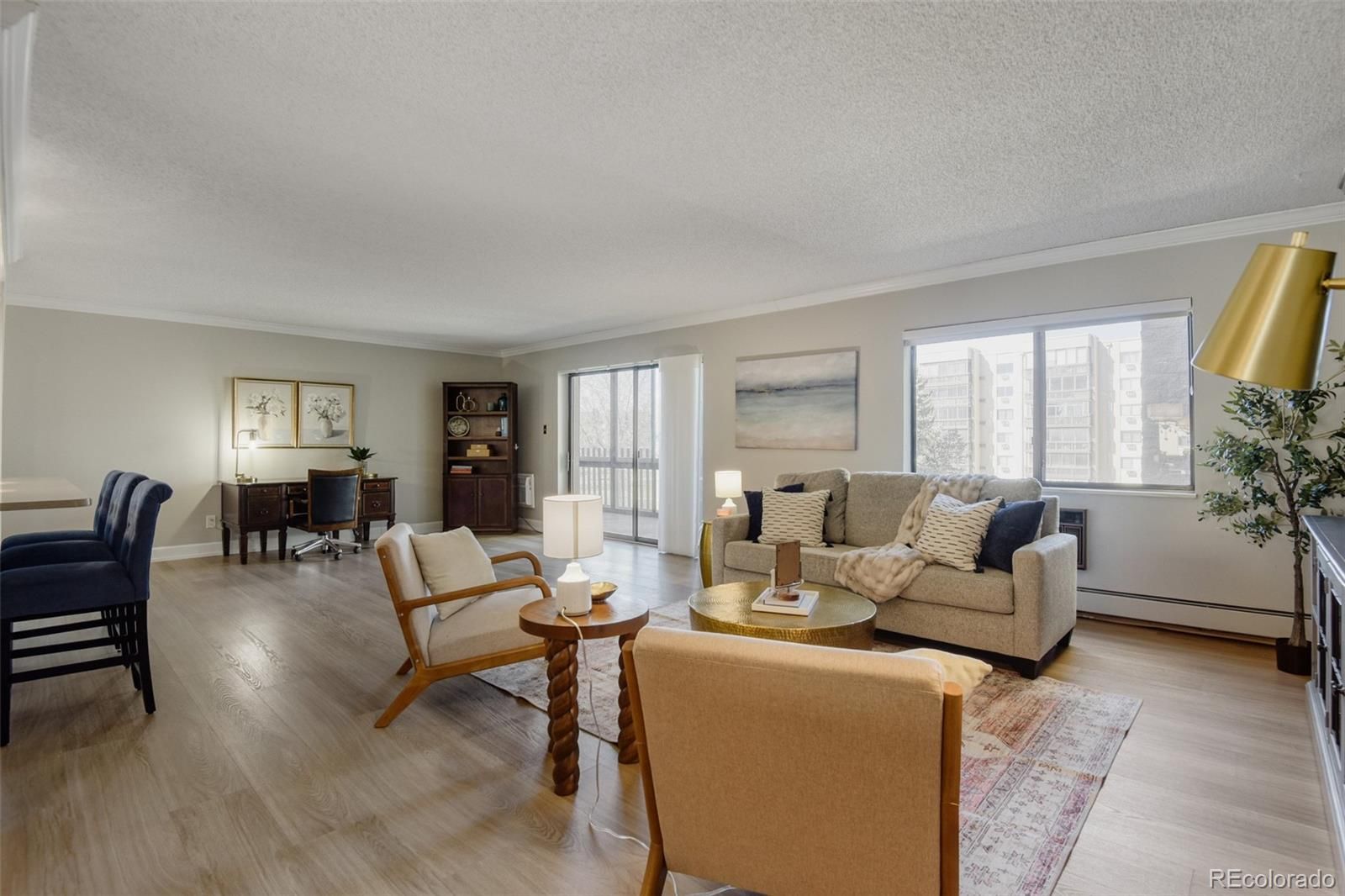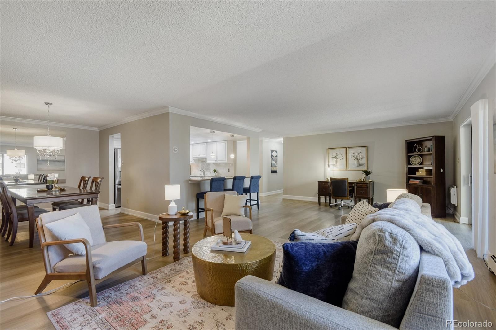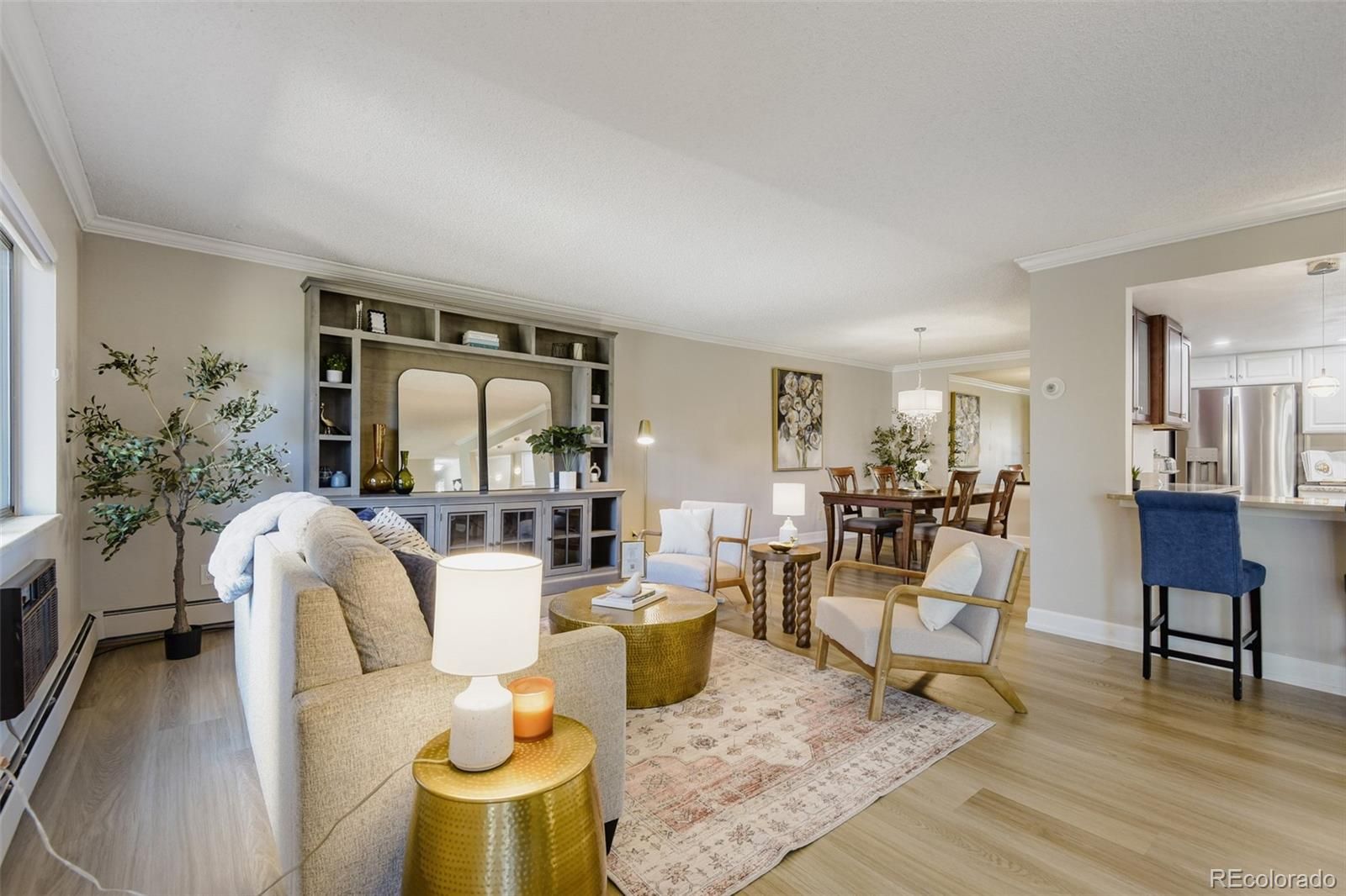 Welcome to elevated, low-maintenance living in the highly sought-after community of Heather Gardens. This beautifully remodeled 2-bedroom, 2-bathroom condo offers a perfect blend of style, comfort, and convenience—all set against serene golf course views. Step inside to discover a bright, open-concept floor plan designed for both everyday living and effortless entertaining. The kitchen has been thoughtfully opened up to maximize light and flow, featuring stylish cabinetry, stainless steel appliances, granite countertops, additional recessed lighting, and expanded built-in storage. Every detail has been elevated with crown molding, oversized baseboards, luxury vinyl plank flooring, and upgraded window coverings throughout. The spacious primary suite offers a peaceful retreat with generous closet space, while both the primary and guest bathrooms have been fully remodeled with high-end finishes that bring a touch of luxury to daily living. Just beyond the main living area, the enclosed lanai provides a perfect place to unwind and take in the beautifully maintained golf course views year-round. This unit also includes a reserved under-building parking space (#26) and a dedicated storage locker. Residents of Heather Gardens enjoy access to a recently updated, multi-million dollar clubhouse featuring an impressive array of amenities: indoor & outdoor pools, a full-service restaurant, fitness center, classes, billiards, woodworking shop, tennis and pickleball courts, and an executive 9-hole golf course. The community also has 24-hour security. Experience a vibrant, amenity-rich lifestyle in one of Colorado’s most beloved active adult communities—where value, community, and quality of life come together seamlessly. At closing, the buyer will be charged an Impound Fund Assessment equal to six times the current monthly HOA fee. Age and smoking restrictions apply. All HOA and CIC documents are available on the Heather Gardens website under the Resource tab.