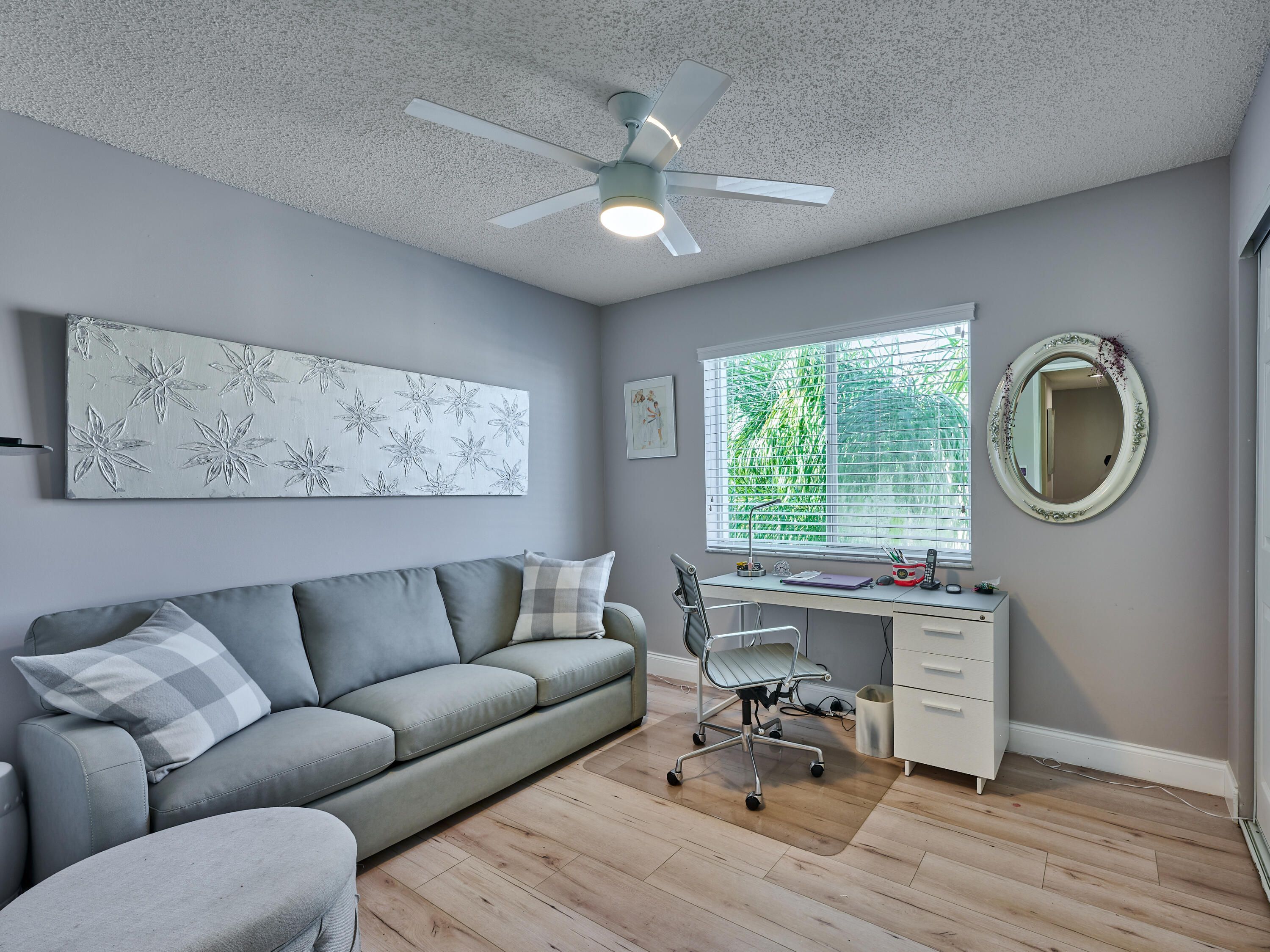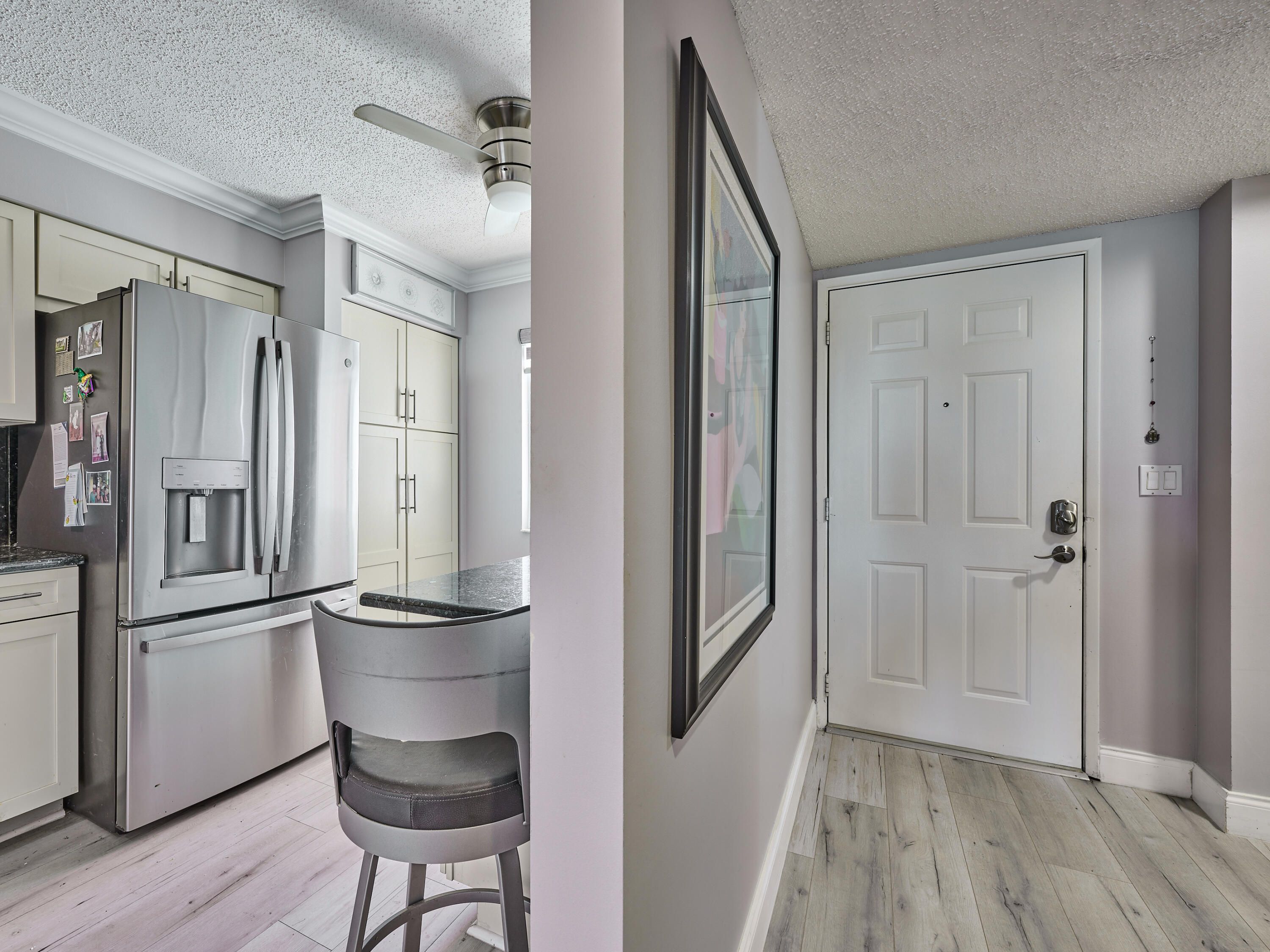 Beautifully updated 4th-floor corner penthouse in Huntington Pointe, one of Delray Beach's most desirable 55+ gated communities. This 2-bedroom, 2-bath plus den condo features an open layout with luxury vinyl plank floors, upgraded baseboards,crown molding, and abundant natural light. Enjoy long lake views from the spacious living room and the oversized master bedroom.The updated kitchen includes white shaker cabinets, granite countertops, tile backsplash, and stainless-steel appliances. Both bathrooms have been remodeled, including a large walk-in shower in the master bath. The versatile den can function as an office, guest space, or dining area. Additional features include a laundry room with full-size washer/dryer, 2019 A/C, 2023 water heater, and convenient assigned parking.