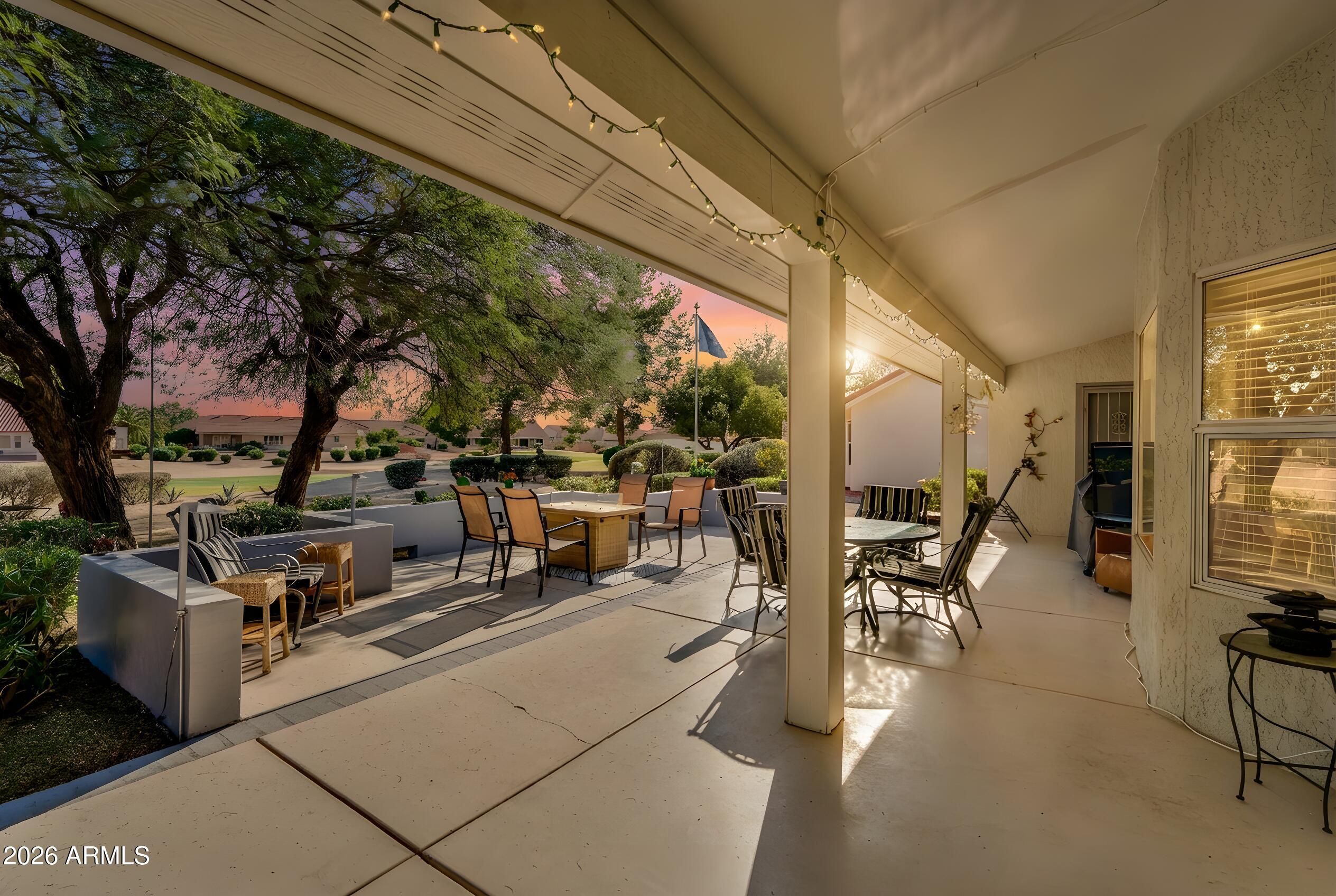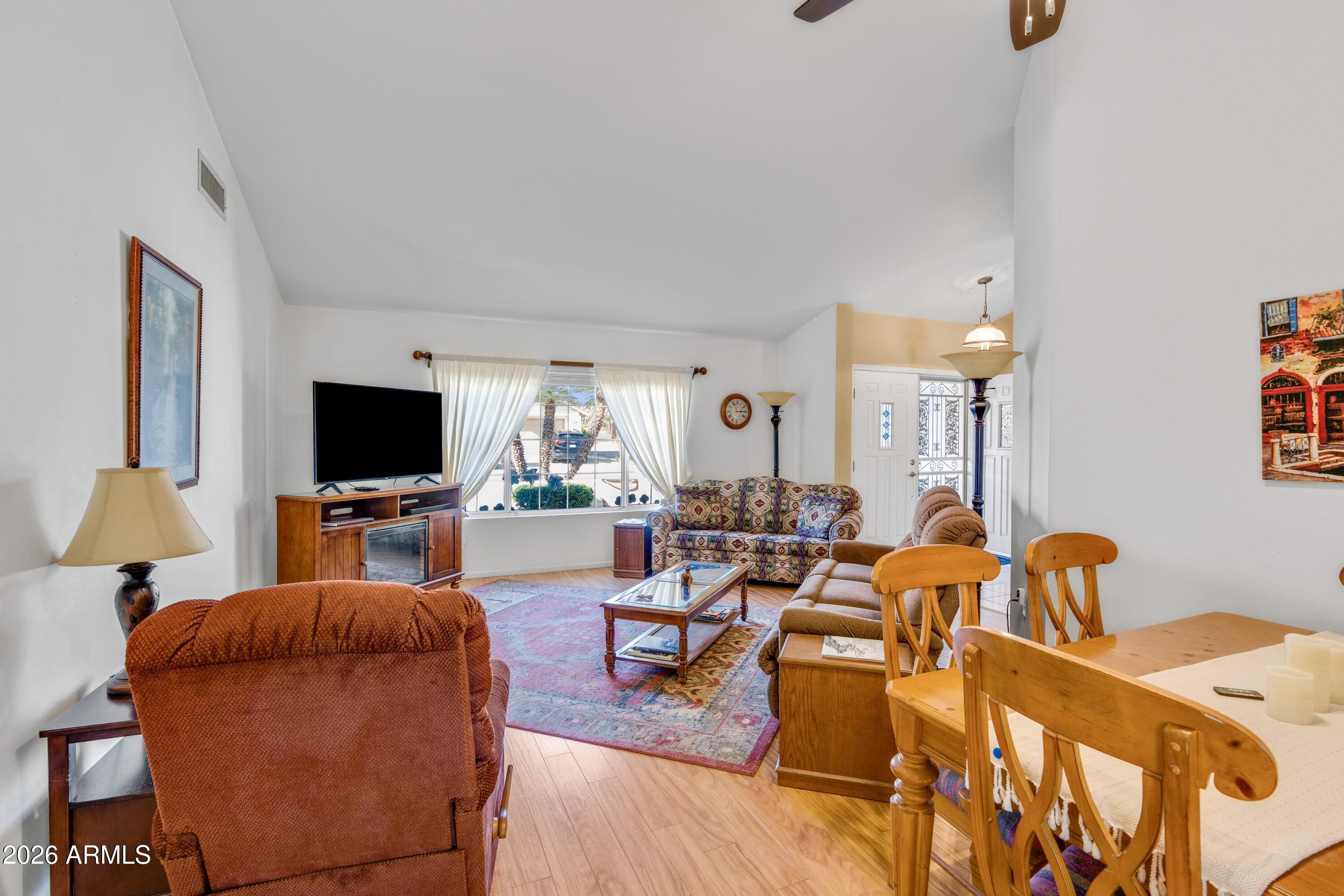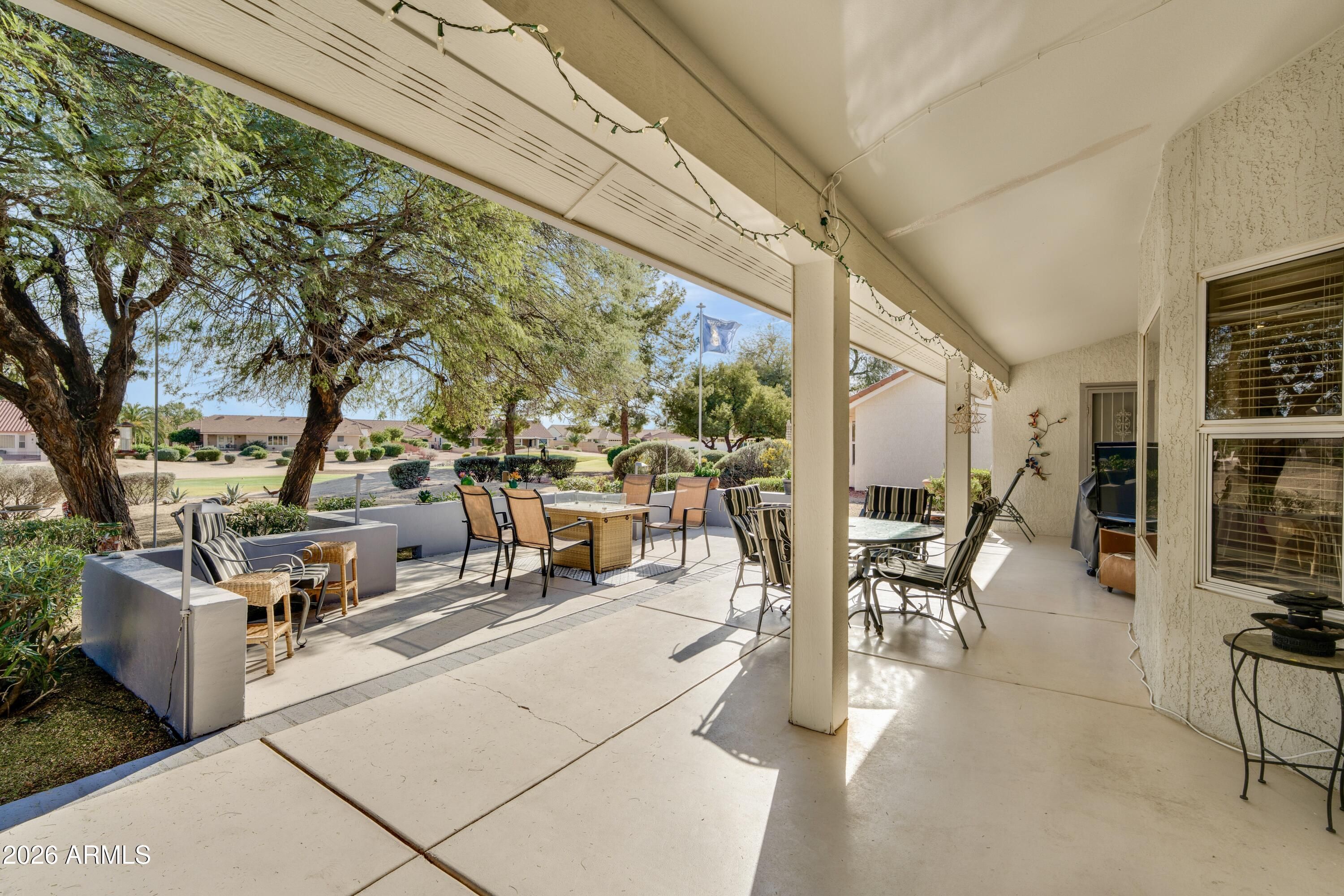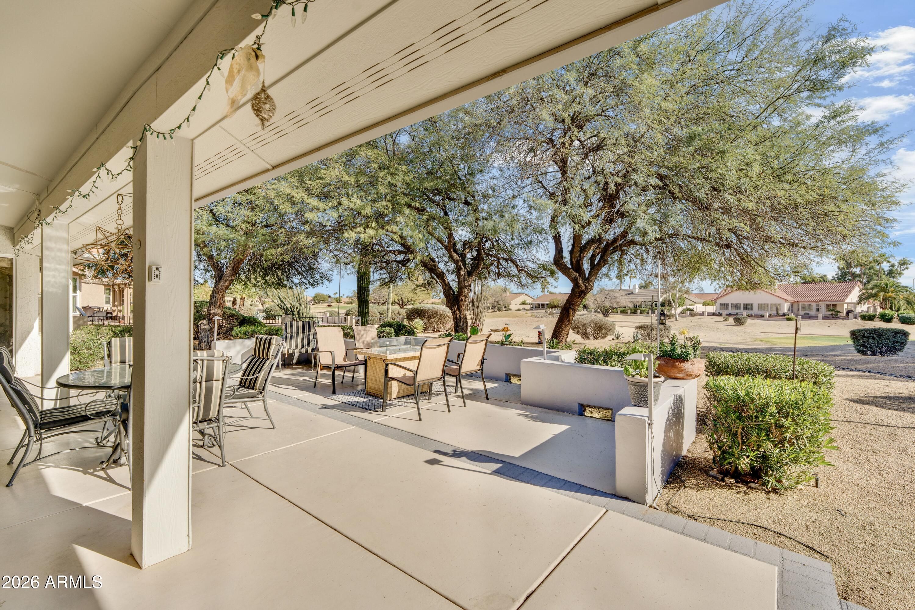 This desirable model offers a spacious layout highlighted by inviting double entry doors, vaulted ceilings, abundant natural light, two bay windows, and multiple living and entertaining areas—all overlooking the 4th tee box of the beautiful Trail Ridge Golf Course. The kitchen features newer stainless steel appliances, stone-inspired countertops, and cabinetry with convenient pull-outs, along with a cozy dinette that opens to the family room with built-in bookcases for added character and storage. The large indoor laundry room provides exceptional flexibility and even functions as a guest space with a built-in Murphy bed. Outdoor living truly shines with an extended south-facing patio offering both covered and open areas—perfect for taking in golf course views and the Arizona sunshine.