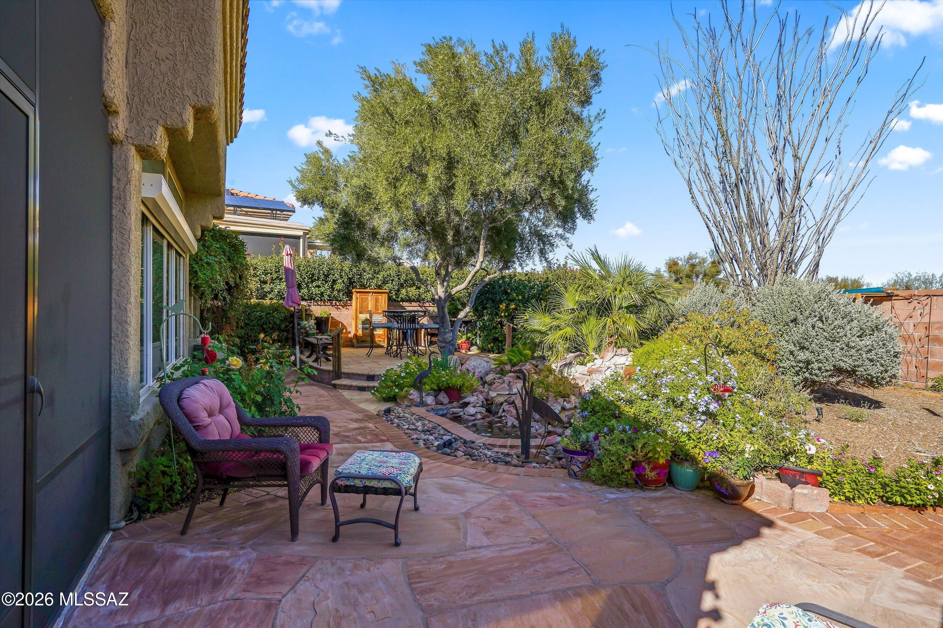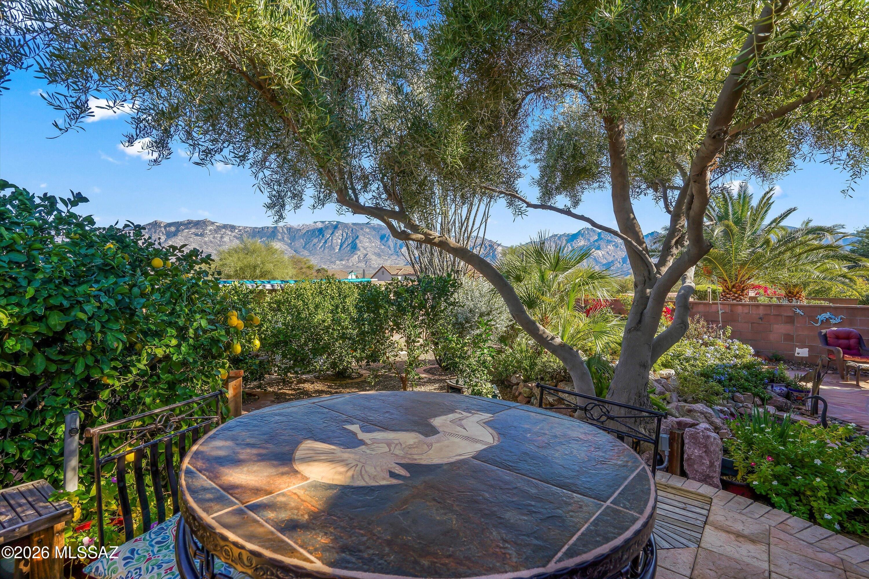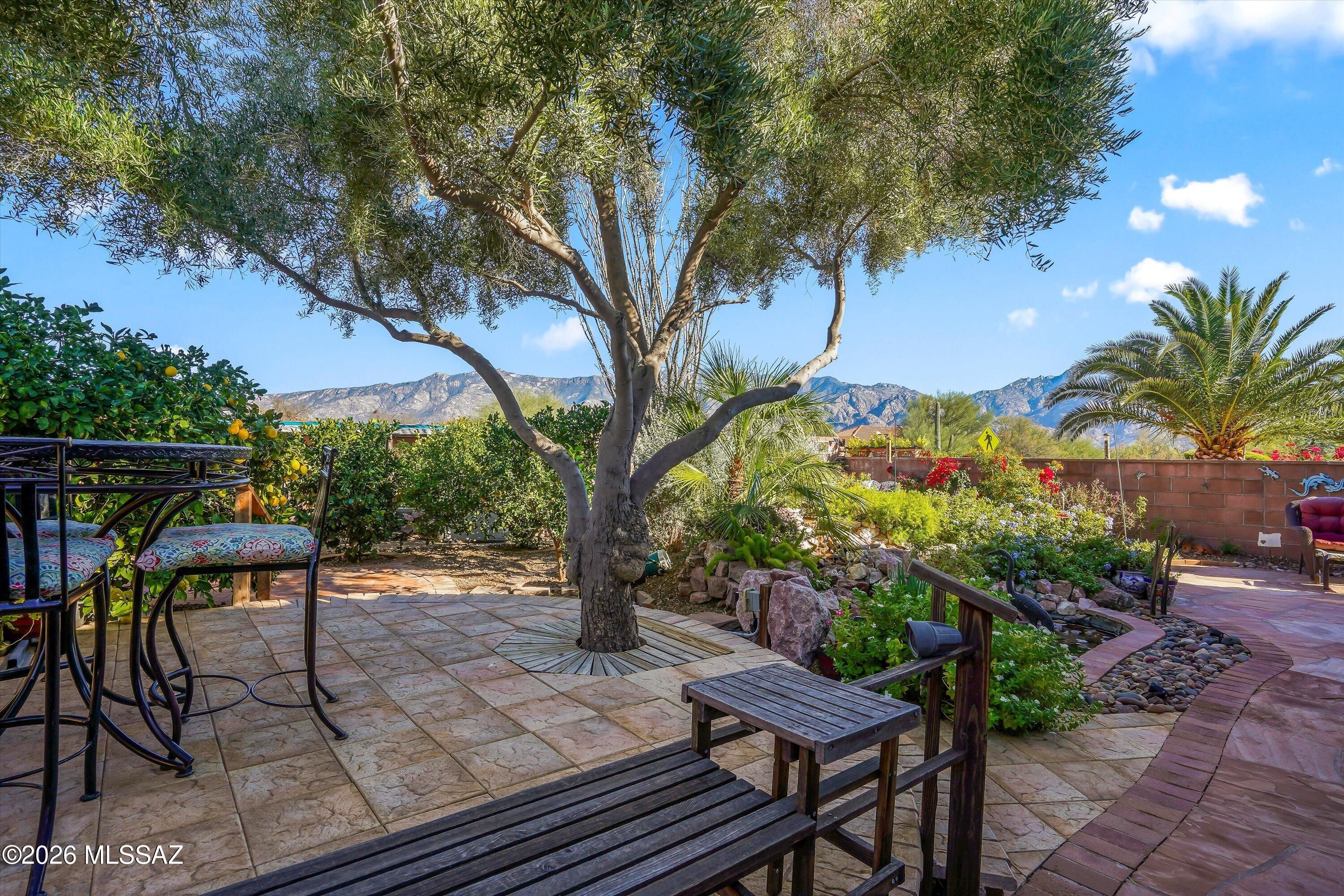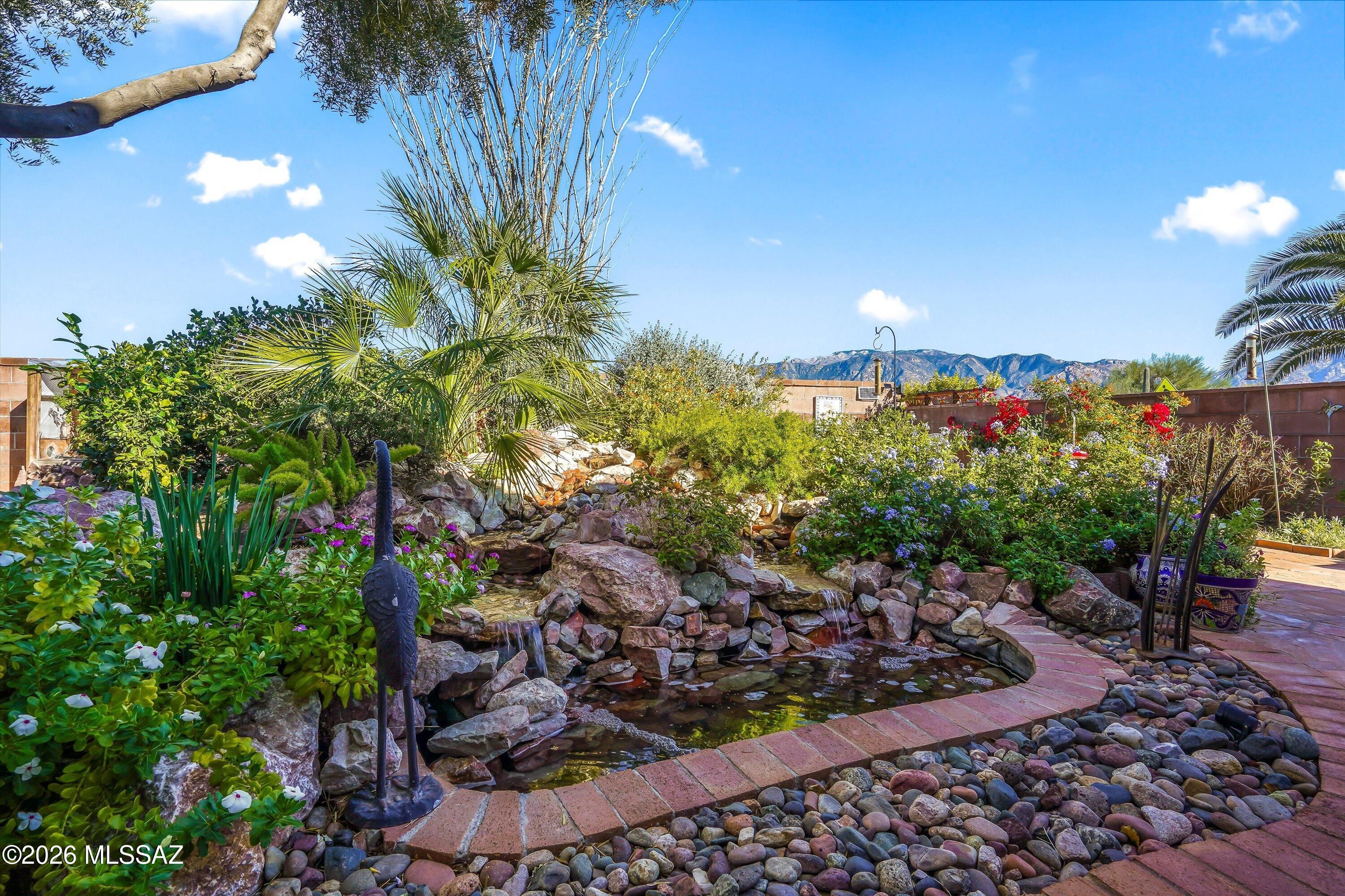 Spectacular 2BD/2BA (1,499 sq ft) home boasts an Arizona Room, owned Solar, plus a tranquil rear yard with rock waterfall, lush vegetation, rose garden and citrus trees, greenhouse and striking Catalina views. Enter to find an open concept living & dining room highlighted by soaring ceilings, large bay window plus accent windows. Relax in the casual Great room featuring tall view windows and a chef's kitchen with center island, granite counters, stainless & black appliances plus access to Arizona Room. Primary suite off Arizona Room hosts a walk-in closet and sleek bath with granite top vanity, glass front walk-in shower, illuminating skylight plus walk-in shelved linen closet. Guest room lies off hall bath with shower and skylight. Extended garage houses laundry with sink. Cascading