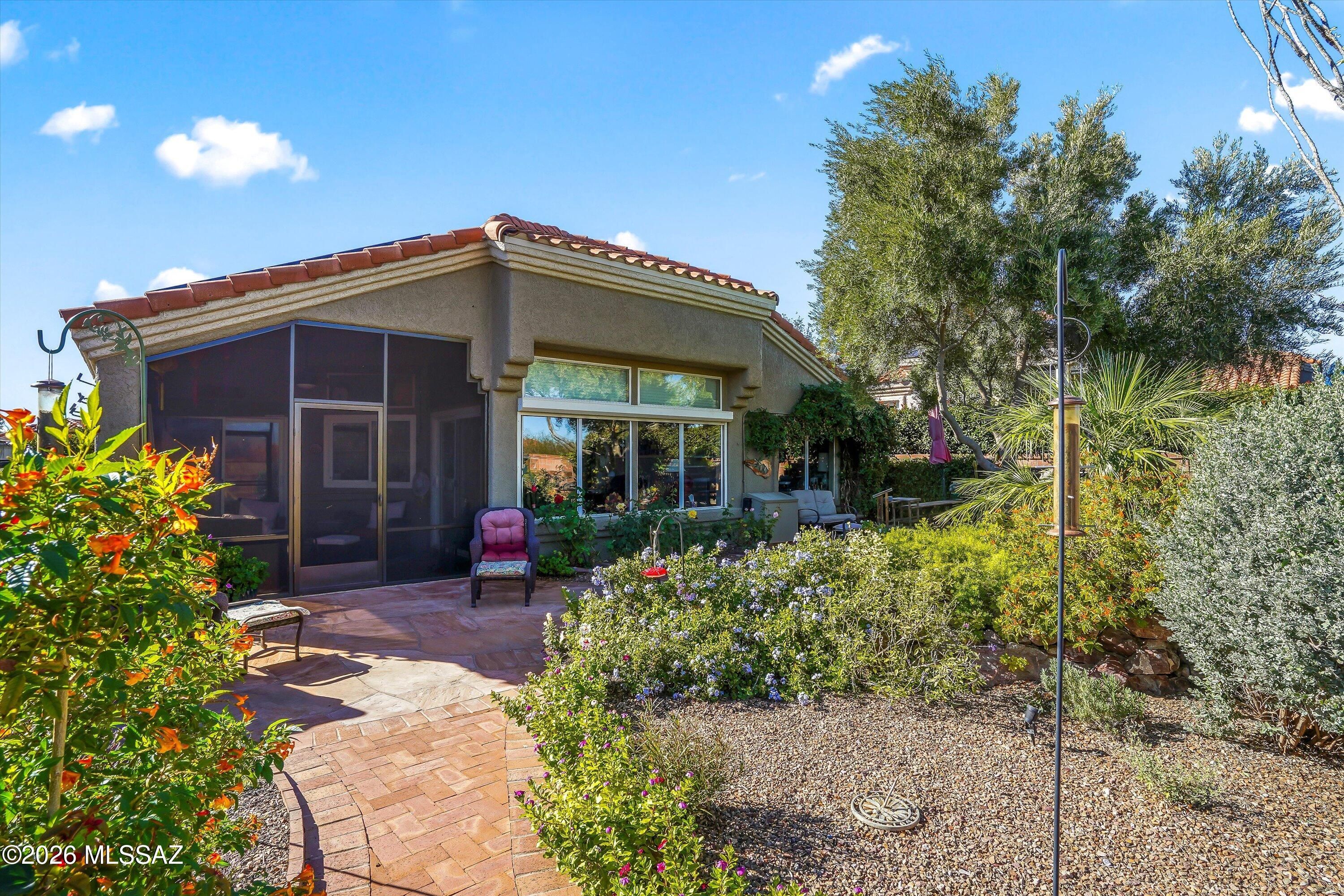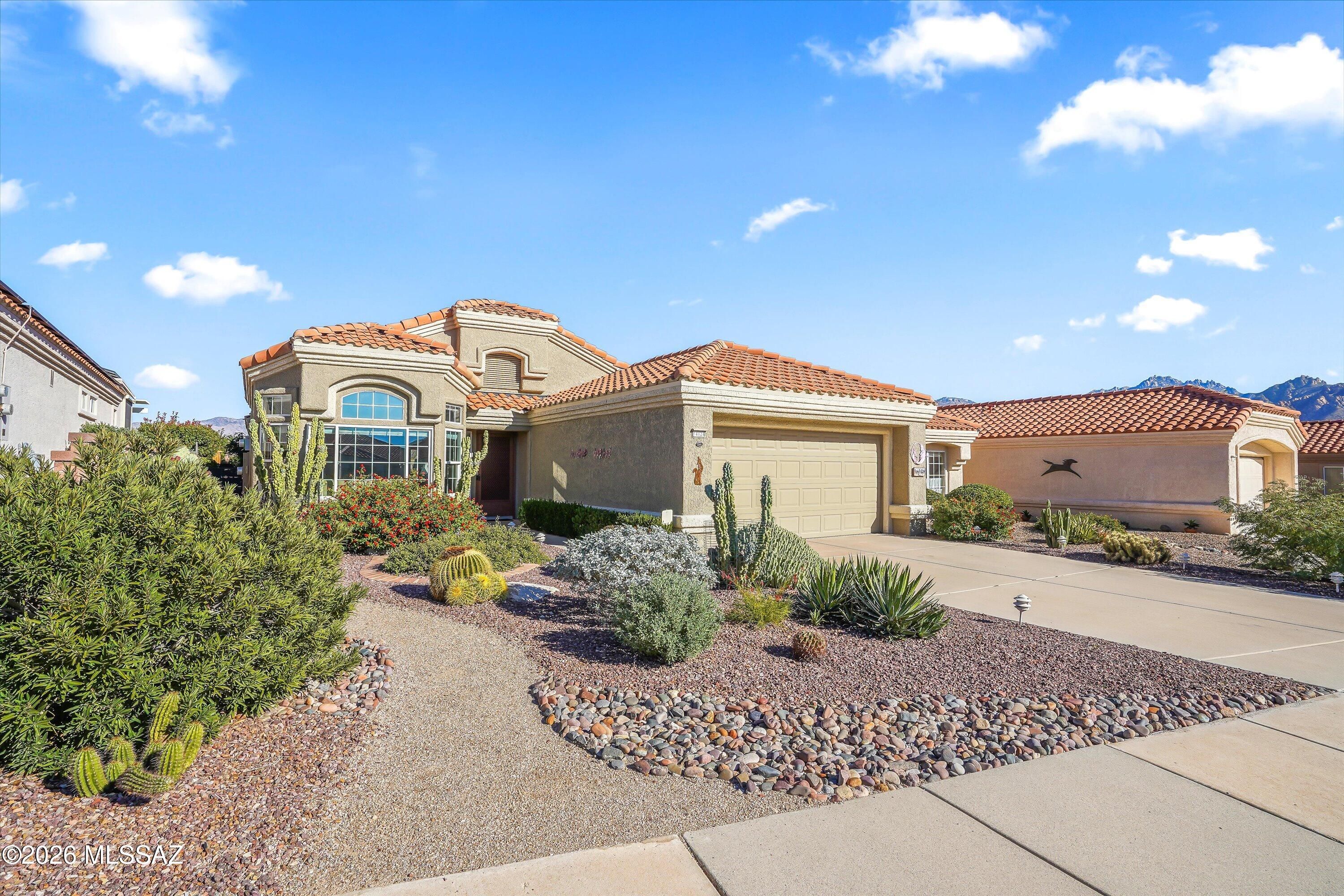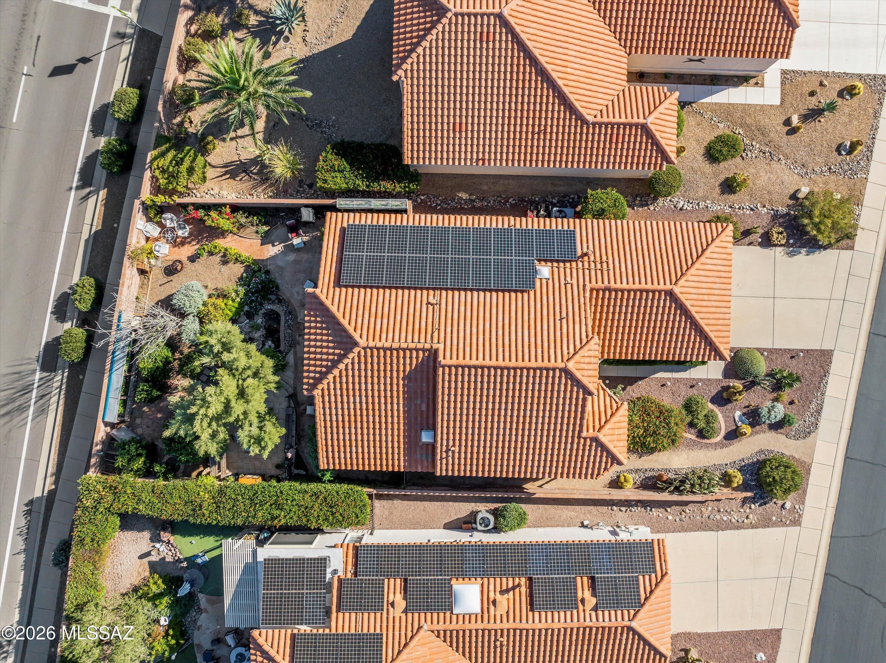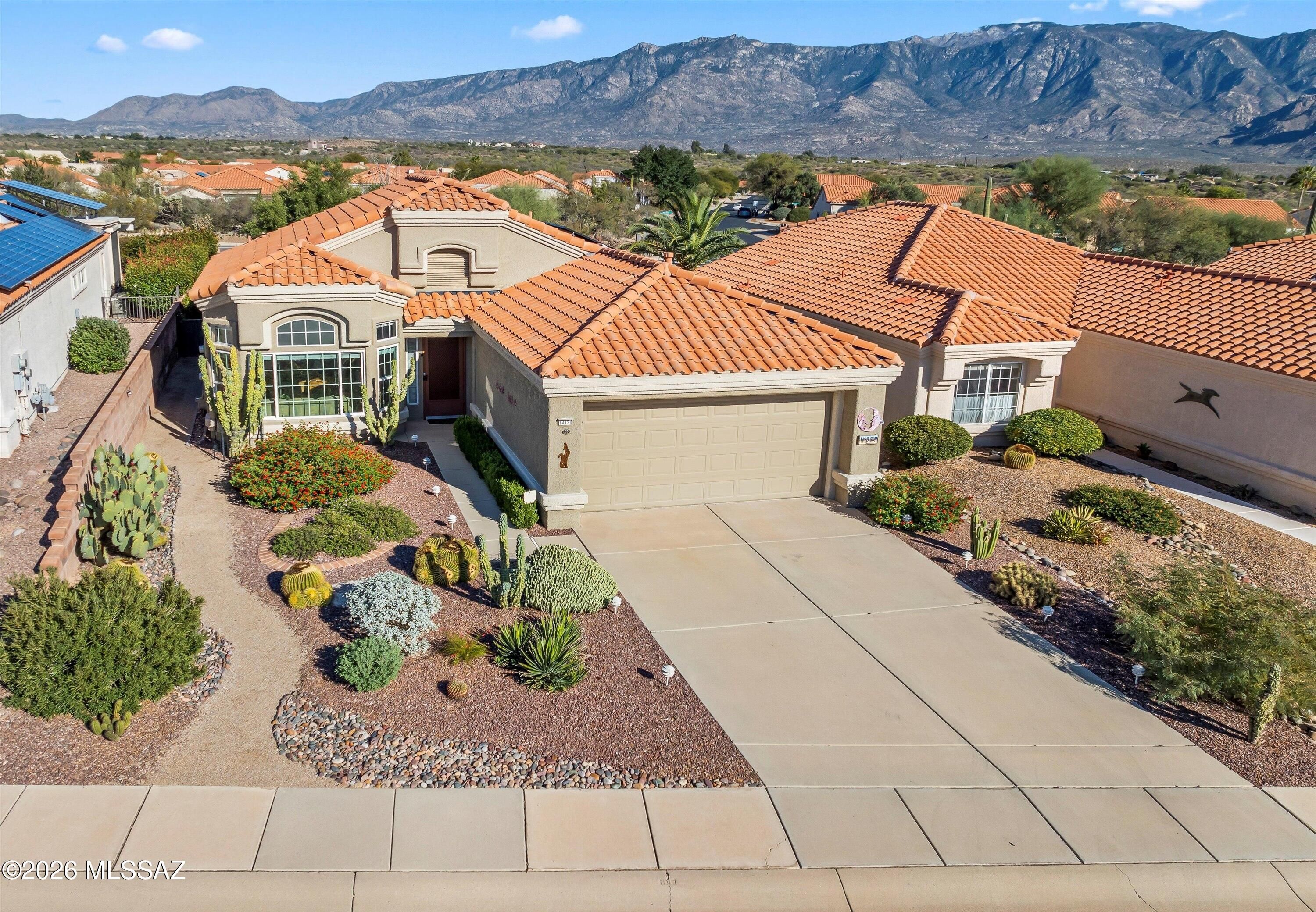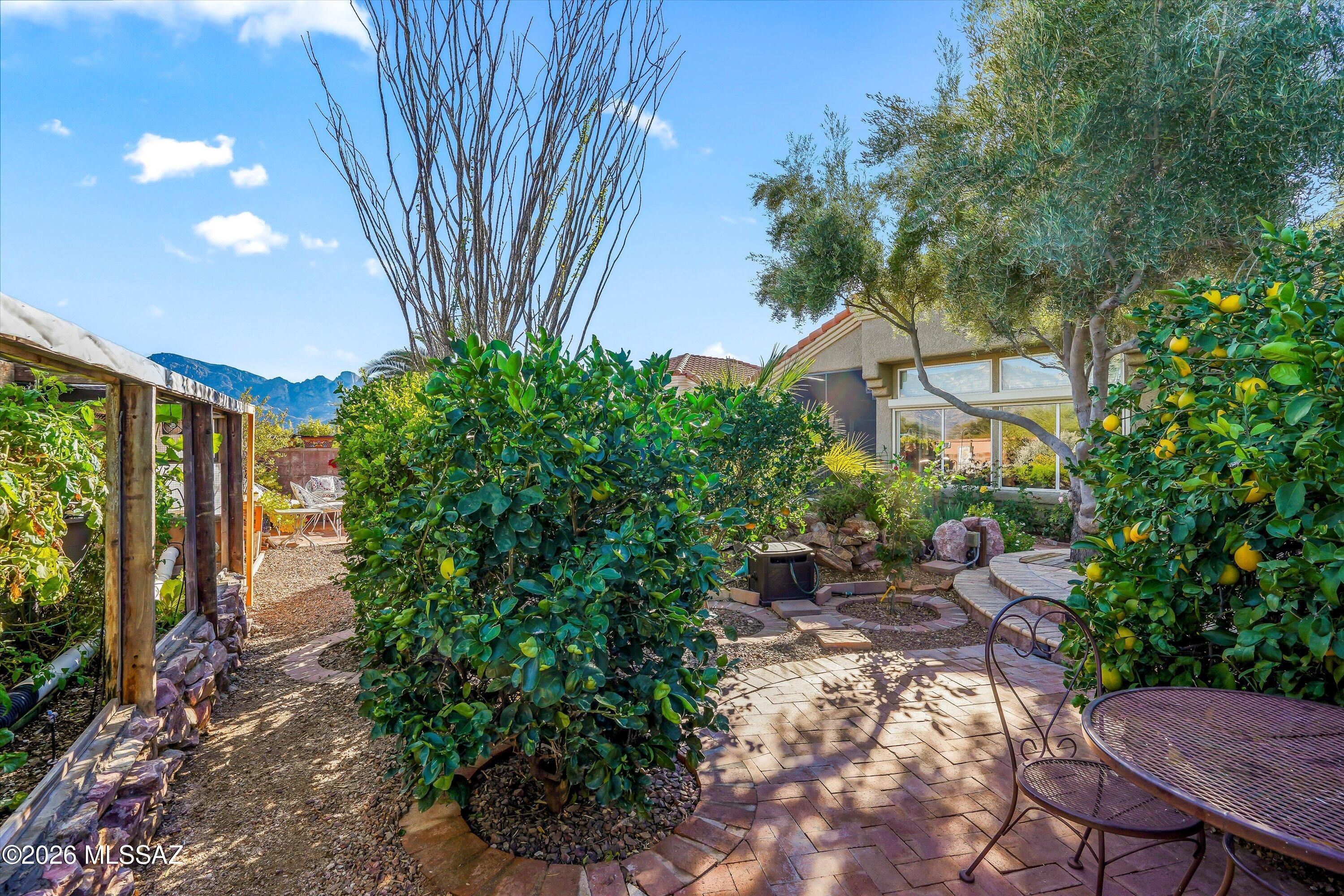 Spectacular 2BD/2BA (1,499 sq ft) home boasts an Arizona Room, owned Solar, plus a tranquil rear yard with rock waterfall, lush vegetation, rose garden and citrus trees, greenhouse and striking Catalina views. Enter to find an open concept living & dining room highlighted by soaring ceilings, large bay window plus accent windows. Relax in the casual Great room featuring tall view windows and a chef's kitchen with center island, granite counters, stainless & black appliances plus access to Arizona Room. Primary suite off Arizona Room hosts a walk-in closet and sleek bath with granite top vanity, glass front walk-in shower, illuminating skylight plus walk-in shelved linen closet. Guest room lies off hall bath with shower and skylight. Extended garage houses laundry with sink. Cascading