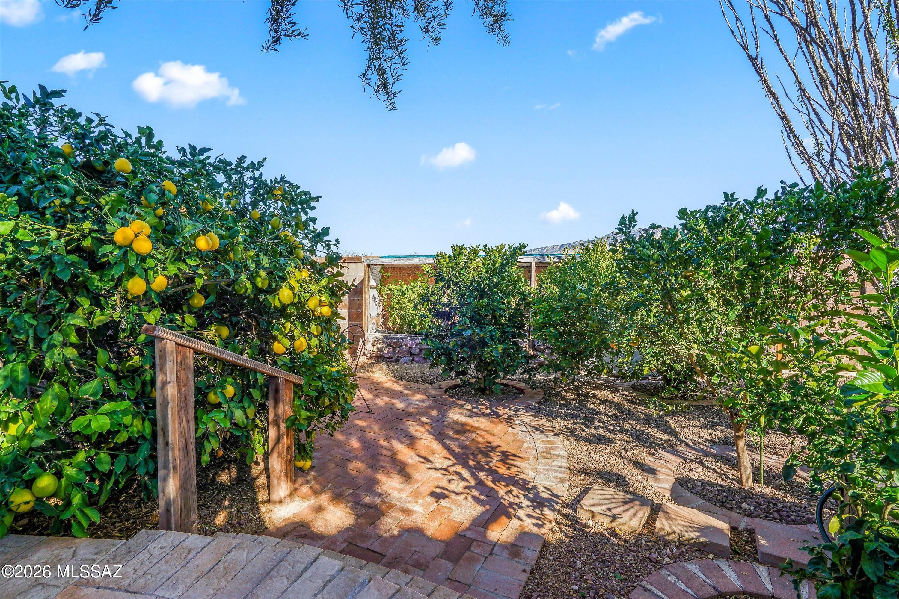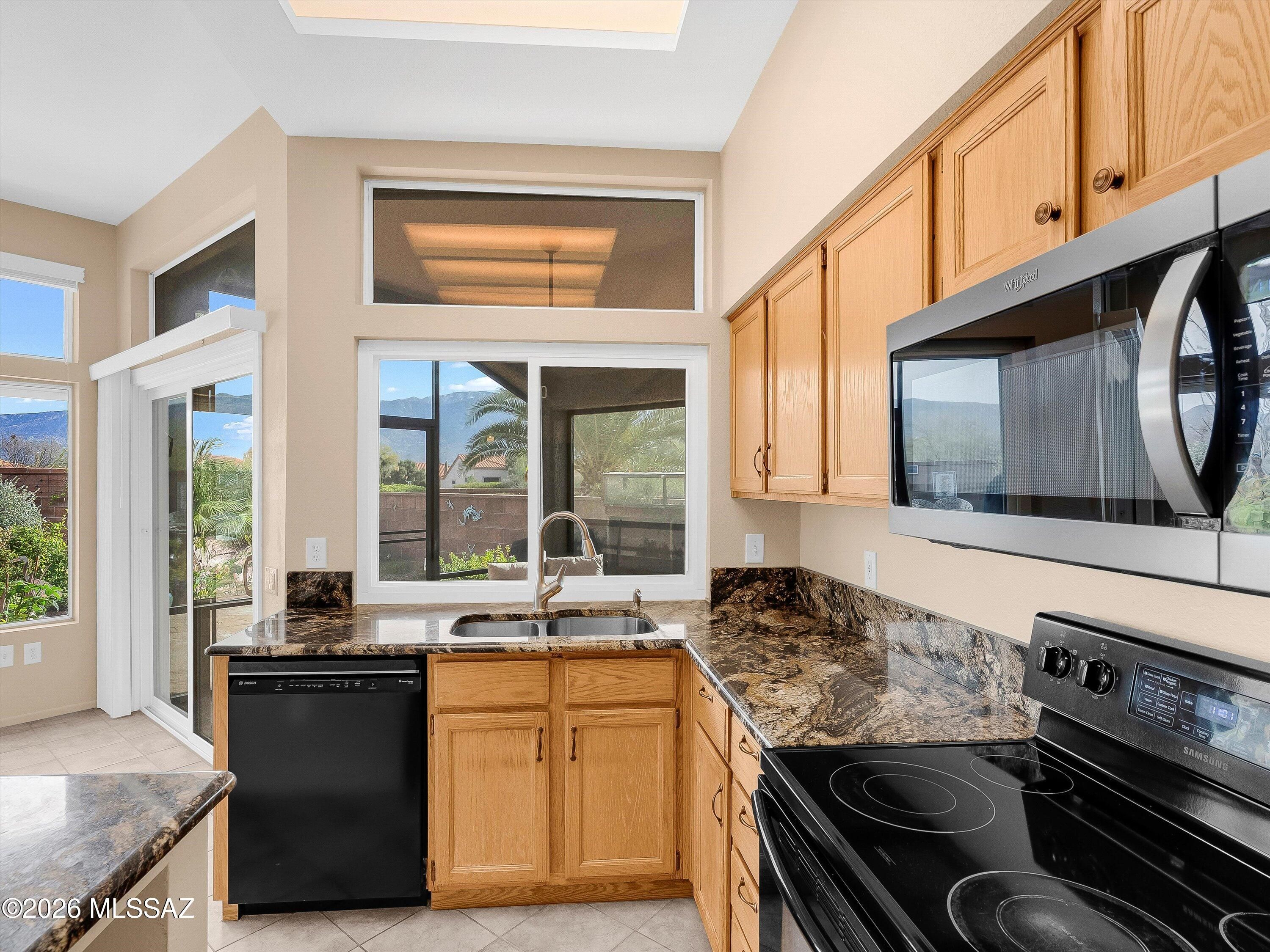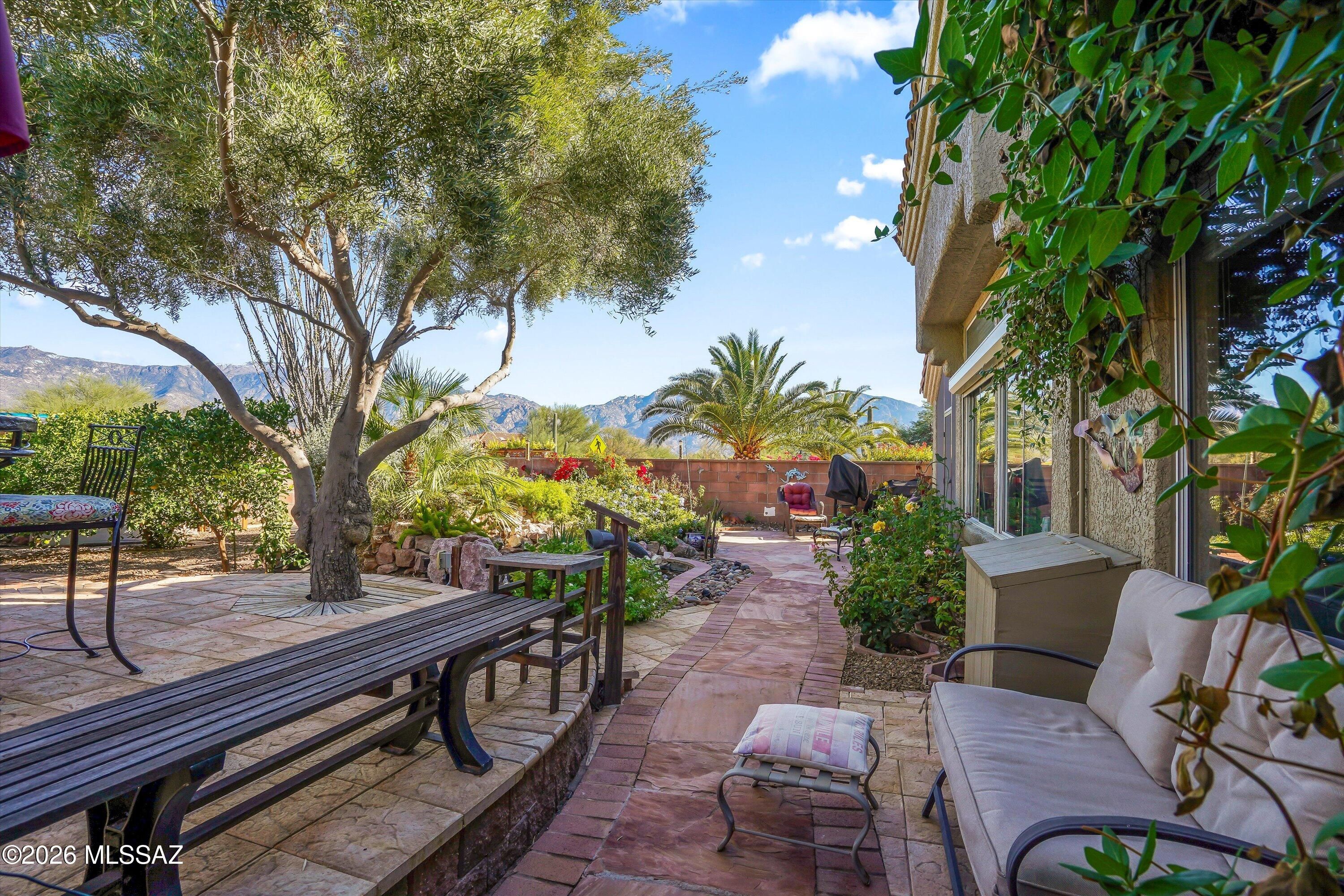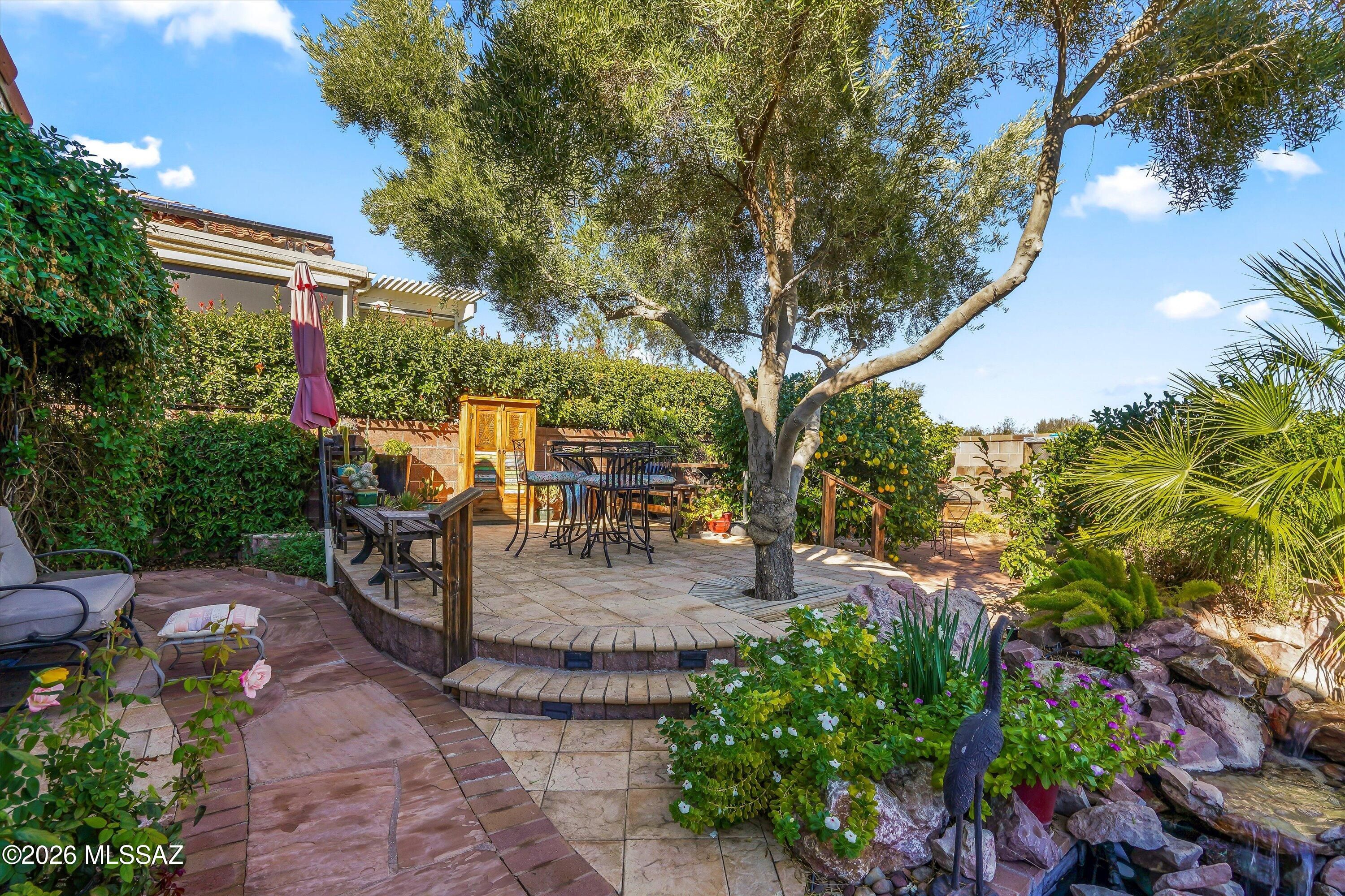 Spectacular 2BD/2BA (1,499 sq ft) home boasts an Arizona Room, owned Solar, plus a tranquil rear yard with rock waterfall, lush vegetation, rose garden and citrus trees, greenhouse and striking Catalina views. Enter to find an open concept living & dining room highlighted by soaring ceilings, large bay window plus accent windows. Relax in the casual Great room featuring tall view windows and a chef's kitchen with center island, granite counters, stainless & black appliances plus access to Arizona Room. Primary suite off Arizona Room hosts a walk-in closet and sleek bath with granite top vanity, glass front walk-in shower, illuminating skylight plus walk-in shelved linen closet. Guest room lies off hall bath with shower and skylight. Extended garage houses laundry with sink. Cascading