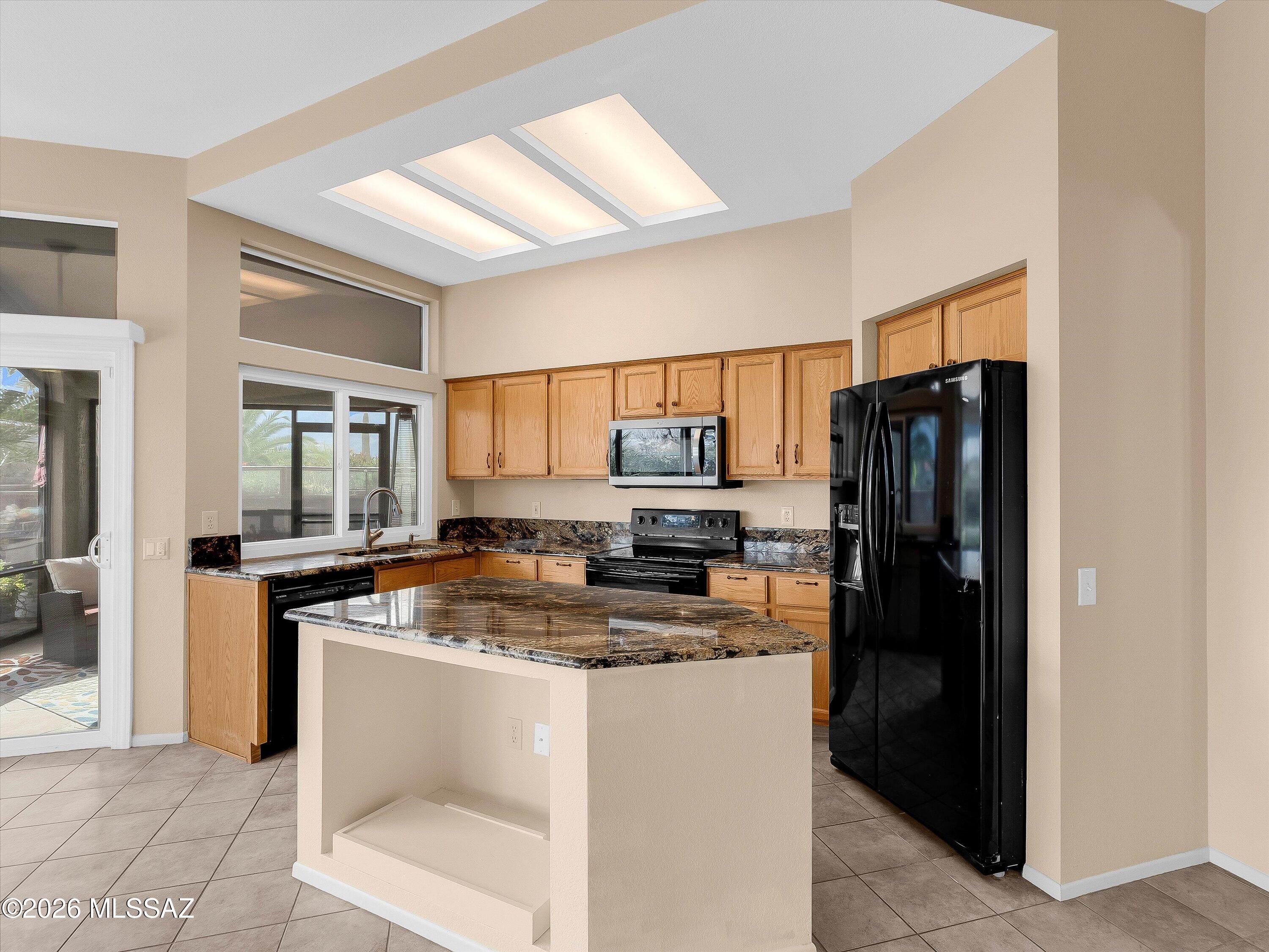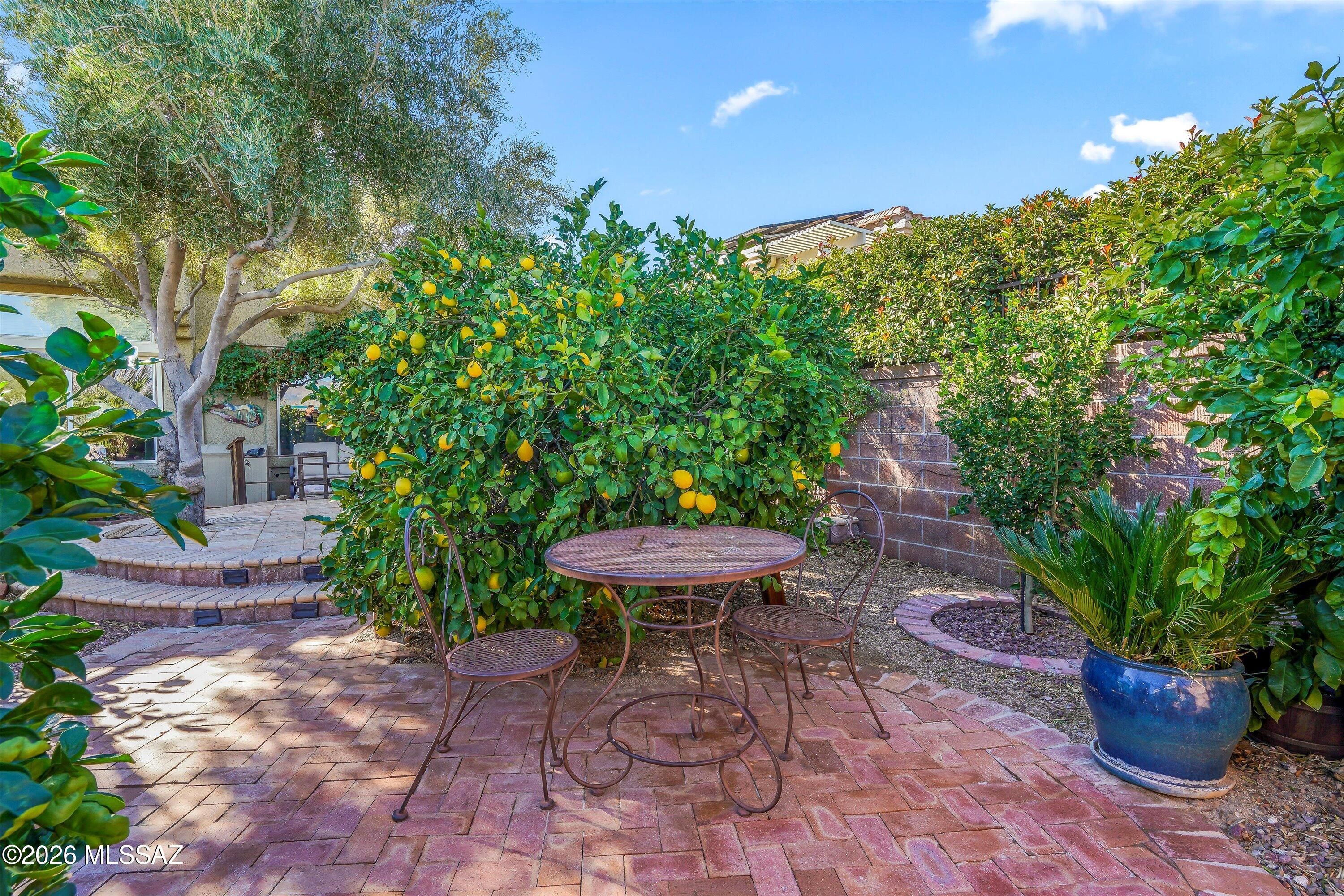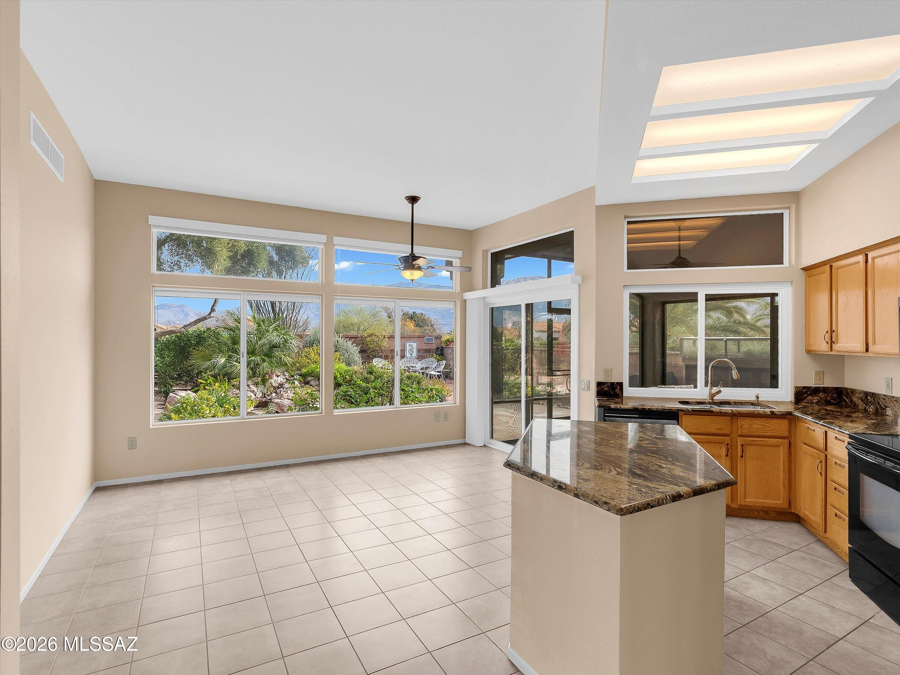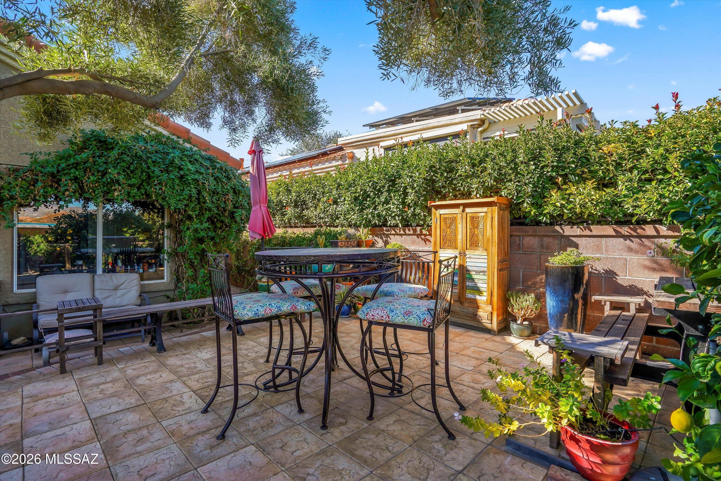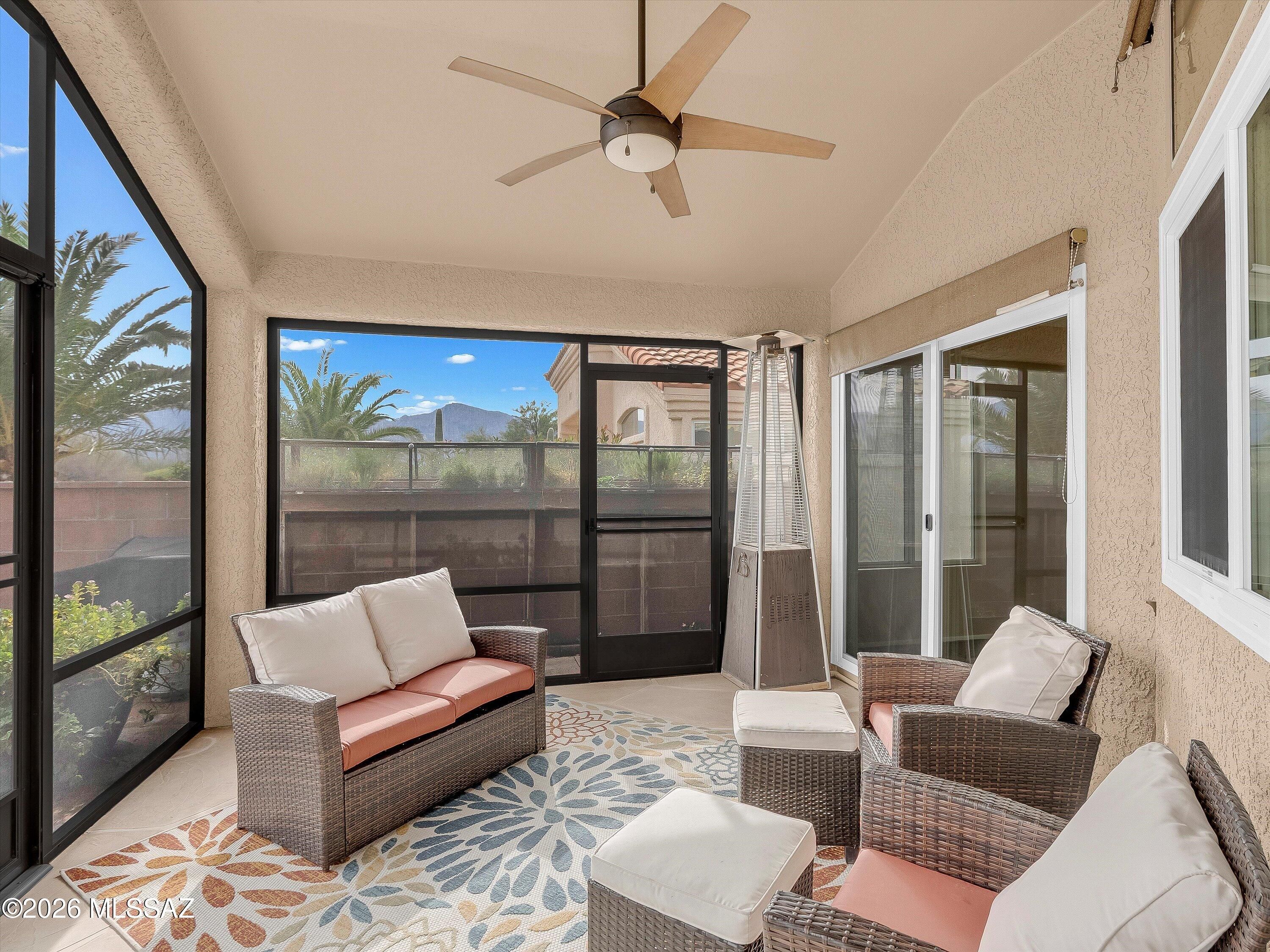 Spectacular 2BD/2BA (1,499 sq ft) home boasts an Arizona Room, owned Solar, plus a tranquil rear yard with rock waterfall, lush vegetation, rose garden and citrus trees, greenhouse and striking Catalina views. Enter to find an open concept living & dining room highlighted by soaring ceilings, large bay window plus accent windows. Relax in the casual Great room featuring tall view windows and a chef's kitchen with center island, granite counters, stainless & black appliances plus access to Arizona Room. Primary suite off Arizona Room hosts a walk-in closet and sleek bath with granite top vanity, glass front walk-in shower, illuminating skylight plus walk-in shelved linen closet. Guest room lies off hall bath with shower and skylight. Extended garage houses laundry with sink. Cascading