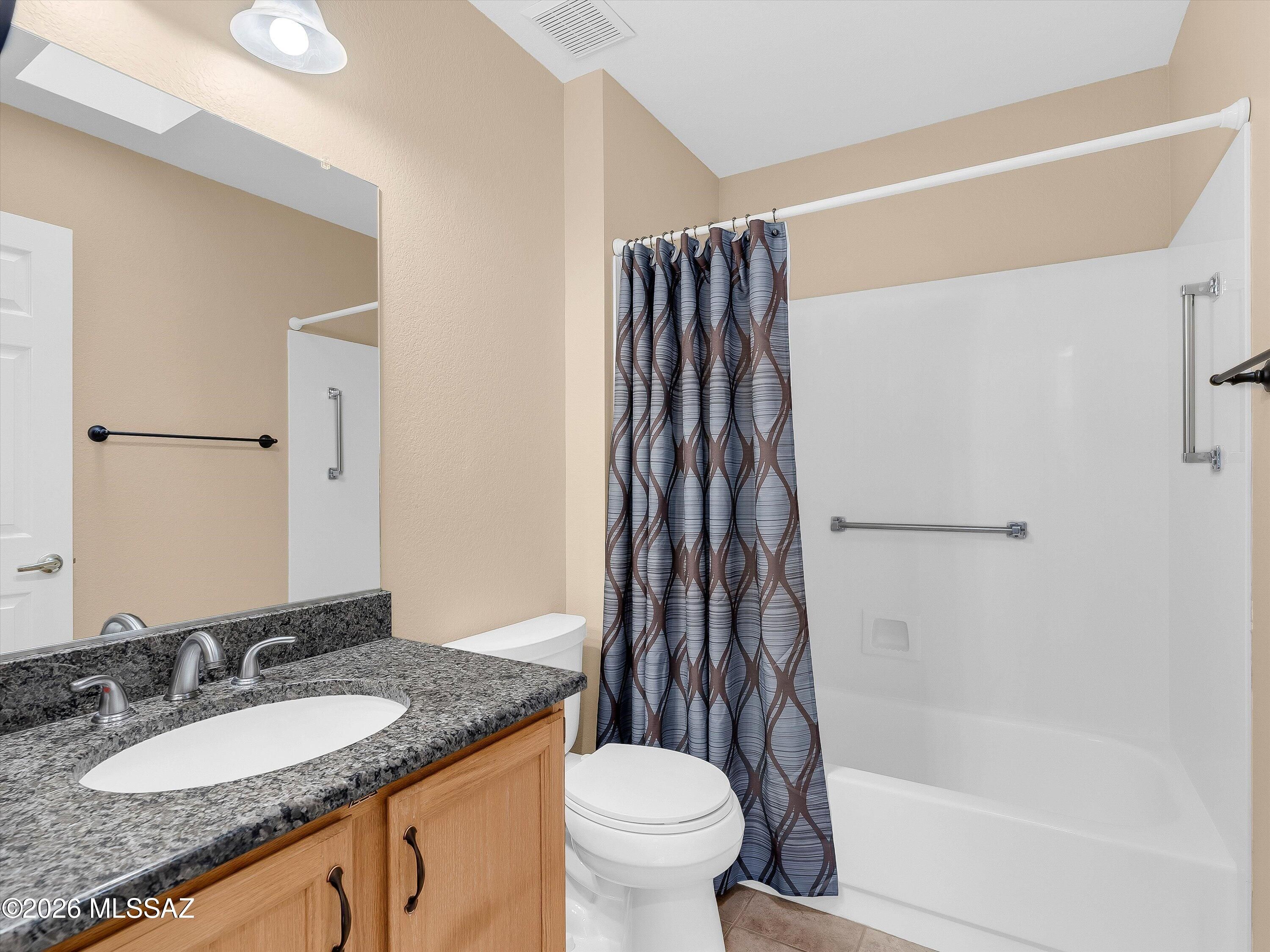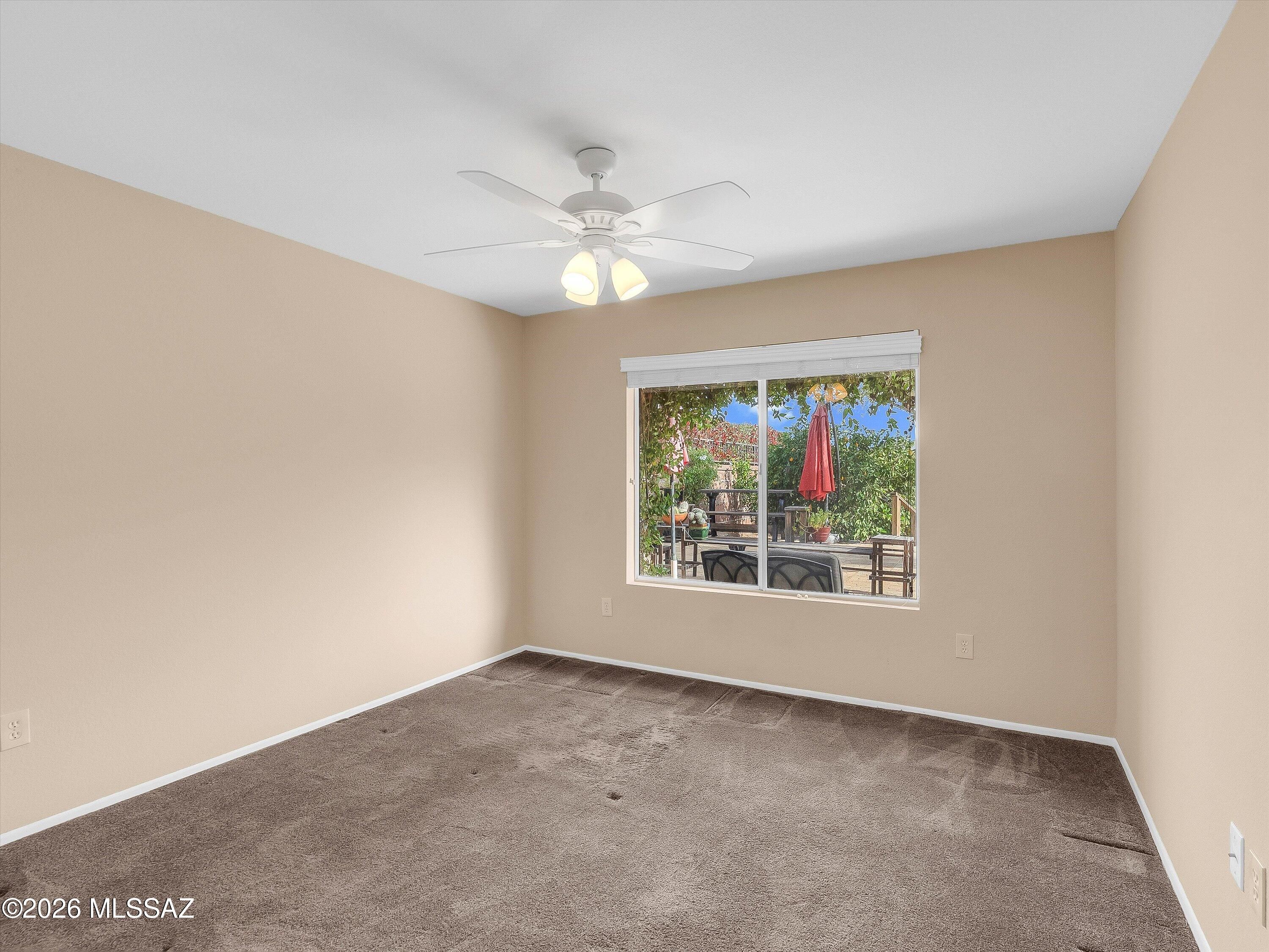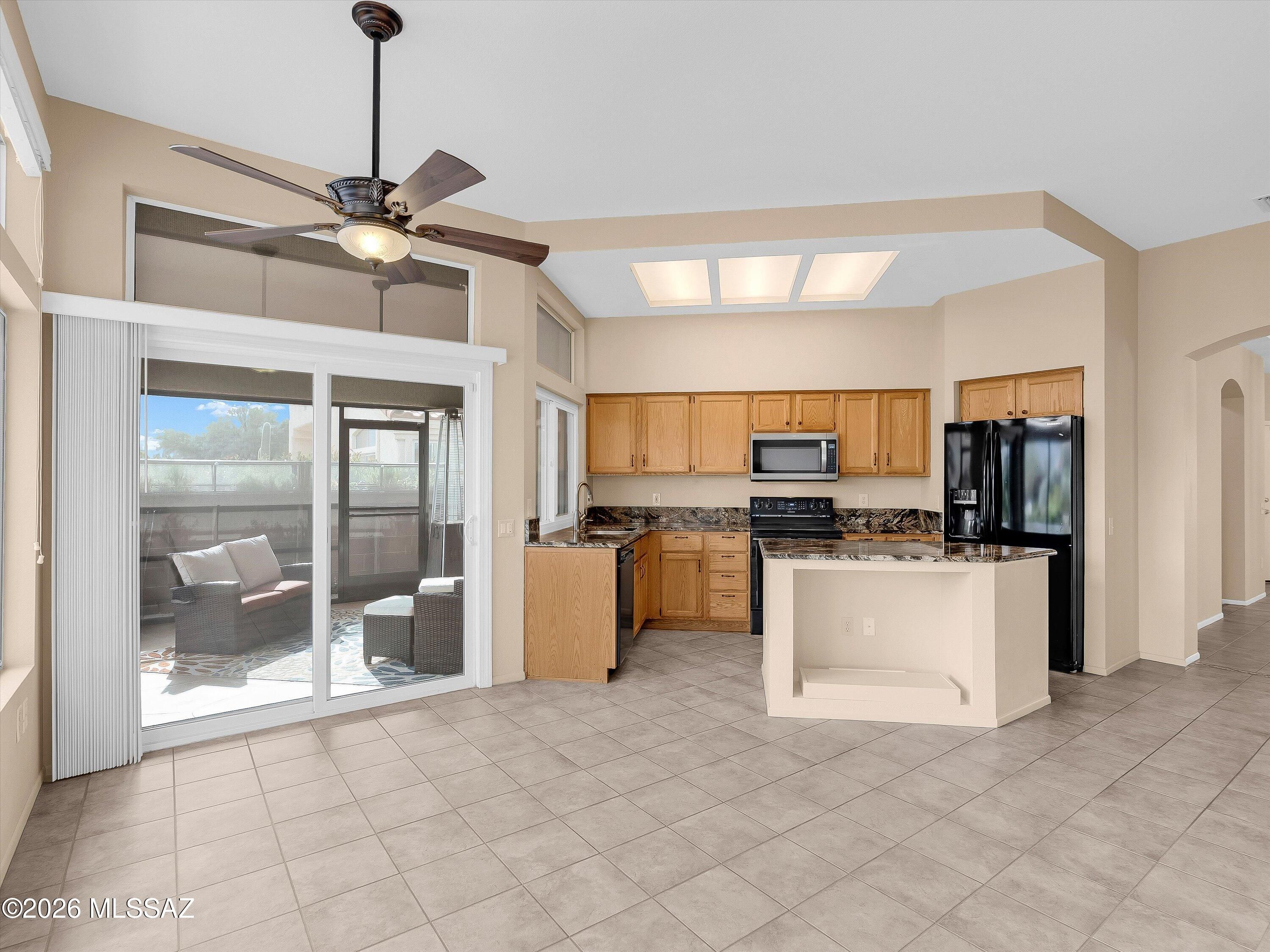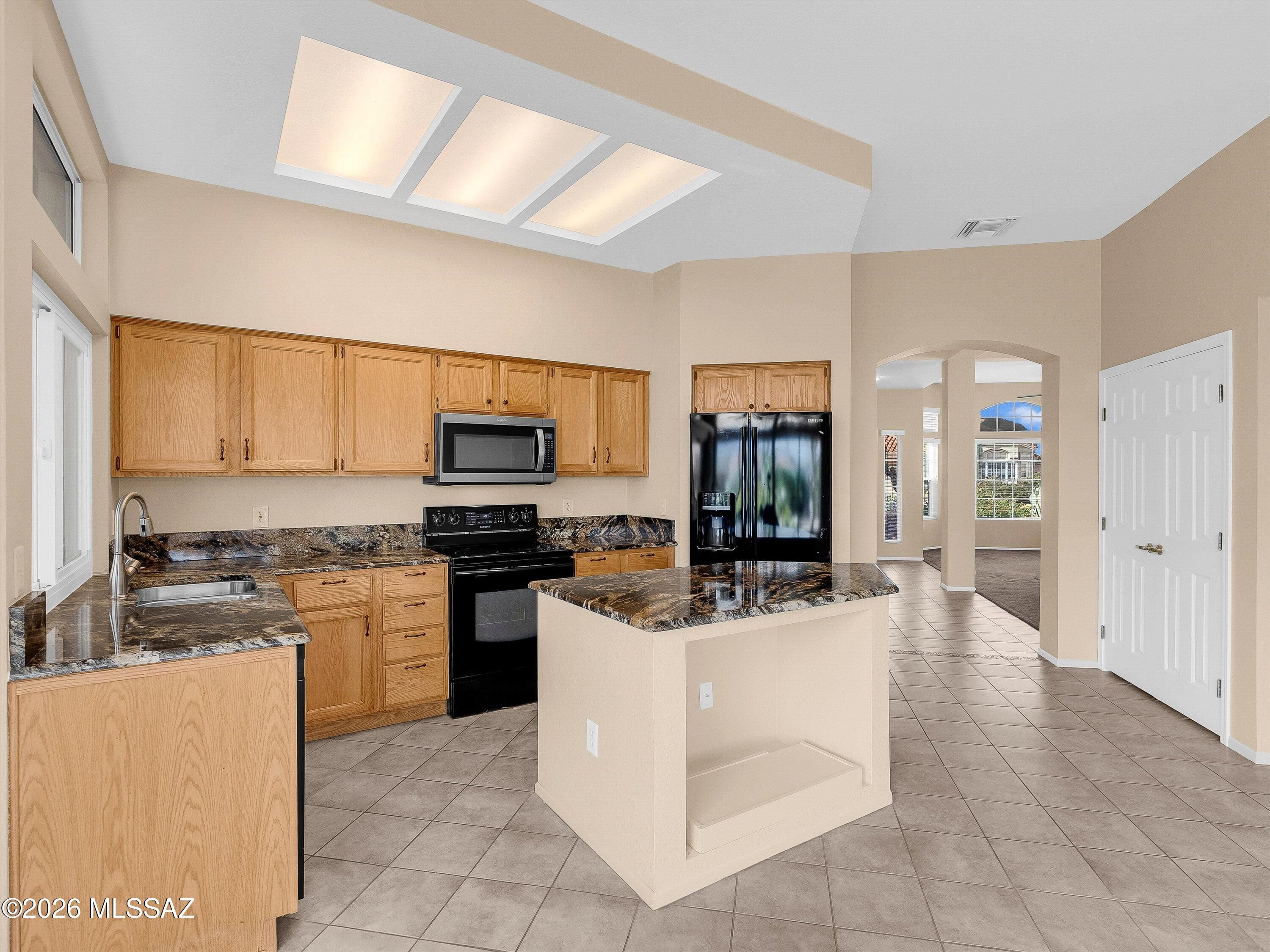 Spectacular 2BD/2BA (1,499 sq ft) home boasts an Arizona Room, owned Solar, plus a tranquil rear yard with rock waterfall, lush vegetation, rose garden and citrus trees, greenhouse and striking Catalina views. Enter to find an open concept living & dining room highlighted by soaring ceilings, large bay window plus accent windows. Relax in the casual Great room featuring tall view windows and a chef's kitchen with center island, granite counters, stainless & black appliances plus access to Arizona Room. Primary suite off Arizona Room hosts a walk-in closet and sleek bath with granite top vanity, glass front walk-in shower, illuminating skylight plus walk-in shelved linen closet. Guest room lies off hall bath with shower and skylight. Extended garage houses laundry with sink. Cascading