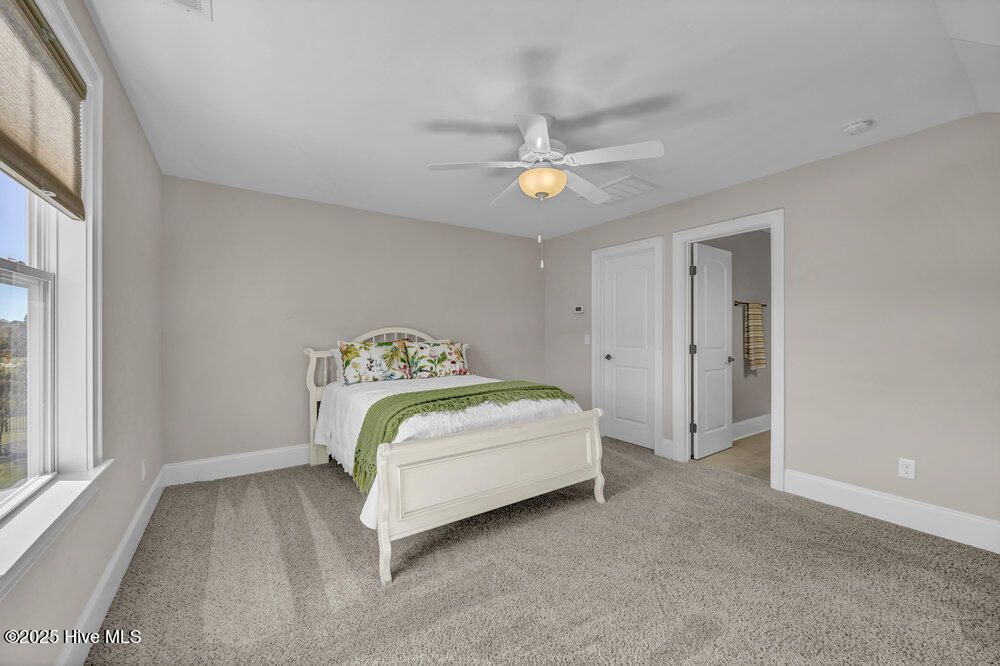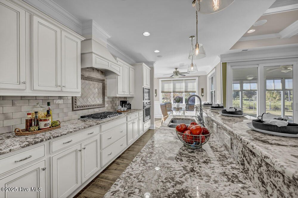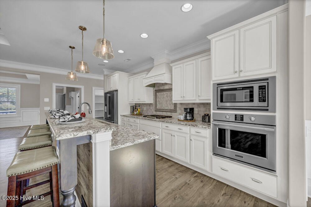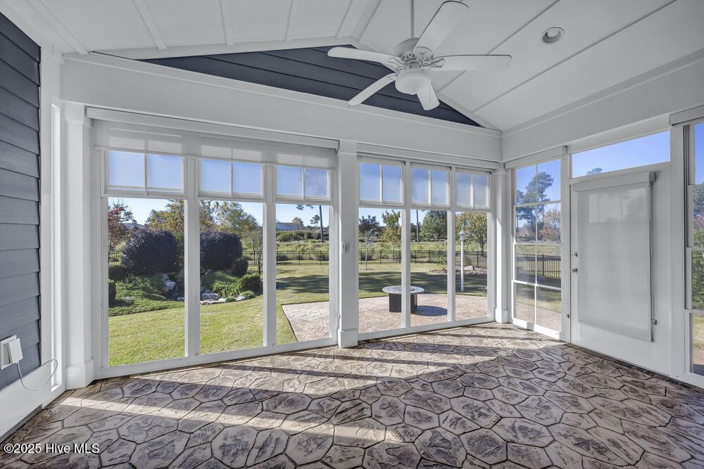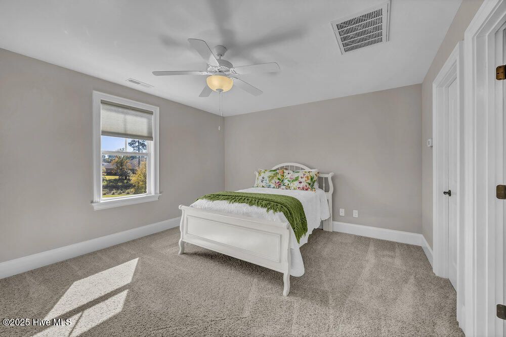 Exceptional curb appeal defines this beautifully designed coastal home, perfectly situated on a quiet cul-de-sac overlooking a tranquil pond. The generous .51-acre lot provides ample space for a future pool addition. Inside, the home exudes casual elegance with an open floor plan ideal for both everyday living and entertaining. The formal dining room sets the stage for special gatherings, while the dream kitchen offers a gas cooktop, upgraded stainless appliance package, wine cooler, decorative vent hood, under-sink water filtration, abundant cabinetry, breakfast bar island, and large pantry. Refrigerator remains. The spacious living room features a gas log fireplace with crisp white built-ins, surround sound, and a lovely coffered ceiling. The desirable split-bedroom layout includes a luxurious primary suite with tray ceiling, heated bath flooring, large walk-in tile shower, and oversized custom closet with laundry room pass-through. Two additional main-level bedrooms share a well-appointed full bath. Upstairs offers a private guest suite with full bath and a large bonus room perfect for a family den, home office, or workout space. Additional features include walk-in attic storage, drop zone, and spacious laundry room with sink and washer/dryer remaining. Enjoy the three-season enclosed porch with volume decorative ceiling, or step outside to the stamped concrete patio with retractable awning, gas hookup, and fenced backyard featuring a tranquil fountain. The oversized side-entry garage includes a 240-volt EV hookup and RV hookup for temporary charging. Energy-efficient upgrades include a tankless water heater and solar panels. Located in a vibrant community with sidewalks, walking trails, pool, pickleball courts, dog park, and gathering parks that host frequent social events. Numerous clubs and activities foster a welcoming atmosphere, and for additional fees, residents may explore the prestigious Cape Fear National Golf Club. Dining, and shopping close by