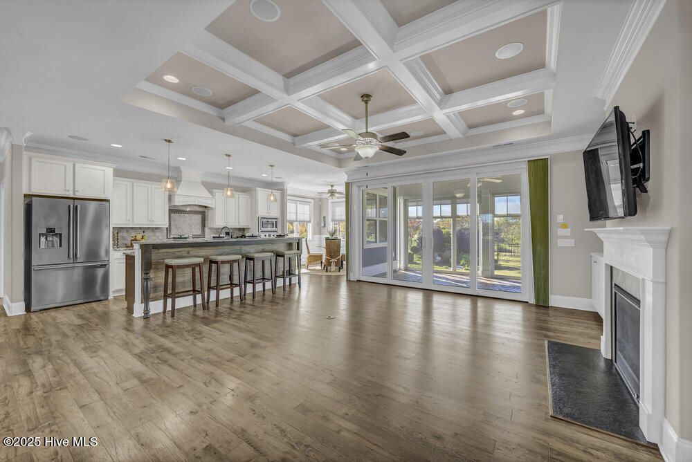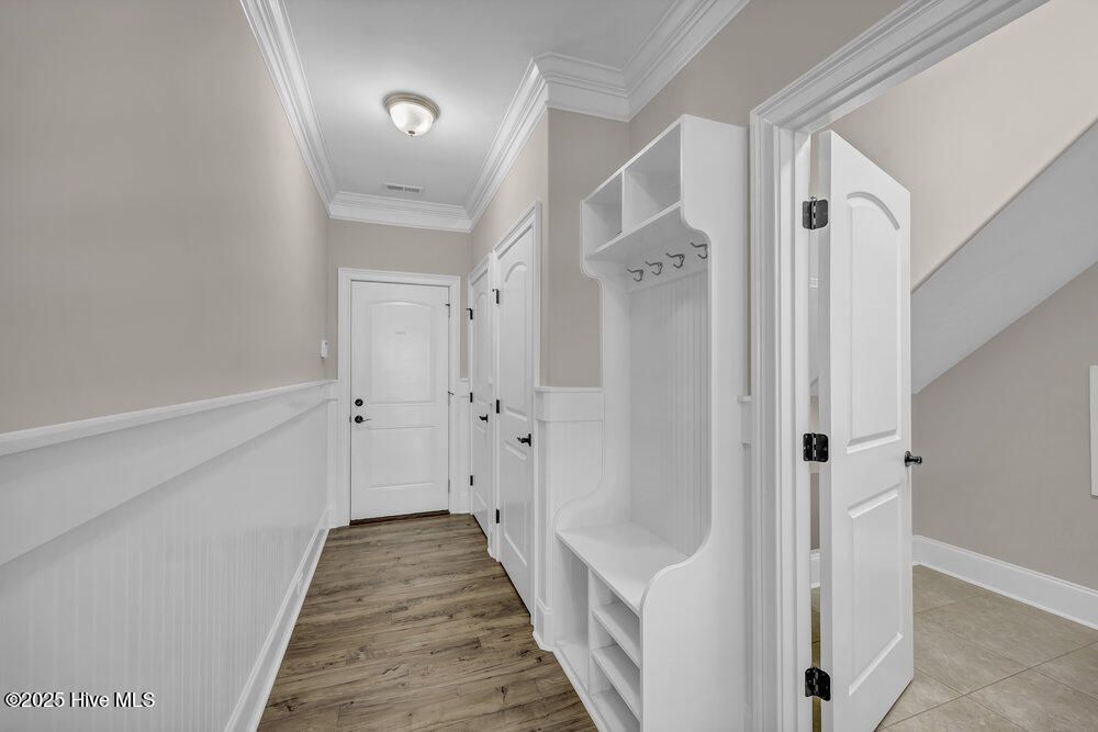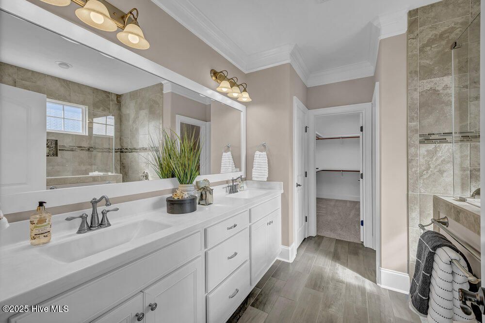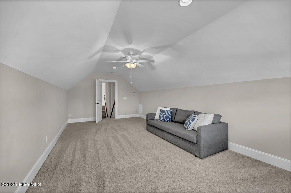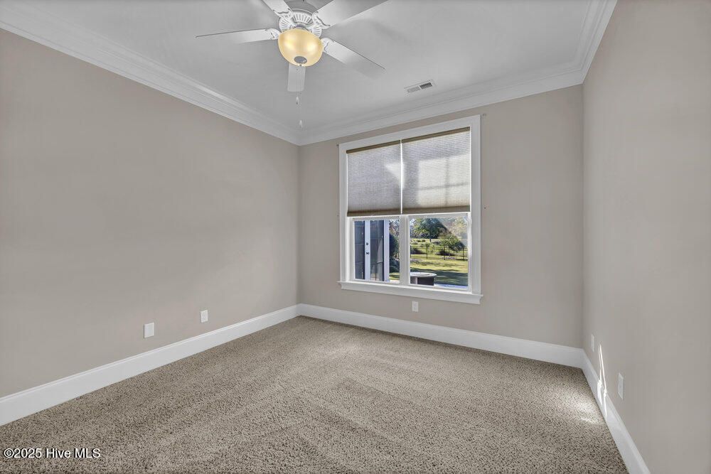 Exceptional curb appeal defines this beautifully designed coastal home, perfectly situated on a quiet cul-de-sac overlooking a tranquil pond. The generous .51-acre lot provides ample space for a future pool addition. Inside, the home exudes casual elegance with an open floor plan ideal for both everyday living and entertaining. The formal dining room sets the stage for special gatherings, while the dream kitchen offers a gas cooktop, upgraded stainless appliance package, wine cooler, decorative vent hood, under-sink water filtration, abundant cabinetry, breakfast bar island, and large pantry. Refrigerator remains. The spacious living room features a gas log fireplace with crisp white built-ins, surround sound, and a lovely coffered ceiling. The desirable split-bedroom layout includes a luxurious primary suite with tray ceiling, heated bath flooring, large walk-in tile shower, and oversized custom closet with laundry room pass-through. Two additional main-level bedrooms share a well-appointed full bath. Upstairs offers a private guest suite with full bath and a large bonus room perfect for a family den, home office, or workout space. Additional features include walk-in attic storage, drop zone, and spacious laundry room with sink and washer/dryer remaining. Enjoy the three-season enclosed porch with volume decorative ceiling, or step outside to the stamped concrete patio with retractable awning, gas hookup, and fenced backyard featuring a tranquil fountain. The oversized side-entry garage includes a 240-volt EV hookup and RV hookup for temporary charging. Energy-efficient upgrades include a tankless water heater and solar panels. Located in a vibrant community with sidewalks, walking trails, pool, pickleball courts, dog park, and gathering parks that host frequent social events. Numerous clubs and activities foster a welcoming atmosphere, and for additional fees, residents may explore the prestigious Cape Fear National Golf Club. Dining, and shopping close by