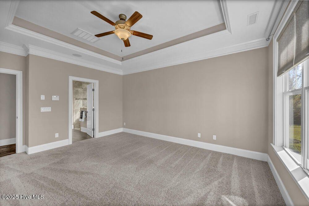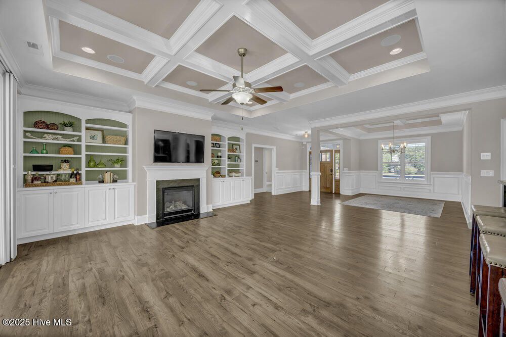 - Master Downstairs, Walk-In Closet(s), Tray Ceiling(s), High Ceilings, Entrance Foyer, Mud Room, Bookcases, Kitchen Island, Ceiling Fan(s), Pantry, Walk-In Shower, Blinds