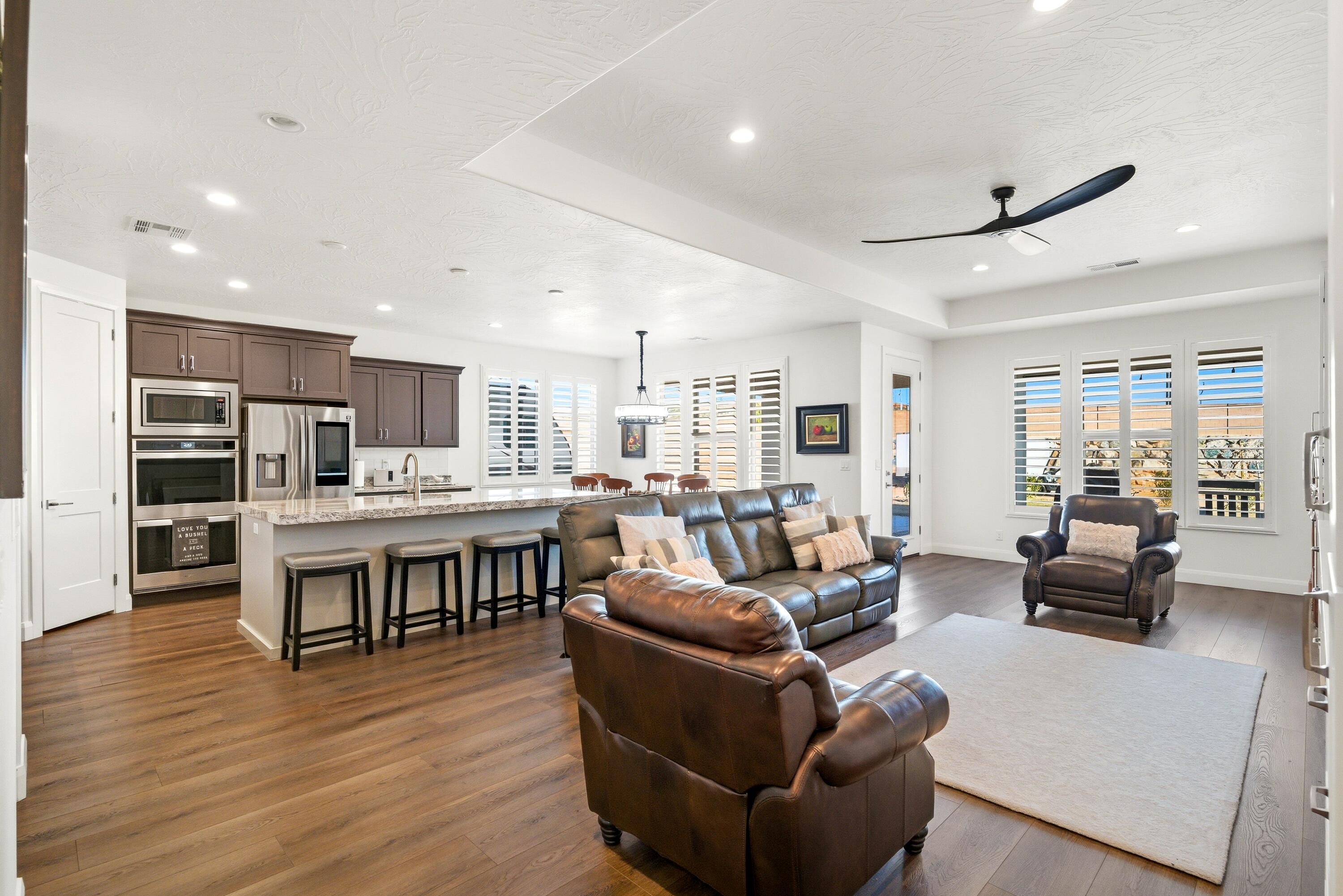 Built in 2022, this highly upgraded Onyx floor plan sits on a premier .38-acre Estate lot in Brio with no neighbors behind. Located in the Estates section of the community, the home offers 3 bedrooms, 2.5 baths, and a 3-car garage with added electrical, utility sink, and epoxy floors. Interior upgrades include a gourmet kitchen with granite counters, double wall ovens, upgraded cabinetry with soft-close drawers, premium laminate flooring, tiled shower surrounds with frameless glass, plantation shutters, and upgraded doors and hardware. The fully block-walled backyard features an extended concrete patio, grass area, and large unfinished space with room for RV parking, storage, or future improvements. Brio offers resort-style amenities and the iconic Southern Utah lifestyle.