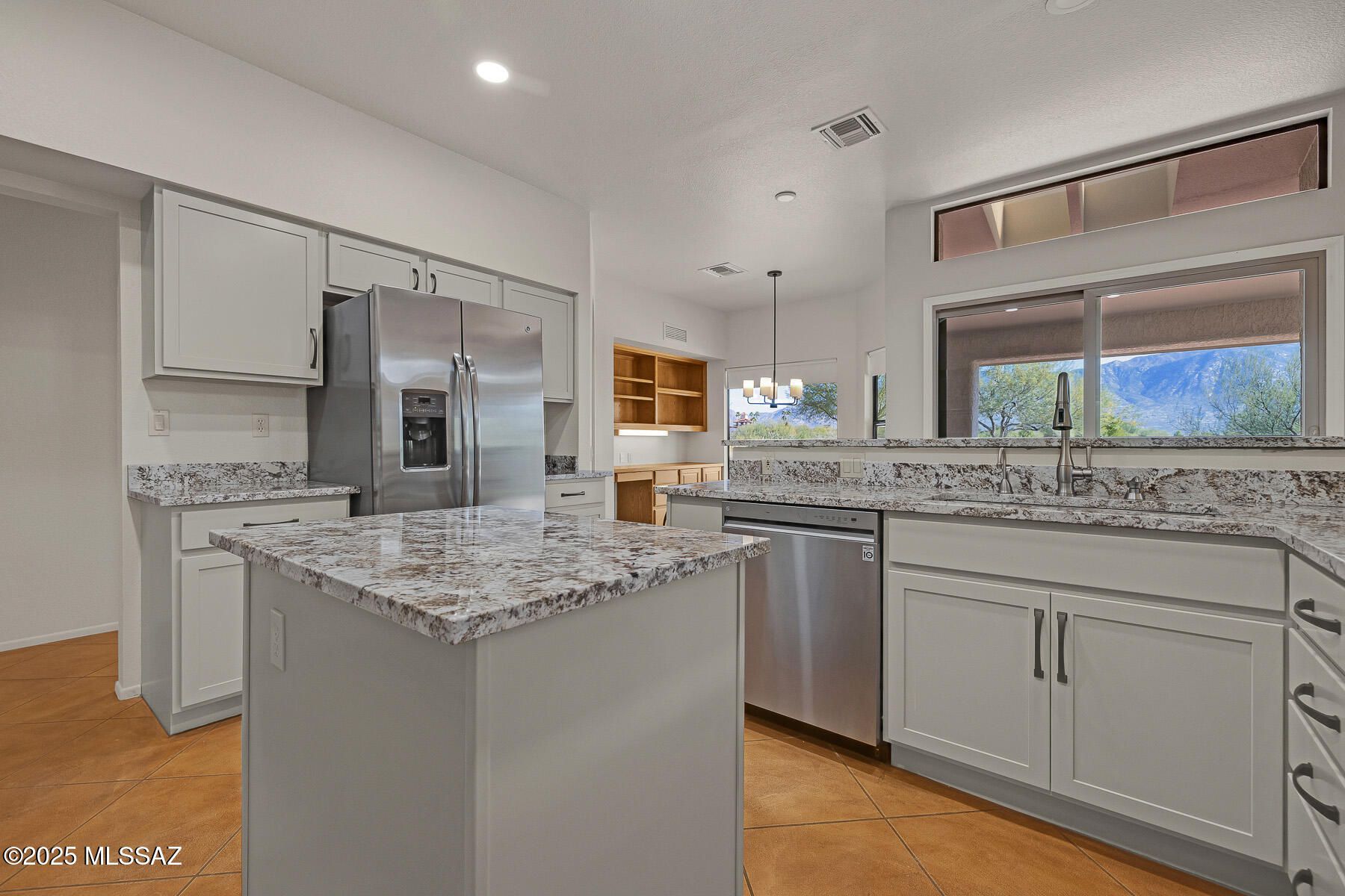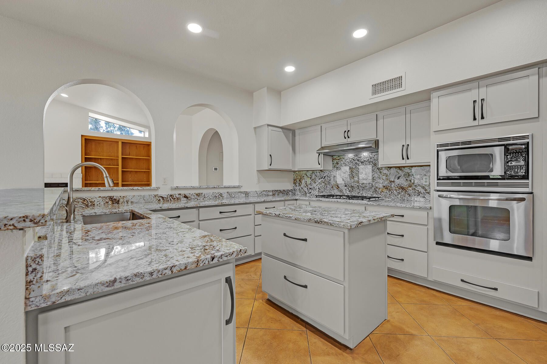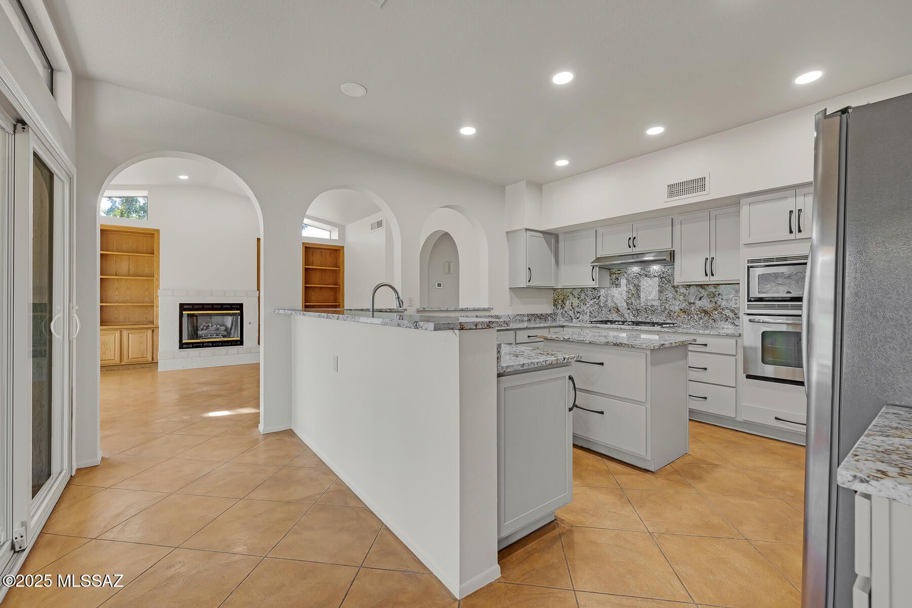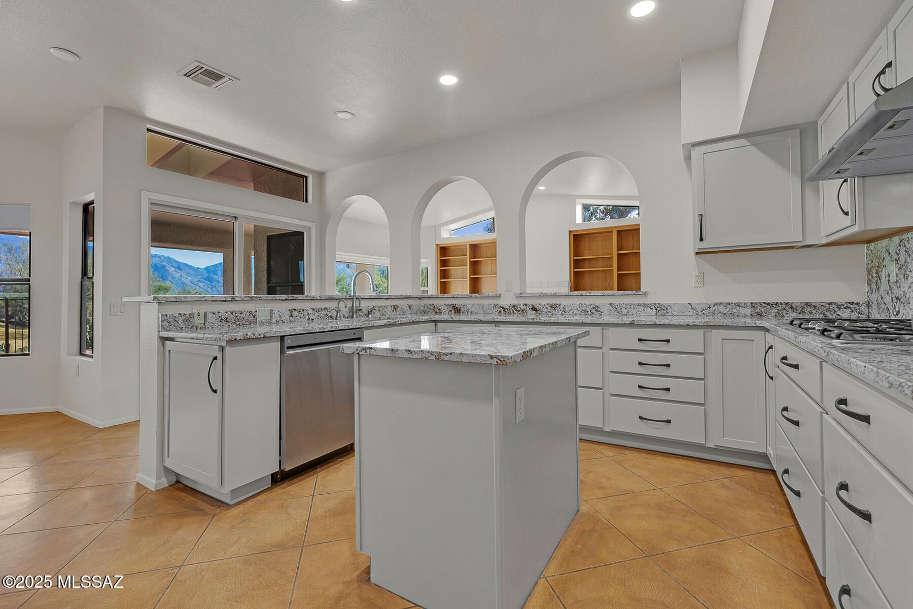 Enjoy an active adult lifestyle in this 3BD/2BA +Den (2,328 sq ft) updated Breckenridge model on large view lot offering spectacular golf course and Catalina mountain views from inside & out. Soaring ceilings greet you in the expansive formal living/dining room with tall arched window and plantation shutters. Adjacent lies a den/office with wraparound bookshelves and desk. Relax in the spacious Great room with built-in bookshelves and cozy gas fireplace. Gourmet kitchen hosts center island, updated countertops and new cabinets, stainless appliances with gas cooktop & wall ovens, plus dining nook with workstation. Owner's suite with bay window offers a dual sink vanity, walk-in shower and step-in jetted tub, plus large walk-in closet. Main guest room features arched window. Additional