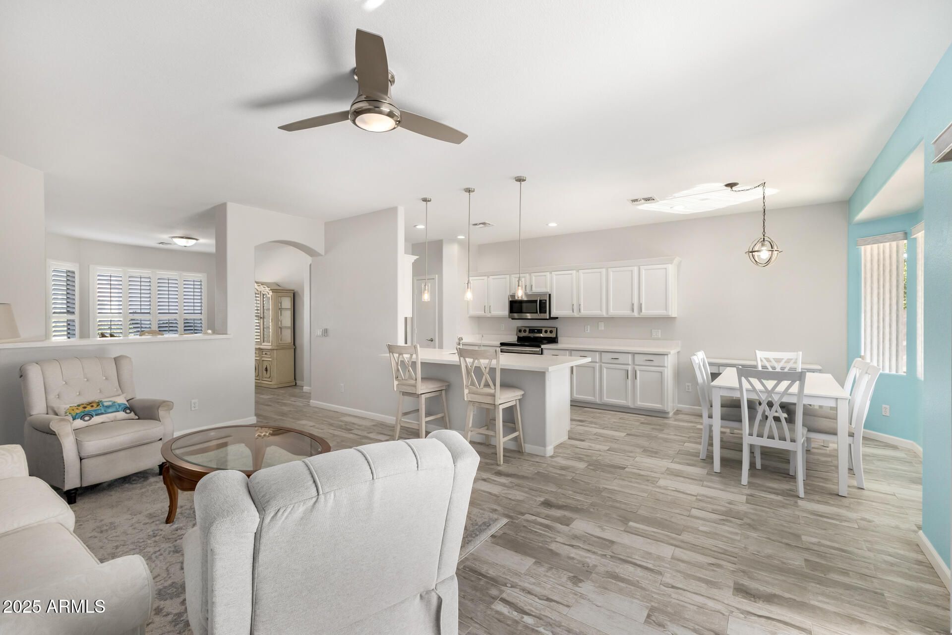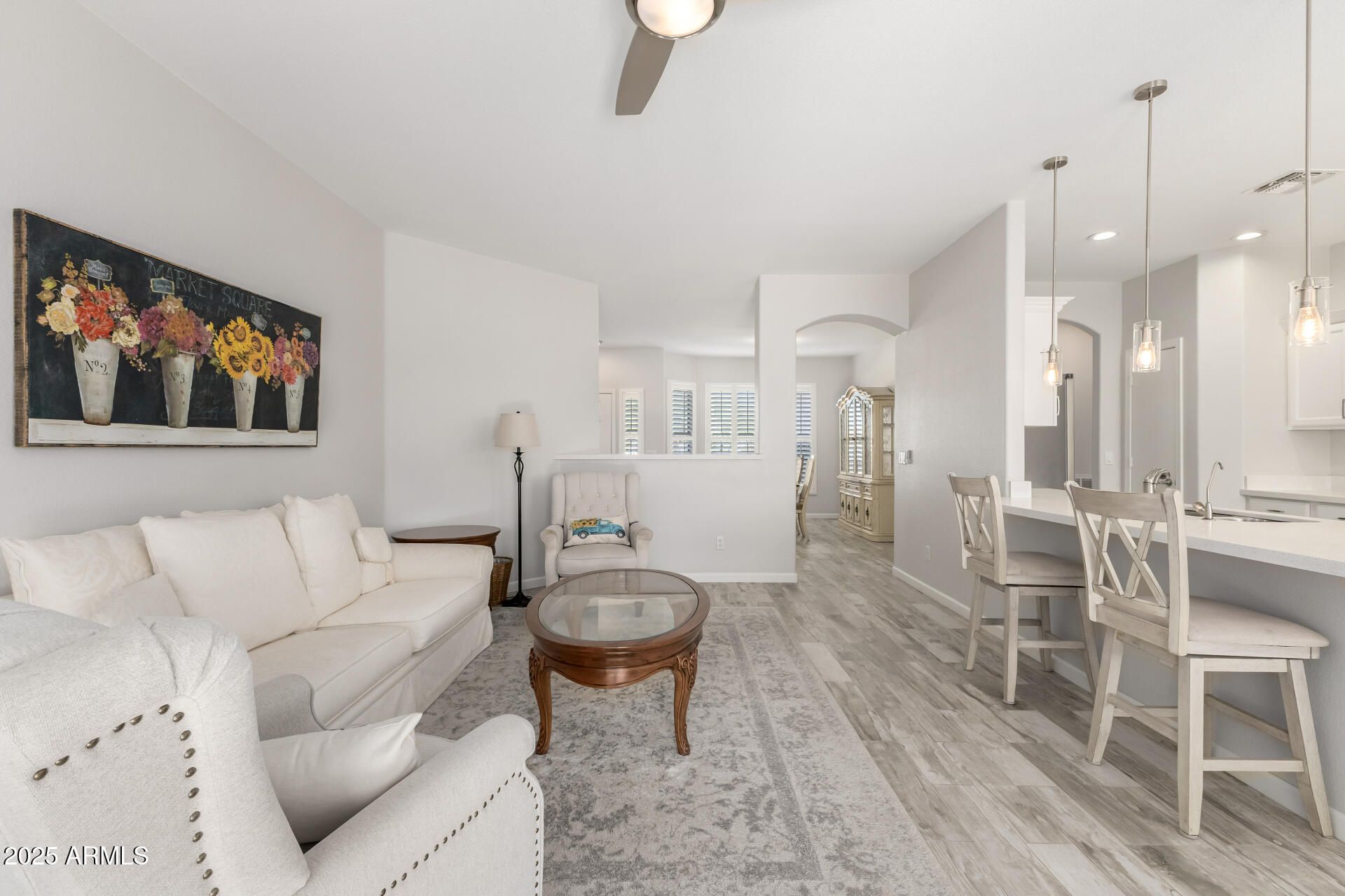 Find your ideal retirement home in the 55+ guard-gated Springfield! Sits on a large corner lot, offering 3 beds, 2 baths, 2-CG, & a low-care desert landscape. The fabulous interior showcases tons of natural light, plantation shutters, wood-look tile flooring in common areas, and soft carpet in bedrooms. You'll love the formal living & dining rooms, along with an inviting family room that opens to the spotless kitchen w/ updated cabinets w/ pull outs, SS appliances, quartz counters, ample white cabinetry, a pantry, recessed & pendant lights, a breakfast bar, and a cozy nook w/bay window make up the culinary space. The main bedroom also has a bay window and an ensuite with dual quartz sinks & a custom walk-in closet. PLUS! Attached to the laundry room is a bonus room with plenty of cabinets If you want to relax or have a fun gathering, the backyard awaits! A mature tree & an extended flagstone-covered patio complete the picture. Take advantage of the resort-style Community amenities such as an 18-hole golf course, sparkling pool & spa, and a beautifully updated clubhouse. Residents enjoy fitness facilities, pickleball & tennis courts, and a full calendar of social activities. Don't miss this great opportunity!