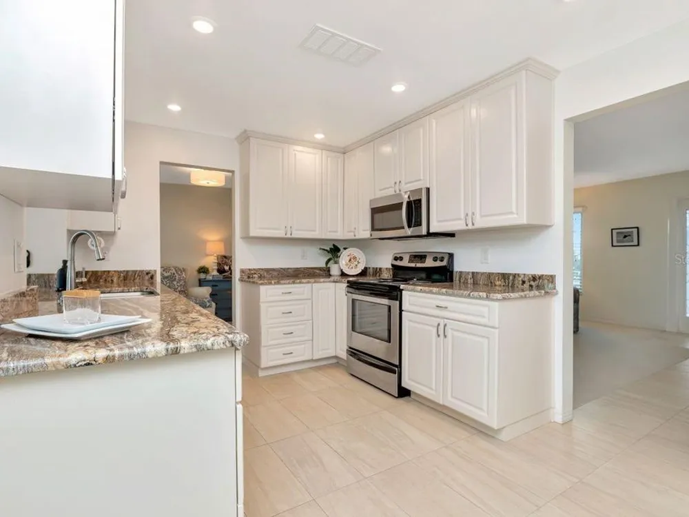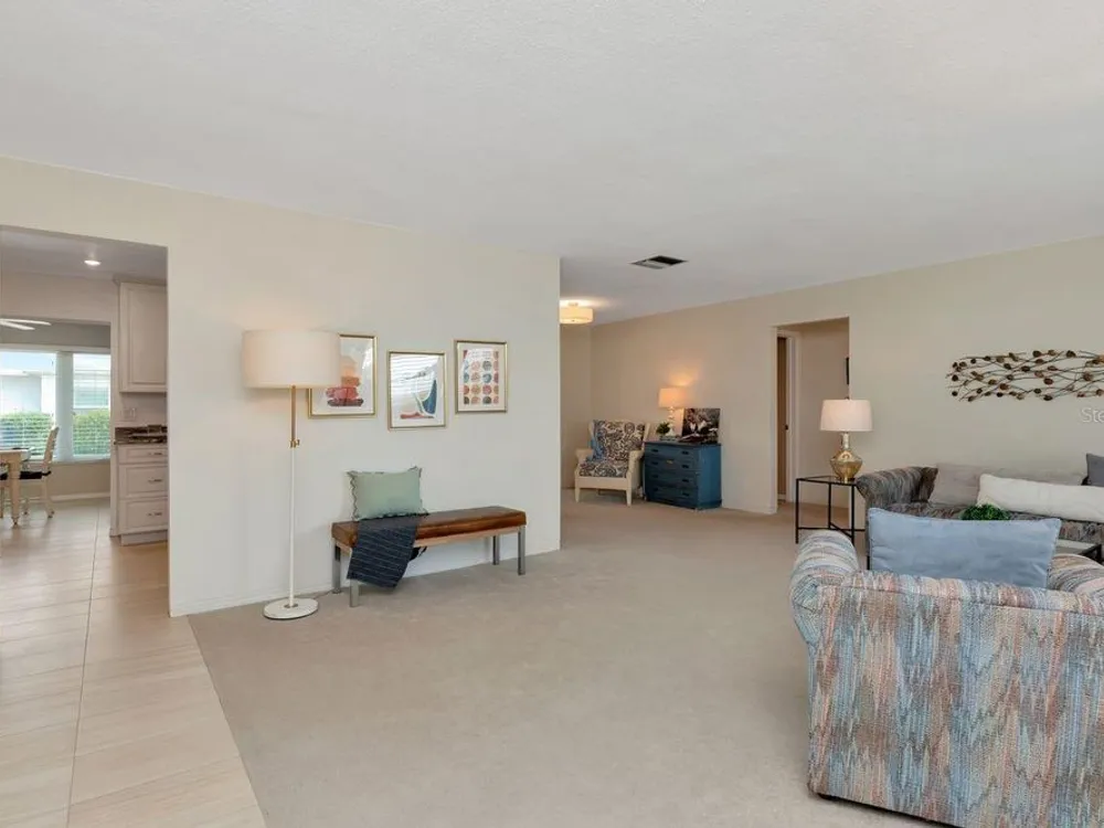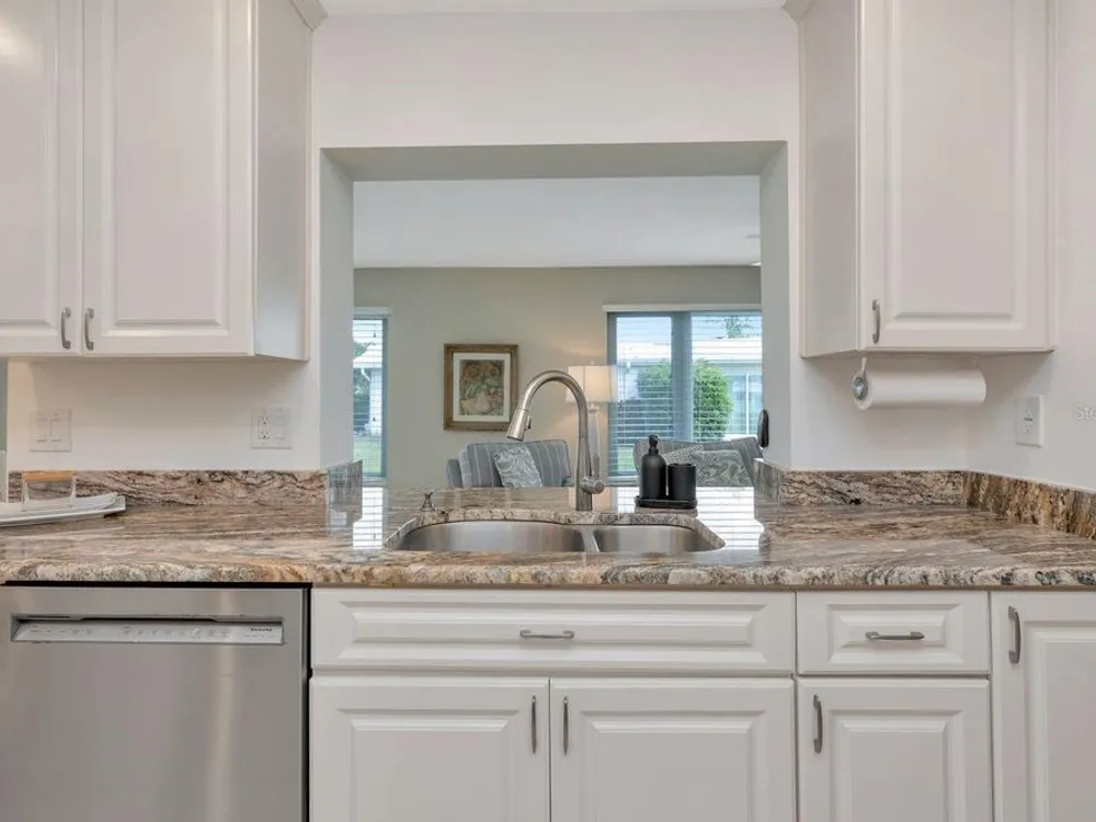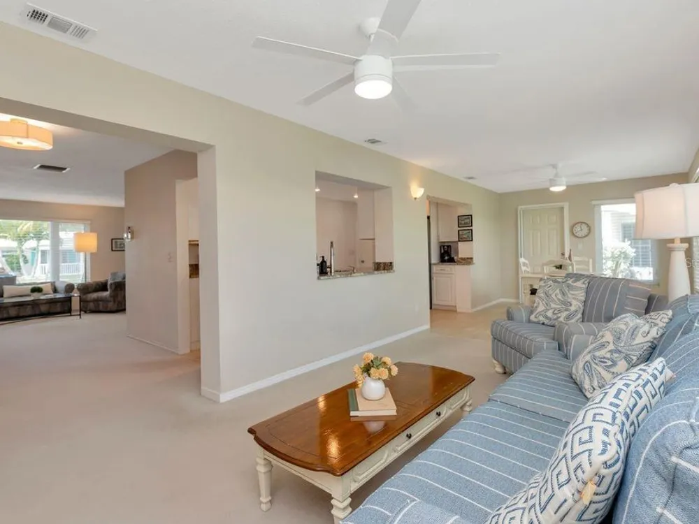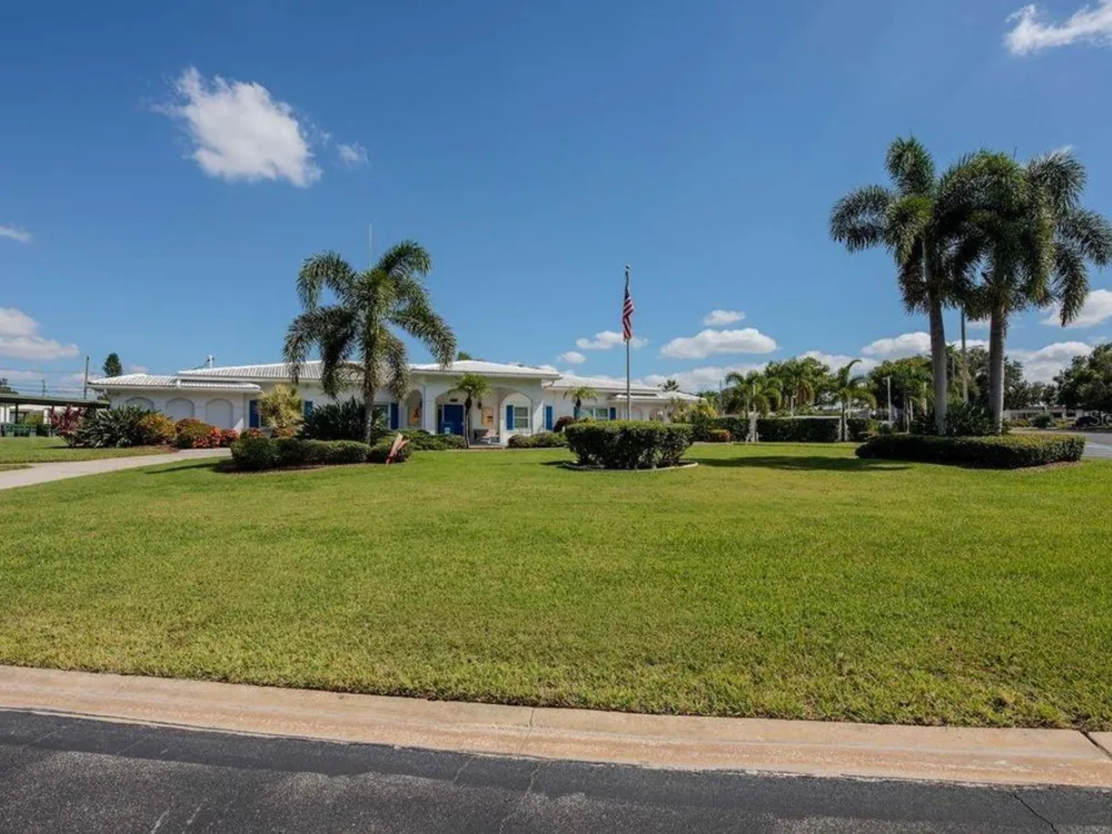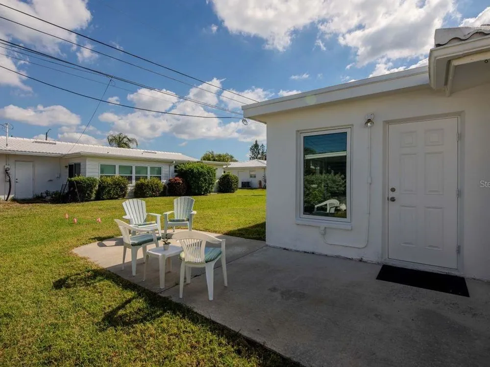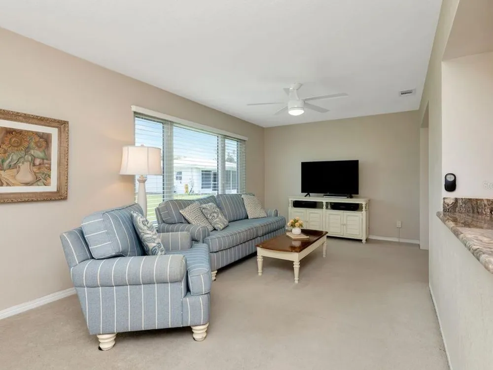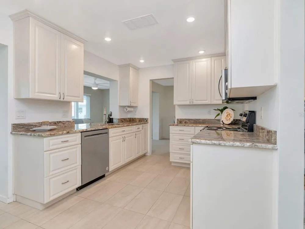 Located in the desirable 55+ community of Tamarac on the Gulf, this spacious two-bedroom, two-bath “Skipper” model home is filled with natural light and offers multiple gathering areas inside and out. The large living room features a beautiful picture window overlooking the front porch, while the adjoining dining area—perfect for use as a study—blends sunlight from both the front living room and the rear sunroom for a warm, inviting feel. The updated kitchen showcases newer cabinetry with soft-close doors and pull-out drawers, slab granite countertops, stainless steel appliances, tile flooring, recessed lighting, and an opening to the sunroom with additional dining and family space. The oversized primary suite includes a walk-in closet and an upgraded bath with a shower bench. The vintage-style hallway bath provides convenient access to the living areas and guest bedroom. Additional upgrades include IMPACT vinyl windows and doors, a widened driveway for extra parking, and a paver front porch. Community amenities feature a pool, shuffleboard courts, and a clubhouse with scheduled activities. The low $240 monthly HOA fee covers lawn mowing, pool maintenance, exterior painting every nine years, roof pressure cleaning, private road upkeep, clubhouse maintenance, trash, sewer, and water. Conveniently located near shopping, restaurants, and the beach—this is Florida living at its best!