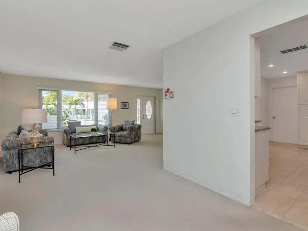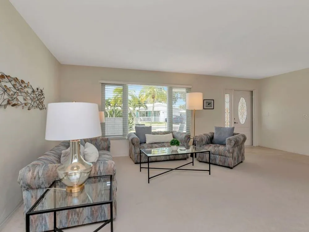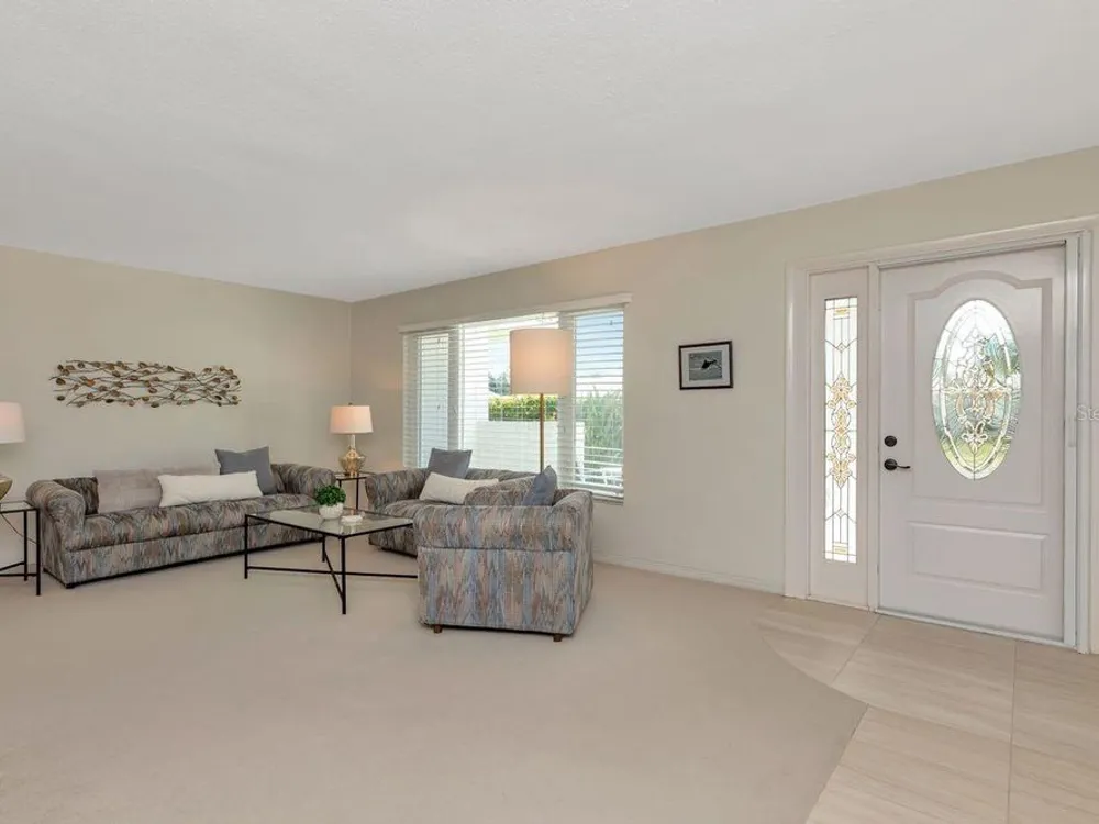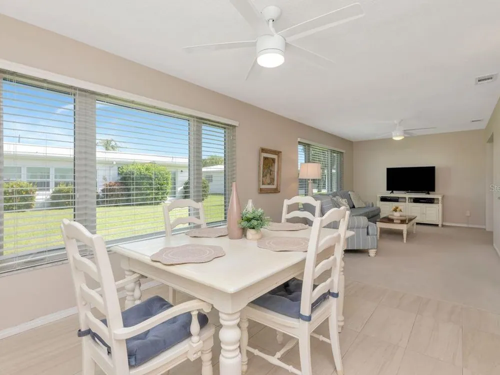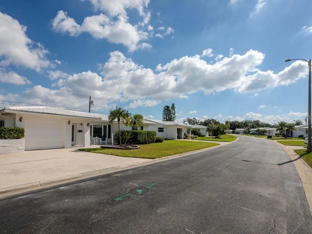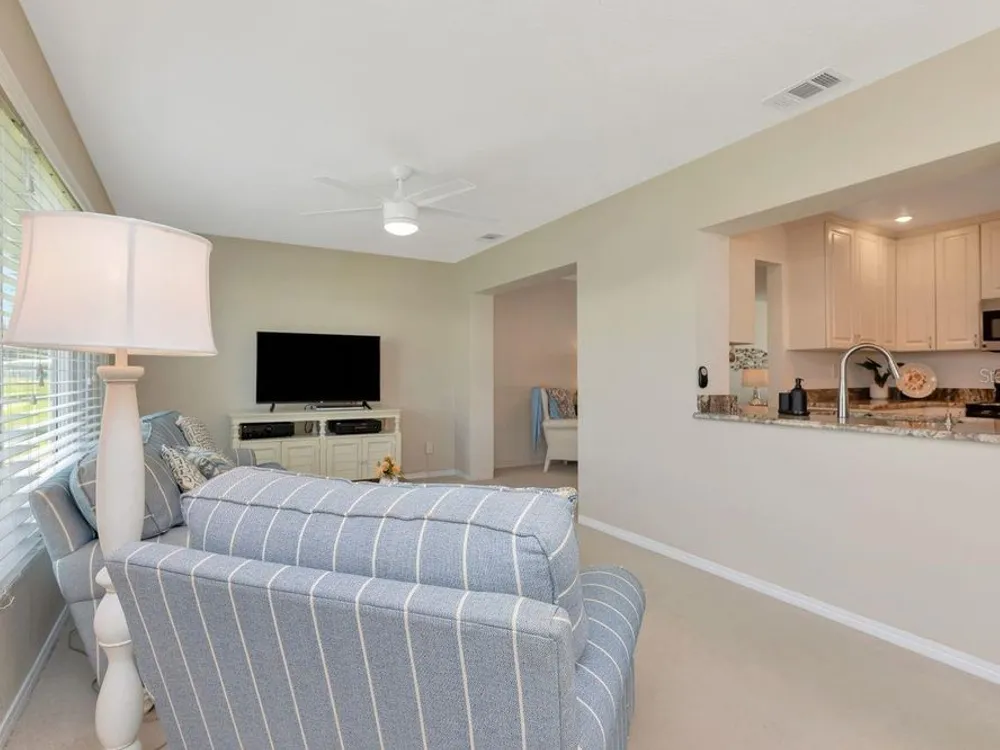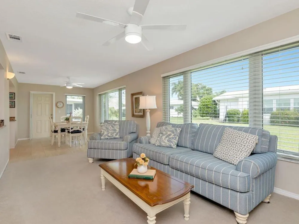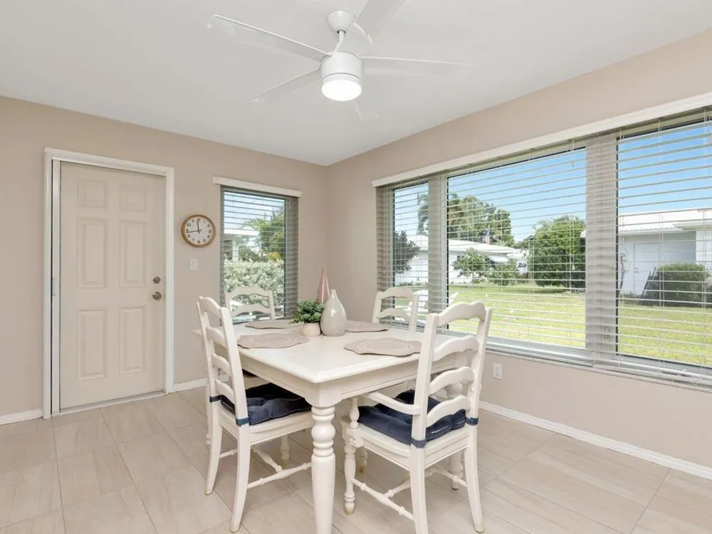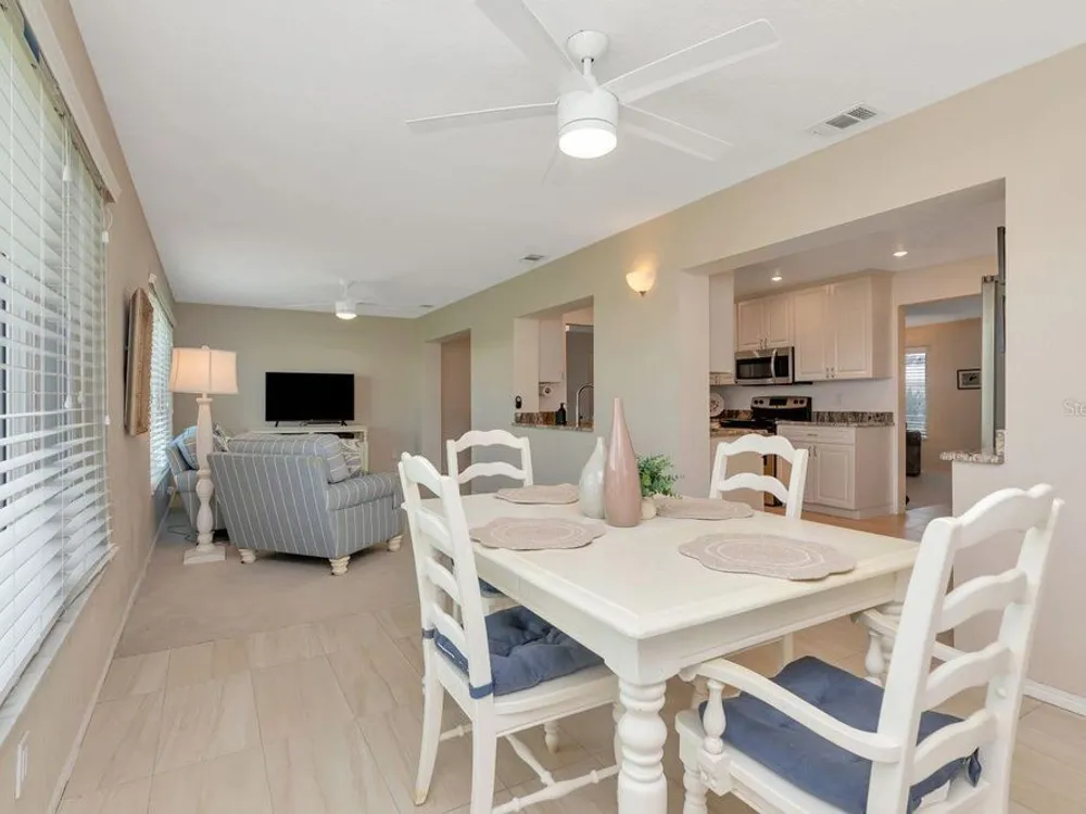 Located in the desirable 55+ community of Tamarac on the Gulf, this spacious two-bedroom, two-bath “Skipper” model home is filled with natural light and offers multiple gathering areas inside and out. The large living room features a beautiful picture window overlooking the front porch, while the adjoining dining area—perfect for use as a study—blends sunlight from both the front living room and the rear sunroom for a warm, inviting feel. The updated kitchen showcases newer cabinetry with soft-close doors and pull-out drawers, slab granite countertops, stainless steel appliances, tile flooring, recessed lighting, and an opening to the sunroom with additional dining and family space. The oversized primary suite includes a walk-in closet and an upgraded bath with a shower bench. The vintage-style hallway bath provides convenient access to the living areas and guest bedroom. Additional upgrades include IMPACT vinyl windows and doors, a widened driveway for extra parking, and a paver front porch. Community amenities feature a pool, shuffleboard courts, and a clubhouse with scheduled activities. The low $240 monthly HOA fee covers lawn mowing, pool maintenance, exterior painting every nine years, roof pressure cleaning, private road upkeep, clubhouse maintenance, trash, sewer, and water. Conveniently located near shopping, restaurants, and the beach—this is Florida living at its best!