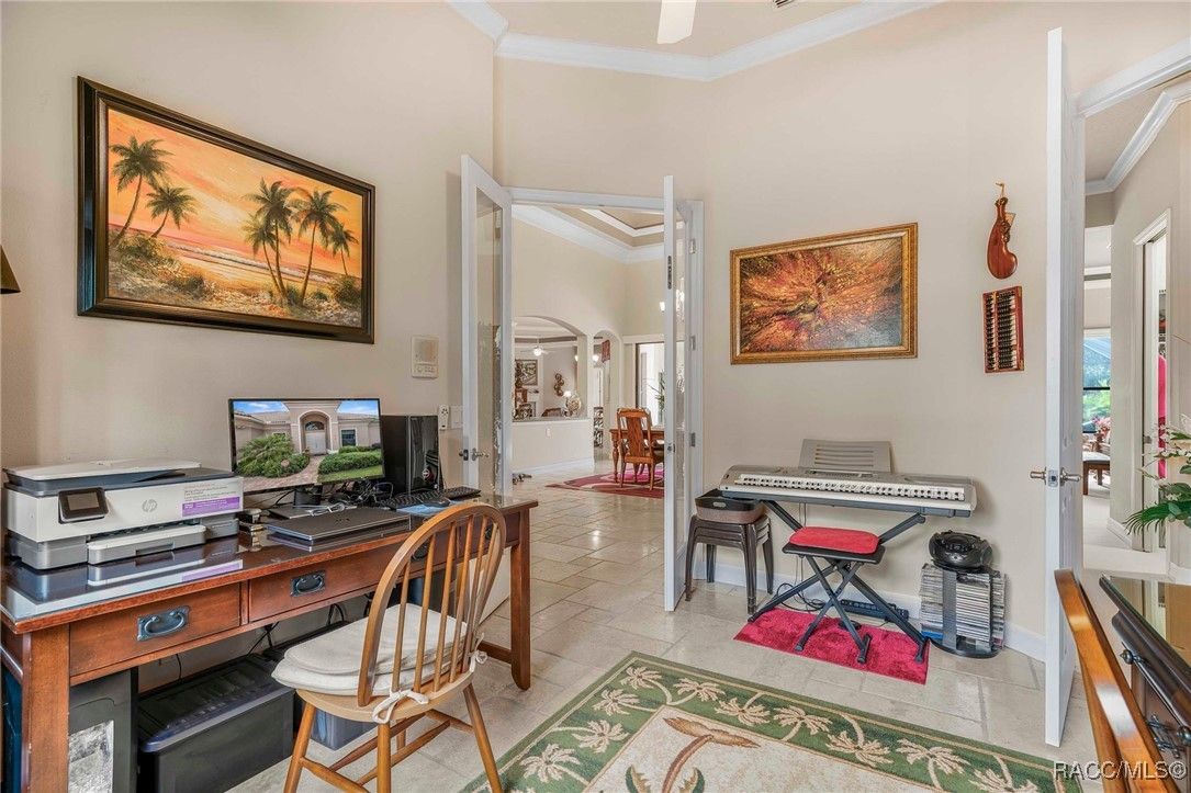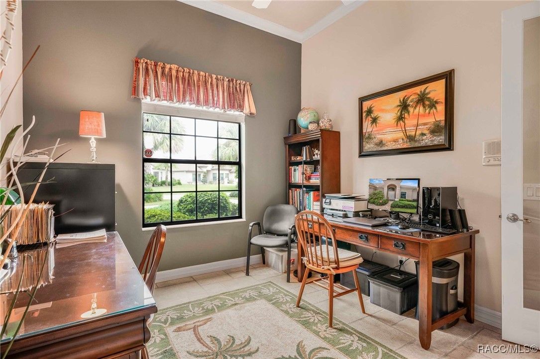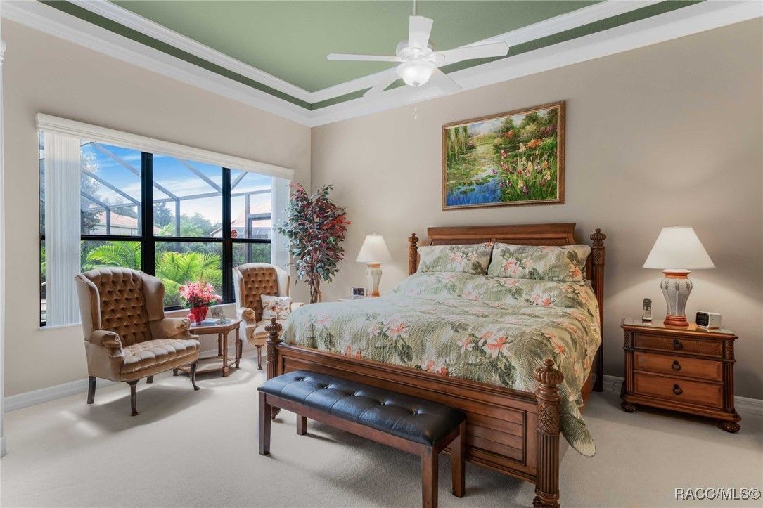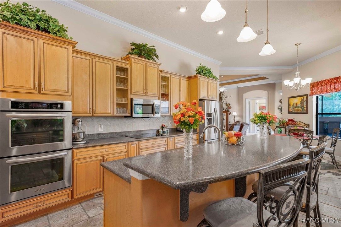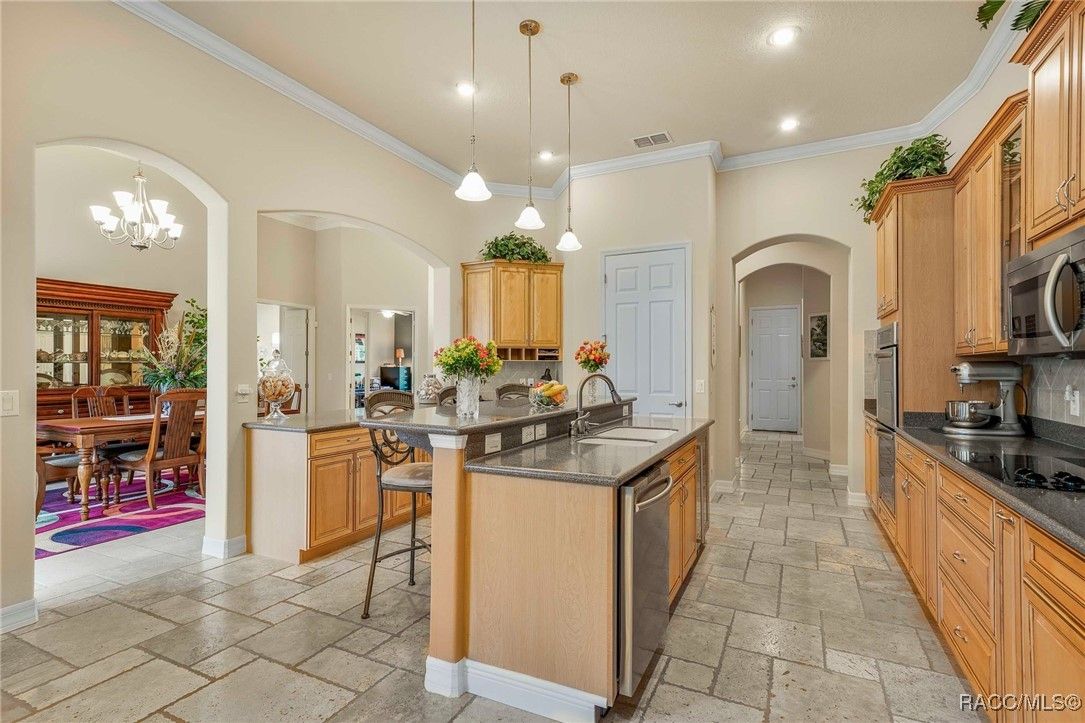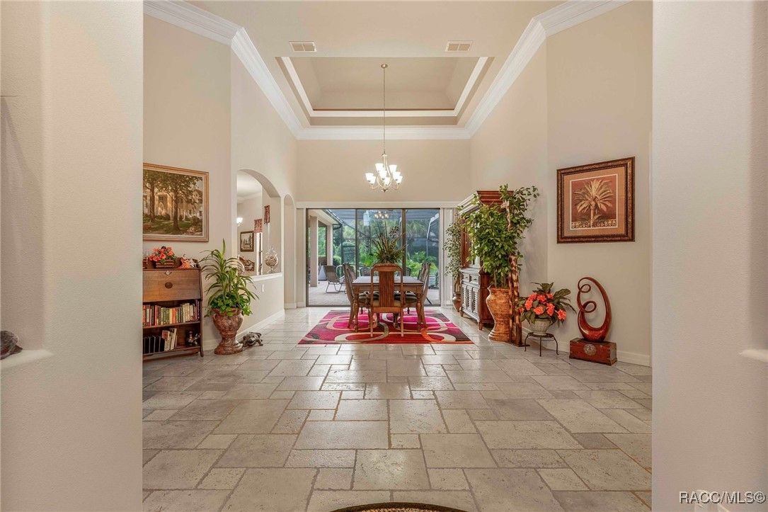 Welcome to resort-style living in Terra Vista, one of the nation's premier lifestyle communities! This impressive 5-bedroom, plus 2 den/flex room, 3,465 sq. ft. home sits on a beautifully landscaped half-acre lot and offers exceptional indoor and outdoor living. Step inside to find elegant details including crown molding, tray ceilings, imported travertine flooring, and a spacious floor plan with living, dining, family, office, and a chef's kitchen featuring glazed maple cabinets, stainless steel appliances, bar seating, breakfast nook, and double self-cleaning ovens. The primary suite boasts dual walk-in closets and a luxurious bath. Outdoor living shines with a 1,734 sq. ft. screened lanai designed for entertaining, with paver flooring, outdoor kitchen connections, and a stunning 24x14 gas-heated, self-cleaning pool with waterfall and benches. Additional highlights include a 2.5-car epoxy-finished garage with a large paver driveway, natural gas utilities (tankless water heater, dryer, grill, pool heater, fireplace), central vacuum, intercom, security system, and abundant storage throughout. Terra Vista residents enjoy world-class amenities, including golf, fitness centers, dining, and social clubs-all just minutes from shopping, medical, and outdoor adventures in "Mother Nature's Playground." Convenient to Tampa airport (1hr), Orlando airport (1.5 hrs), and the Gulf. Experience luxury, convenience, and small-town charm all in one.