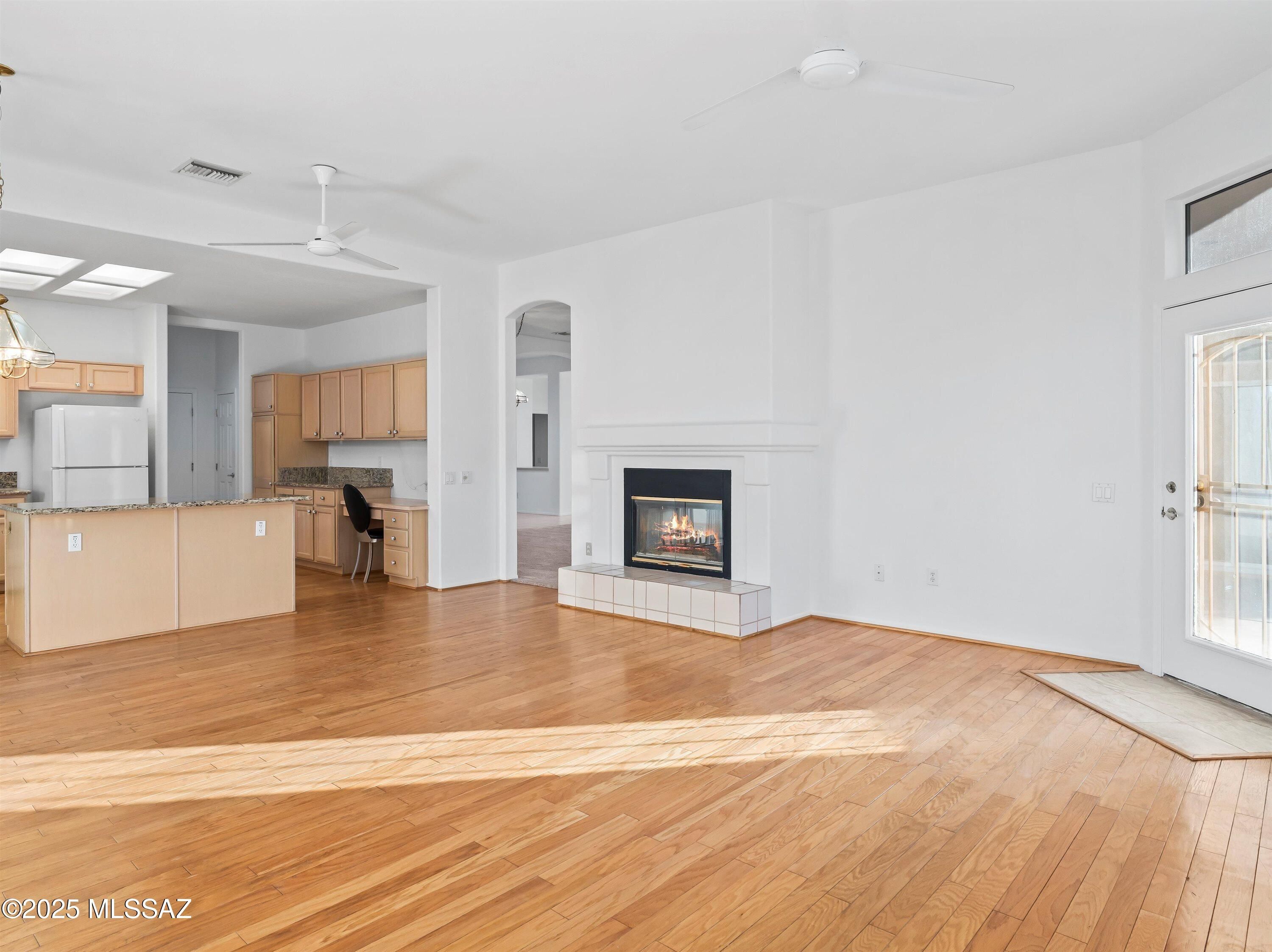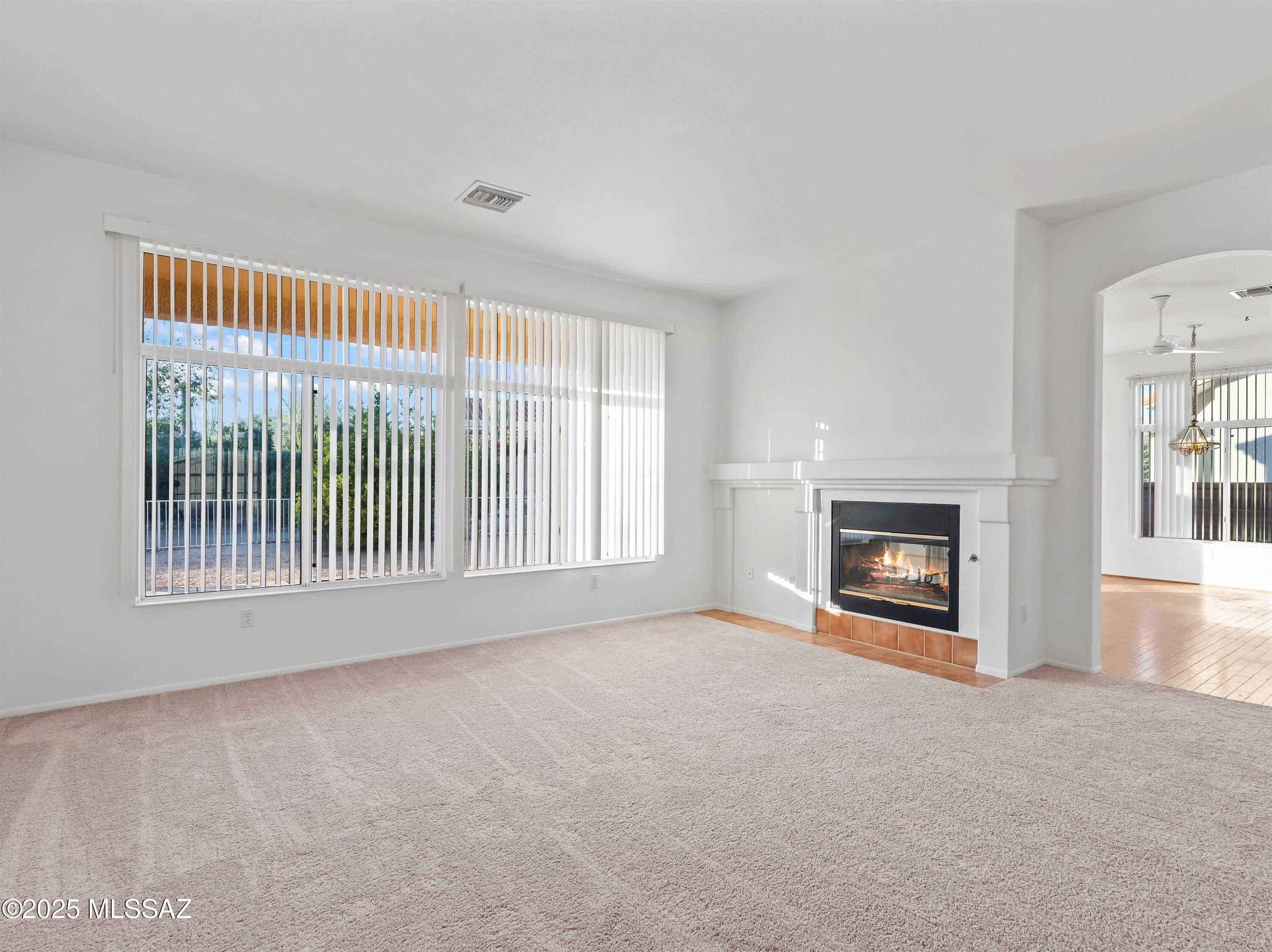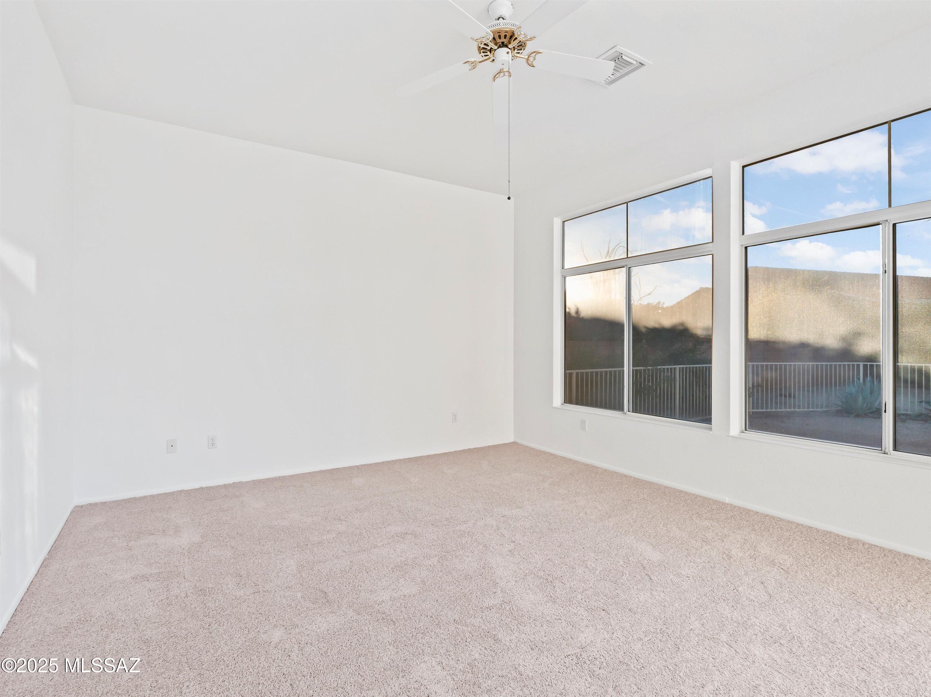 Enjoy this spacious 2-bed, 2.5 bath, 2,630 sqft Vistoso model with two primary suites and an additional den/office in the desirable community of Sun City Oro Valley. The expanded garage features an additional golf cart bay and storage cabinets, while the fenced-in backyard has a variety of mature trees and lots of privacy. New carpet and interior paint throughout. A gas fireplace connects the living and family rooms, and the large kitchen has granite countertops and oak wood flooring. The primary suite has a sliding door to the backyard, a standing shower & soaking tub, along with a walk-in closet with built-in shelving. Spend time golfing with friends and relaxing by the pool at this 55+ community with outstanding amenities and incredible mountain views.