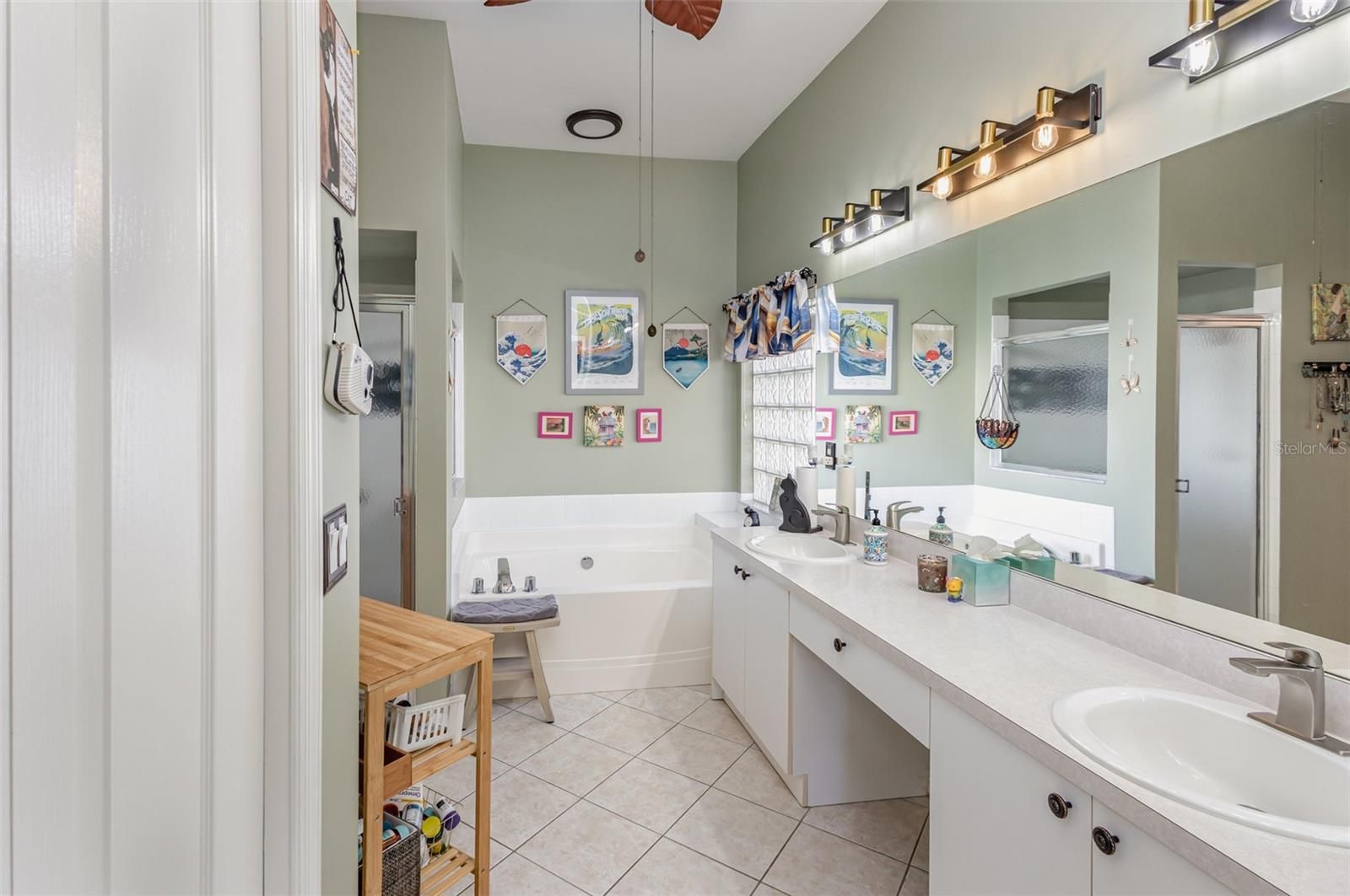 - Ceiling Fan(s), Crown Molding, Eat-in Kitchen, High Ceilings, Kitchen/Family Room Combo, Living/Dining Room, Open Floorplan, Main Level Primary, Solid Surface Counters, Split Bedrooms, Tray Ceiling(s), Walk-In Closet(s), Window Treatments