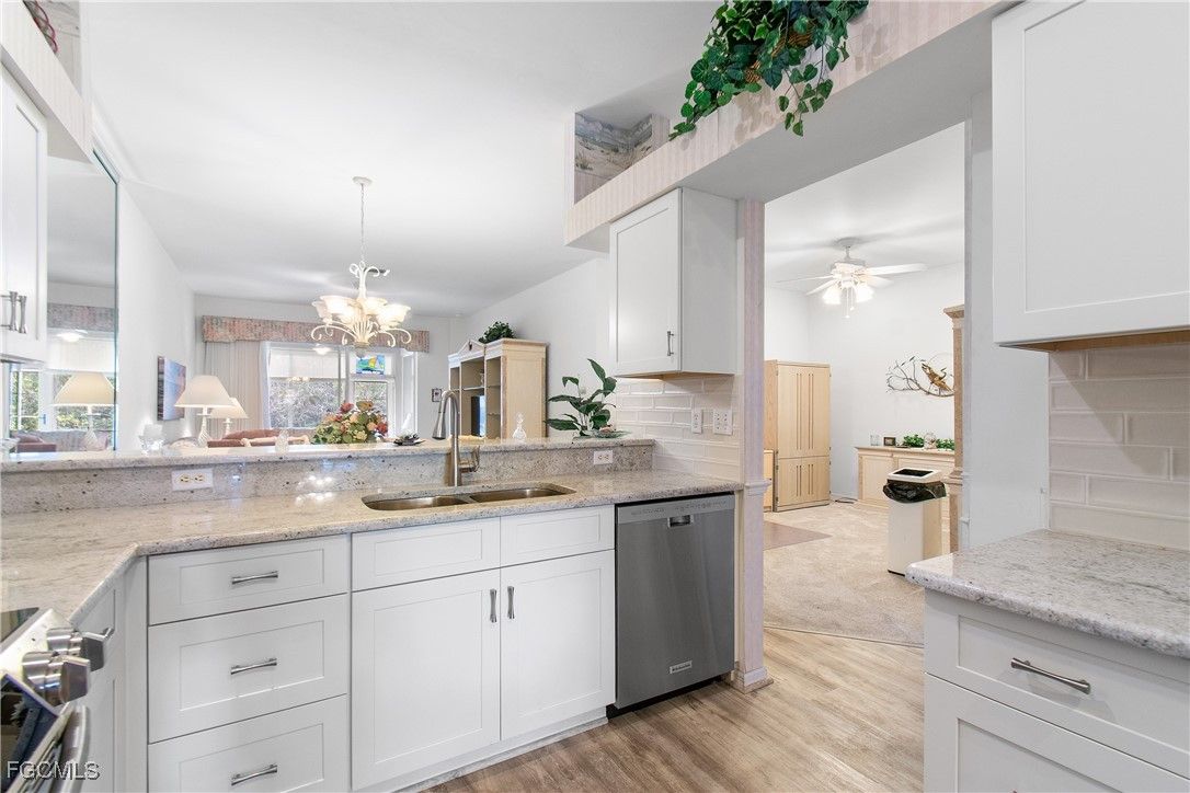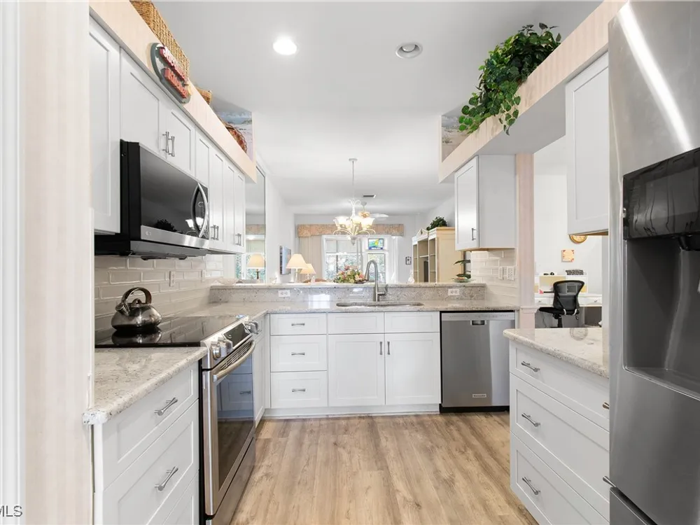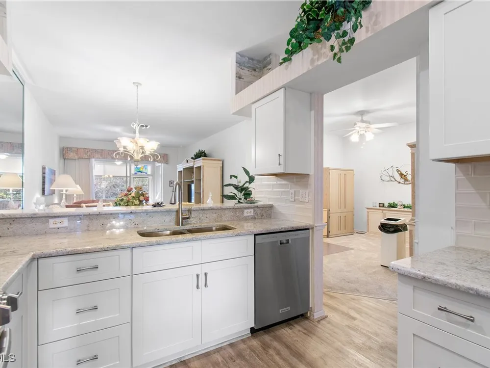 Why wait to enjoy the Florida lifestyle? This beautifully renovated TURNKEY villa is ready for you to move in—whether you're looking for a permanent residence or a vacation retreat! Nestled in the highly desirable 55+ community of Heritage Cove, this home is free from storm damage and offers the ideal combination of modern comfort and Florida charm. Inside, you'll find a spacious open floor plan with two bedrooms, a den, and two full bathrooms. The enclosed lanai at the back of the villa is complete with heat and air-conditioning, allowing you to enjoy the space all year long. It presents serene views of the water and lush trees, offering a peaceful retreat. The front entry is screened-in, giving you ample outdoor space to enjoy the Florida lifestyle. The kitchen is a chef’s delight with new cabinetry, all new stainless steel appliances and sink, granite countertops, and a chic new backsplash that adds the perfect touch of elegance. Other features include new luxury vinyl flooring, a new A/C unit in November of 2024, newer hot water heater, electric hurricane shutters, electric beds in the primary bedroom ($5K in value), and an attached one car garage. Heritage Cove provides an abundance of amenities, such as a resort-style pool and spa, a community center with fitness programs, and outdoor activities. Enjoy peace of mind with the gated entrance, and experience a vibrant, active lifestyle in a welcoming community. Best of all, it's just minutes from the beach and conveniently located near shopping, dining, entertainment, and so much more!