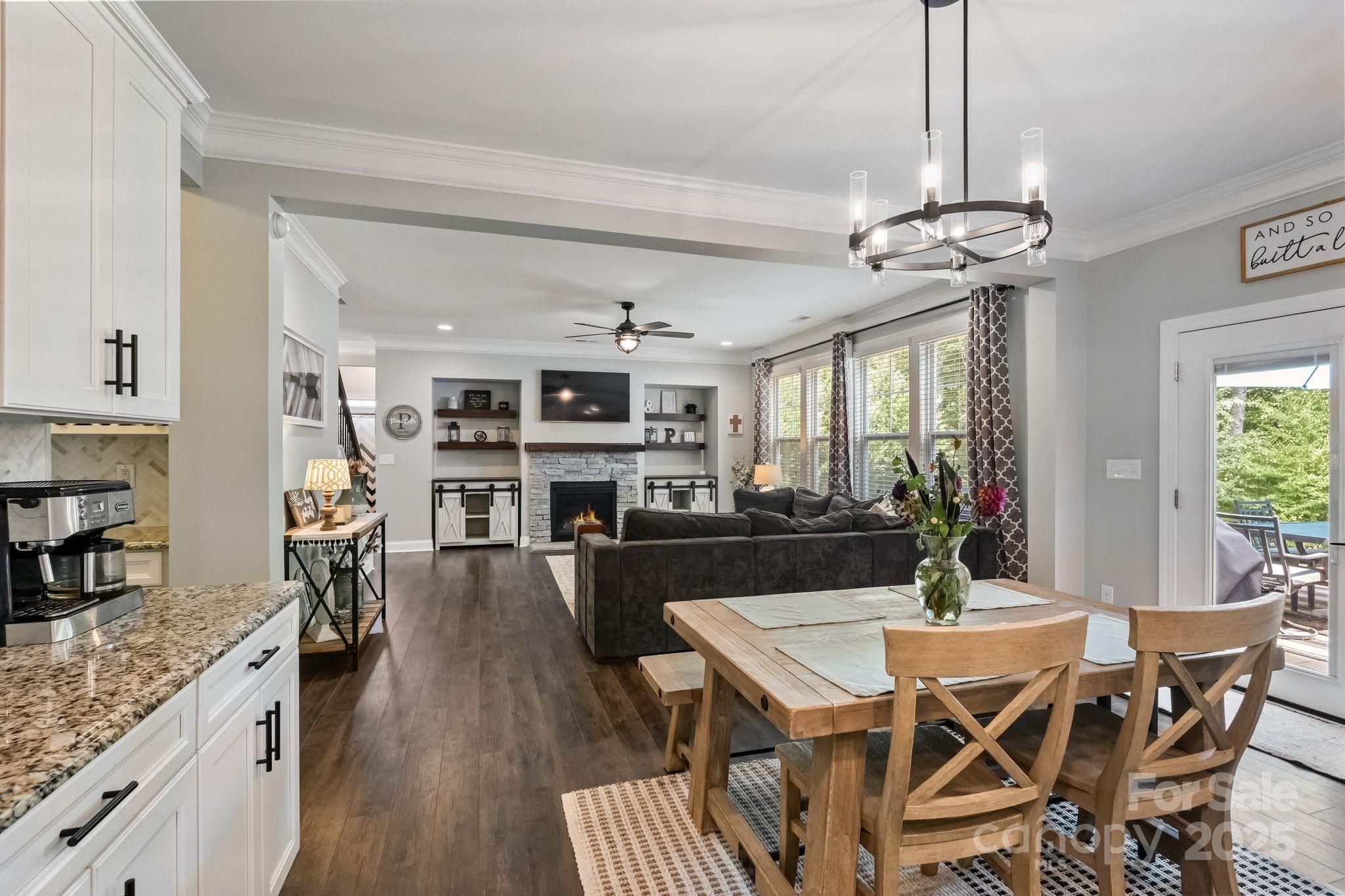 Discover this stunning waterfront community 6-bedroom, 4-bathroom residence offering both elegance and versatility with room for a pool! From the moment you step inside, the open floor plan welcomes you with seamless flow and exceptional detail. The chef’s kitchen is designed to impress, featuring double ovens, a gas cooktop, a generous walk-in pantry, freshly painted cabinetry with new hardware, a large island, and a striking new backsplash. Perfectly suited for entertaining, the home’s formal dining room showcases a coffered ceiling, while the family room is anchored by a fireplace with custom built-in shelving. The expansive primary suite provides a private retreat, complete with a spacious walk-in closet and garden tub. Upstairs you will find the primary bedroom, three additional bedrooms, and a large bonus room with closet that offers endless possibilities. A custom covered patio creates the ideal setting for outdoor living, overlooking the private wooded backyard. Thoughtfully updated throughout, this home has been professionally painted, complemented by all new carpet, luxury vinyl plank flooring, and new tile in the laundry room. French patio doors with built-in blinds replace the former slider, while designer light fixtures add elegance to the kitchen, living room, and loft. The exterior has been refreshed with painted shutters and a new front door finish, enhanced landscaping with new shrubs and long-lasting rubber mulch, and professional cleaning including gutter service and full power washing in May 2025. Set within a vibrant community, residents enjoy access to an inground pool, gazebo, playground, dog park, sidewalks, and paddle sport launch. Ideally located just minutes from Mooresville’s shops, dining, and quick access to I-77.