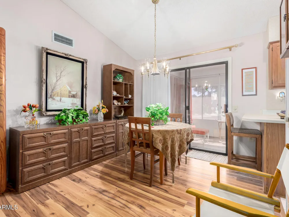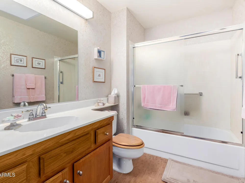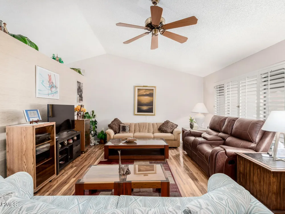 Say hello to your sunny new life in Sun City West! Original owners! Well-loved! This single-level stunner welcomes you with a 2-car garage and opens up to the vaulted ceiling, wood-look floors, and a living room made for cozy chats or quiet mornings. Whip up culinary creations in the kitchen with wood cabinets, breakfast bar, and eat-in kitchen. Two bedrooms and two baths. The primary retreat is your private getaway with a mirror-door closet, shutters. Laundry room doubles as a perfect mini-office, and the AZ room with its high ceilings is open and welcoming. Check outside to the private, covered patio, then enjoy community perks like spa days, pool dips, and fun times on the golf course. Conveniently located near dining options, freeways, and more! New AC 2025,