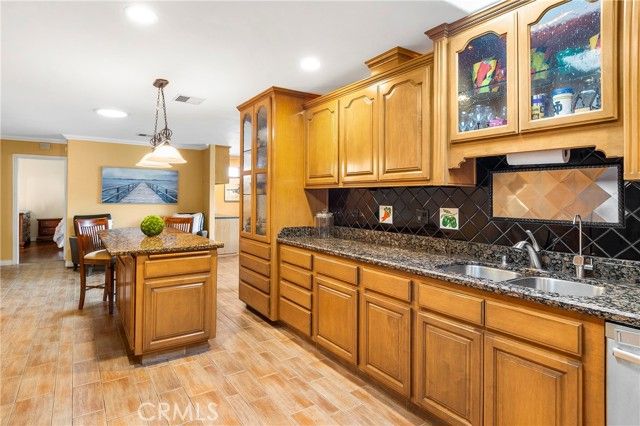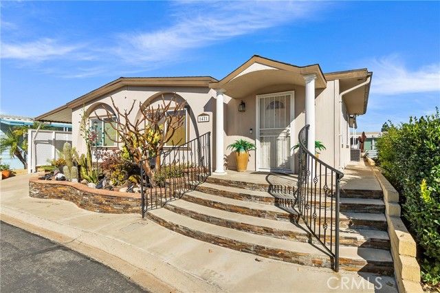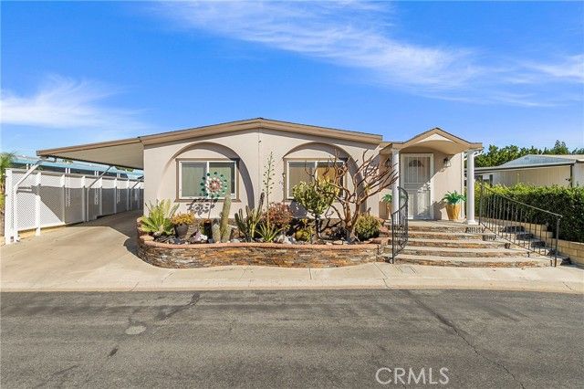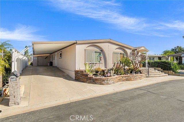 This is a golden opportunity to own one of the most desirable homes in one of Corona’s most convenient senior communities—and yes, you own the land. That’s right. This beautifully maintained, larger double-wide manufactured home on private land lives and feels like a traditional single-family residence, with space, flow, and thoughtful design throughout. Inside, the living room creates its own inviting vibe with a custom-built entertainment center, opening seamlessly to the formal dining area. Here, charming depression-glass–style window adds character and warmth—perfect for hosting memorable gatherings. The kitchen is a true showstopper, designed for hosting and gathering. A long granite island, abundant cabinetry, and granite countertops create both beauty and function. There’s even a cozy lounge-style seating area, making this the heart of the home where conversations linger and guests feel right at home. The spacious primary suite is a private retreat, featuring its own side deck—ideal for quiet morning coffee or peaceful yoga moments. The ensuite bathroom offers double sinks, a large soaking tub, and a walk-in shower with a safety handle, thoughtfully designed for comfort and ease. With three bedrooms and two bathrooms, there’s plenty of room for guests or hobbies. The second bathroom is a convenient bathroom, shared between a bedroom and the laundry area—perfect for visitors. An additional side space is currently used as an office but can easily flex as storage or a creative nook. The third bedroom is ideal for overnight company or a hobby room. Outside, you’ll find extra exterior storage and a covered carport for two vehicles, adding to the home’s practicality and ease. Located in the sought-after Village Grove Community, residents enjoy secure fob access, a sparkling pool and spa, clubhouse, recreation room, and gym/exercise room-everything you need for an active and social lifestyle. This isn’t just a home-it’s a lifestyle, a sense of ease, and a place where ownership truly matters. Come tour this special property and experience it for yourself!