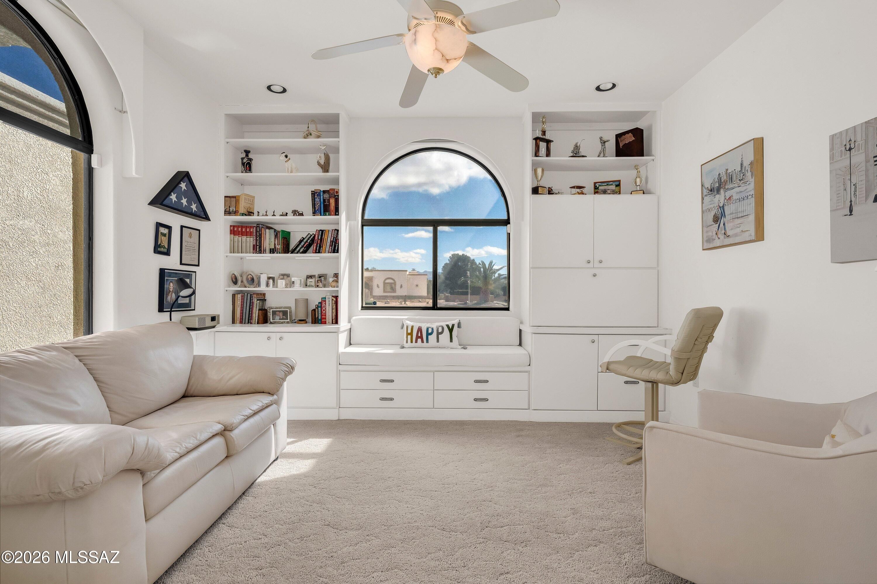 Experience true Green Valley living in Country Club Estates with this inviting 3BD/2BA home backing the award-winning Country Club of Green Valley. Relax and take in serene golf course on the private patio. An arched stained-glass entry welcomes you inside, where thoughtful design shines in the home. The living room create a bright, elegant space perfect for everyday comfort and entertaining, soaring ceilings, a cozy fireplace, & expansive golf course views. The home is filled with natural light. The private office is highlighted by gorgeous design blending function & timeless charm. Large master suite, features walk in closet, large tub, dual vanity & sliding door to patio/golf course views. Kitchen has sliding door to cozy sitting space. The 2car garage includes additional storage space